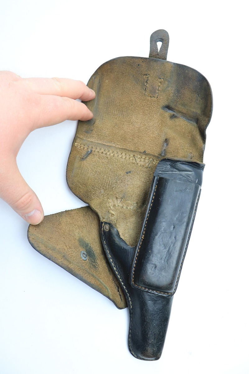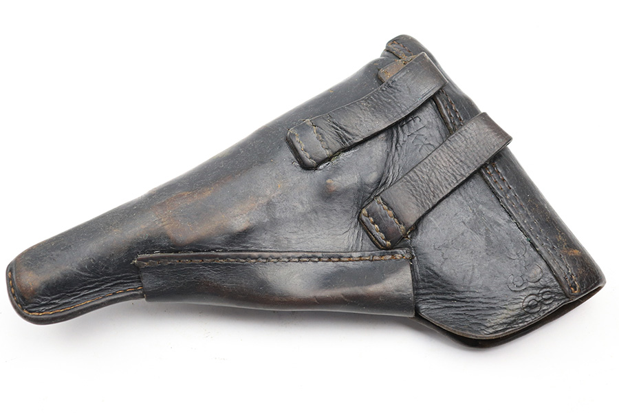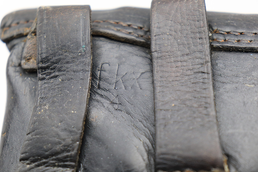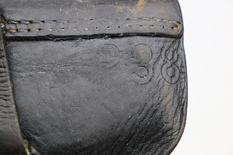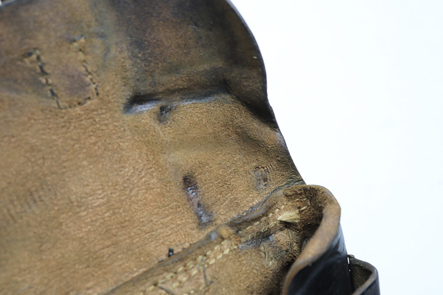 5/13/22 – This is a 1944 dated P.38 holster made towards the end of WW2. The holster is maker stamped with a somewhat unusual maker, “fkx” and dated 1944 with a “4” stamp. There’s also a P.38 stamp to the right of the belt loops. The leather shows signs of heavy previous use, but is still completely in tact. There’s surface wrinkling throughout and the leather is pliable. No notable stitching issues.