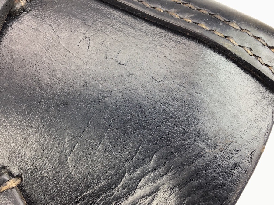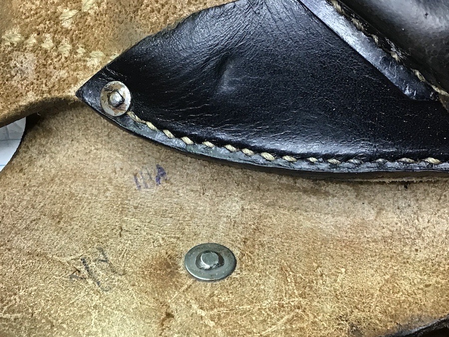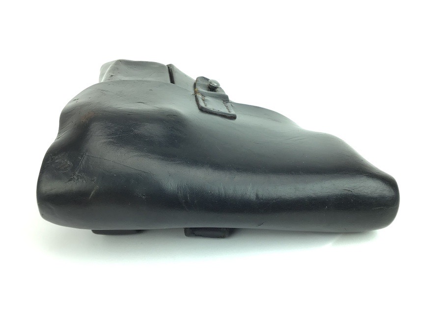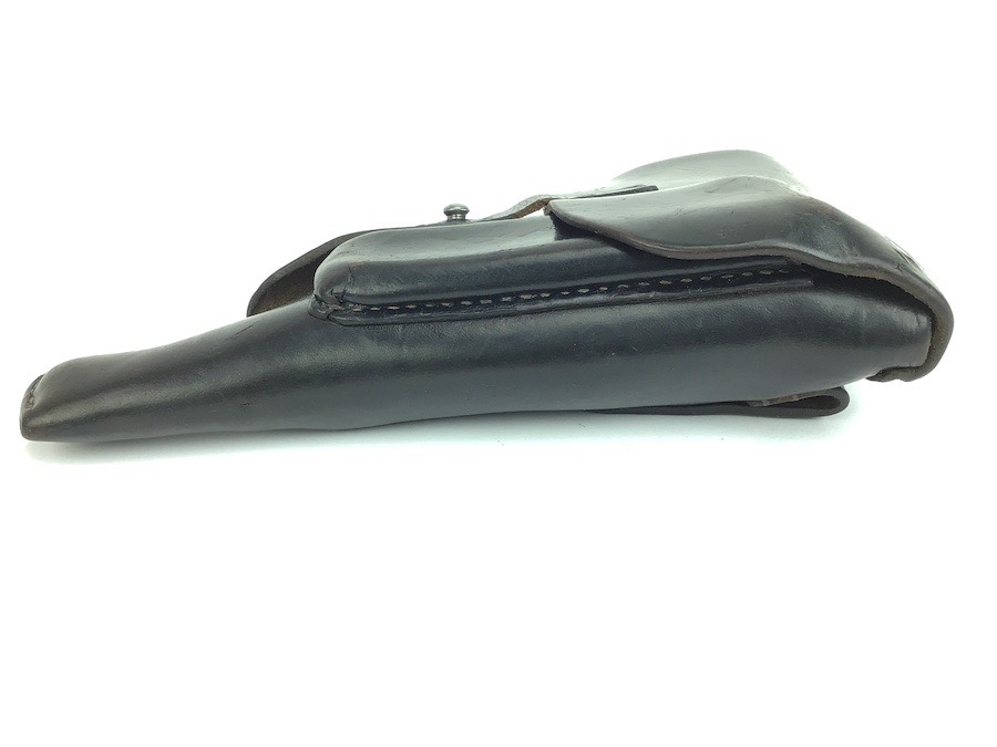 2/27/24 – Located in our Ohio office. This is a fairly unusual example of a late WW2 P.38 softshell style holster. The holster is unusual because the maker and interior ink stamps. Maker stamped on the rear with upper case “KQQ” and 1944 date. Most maker stamps are lower case. Faint but visible. Interior ink stamped with the numerals “382” along with other unriddle characters. The holster is in great condition with all original leather and stitching. The leather is soft and pliable and completely intact.