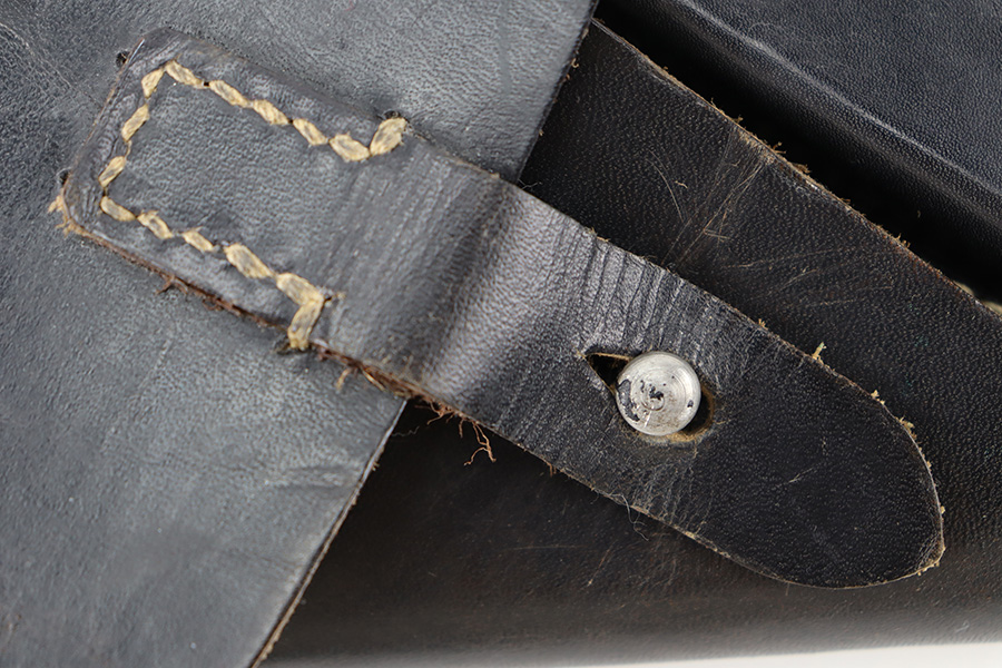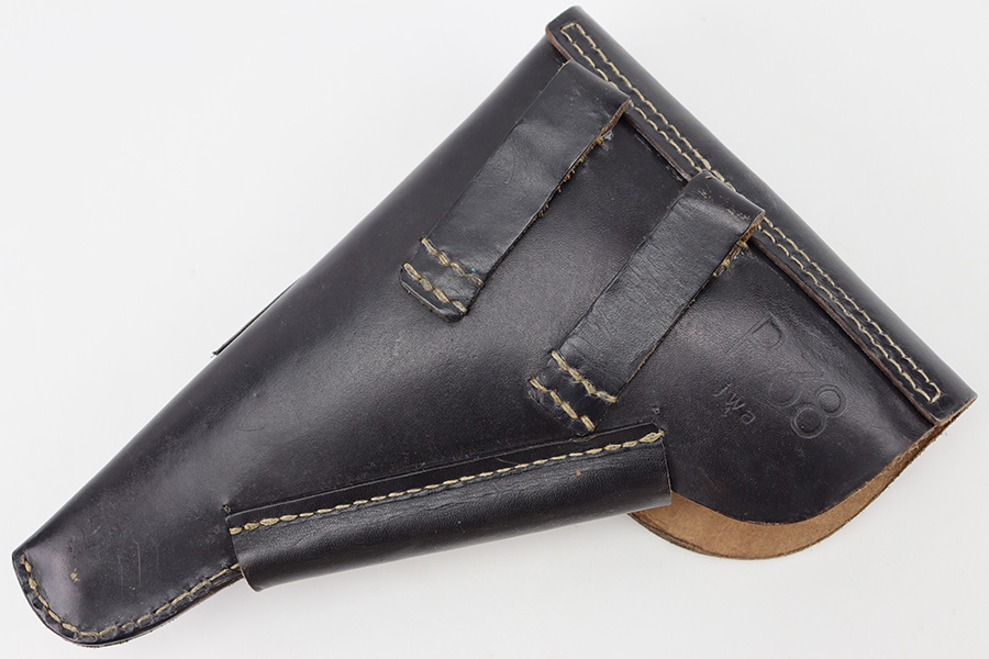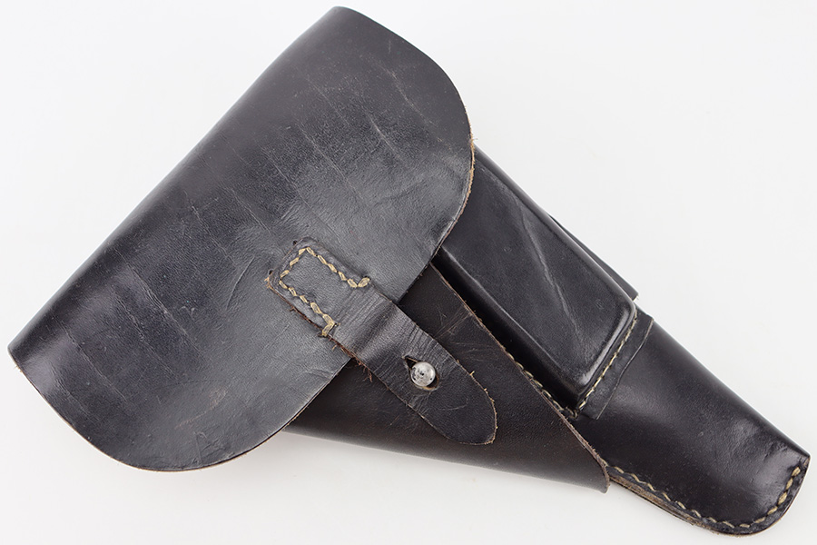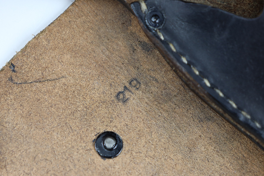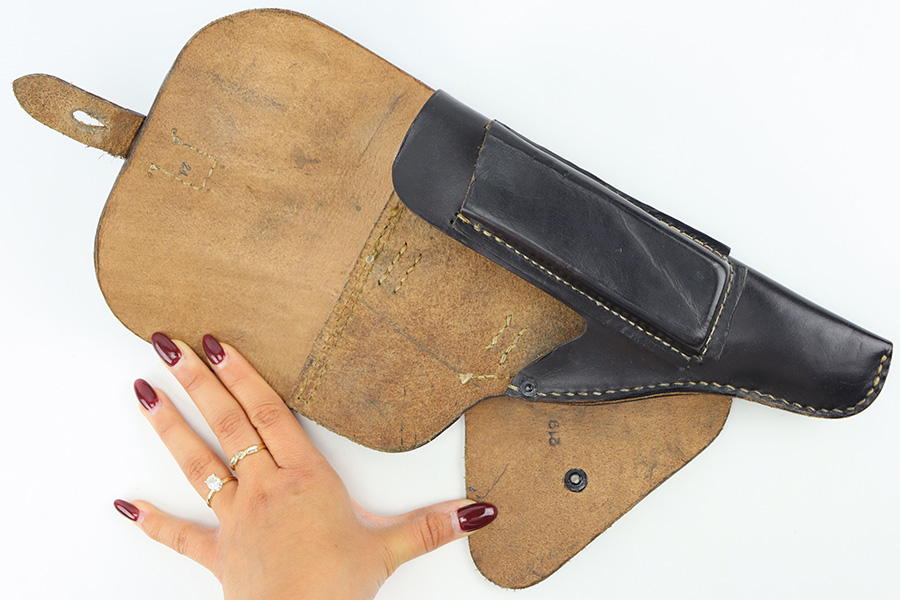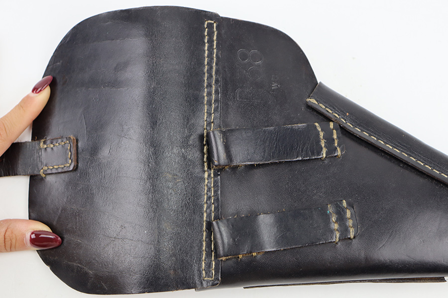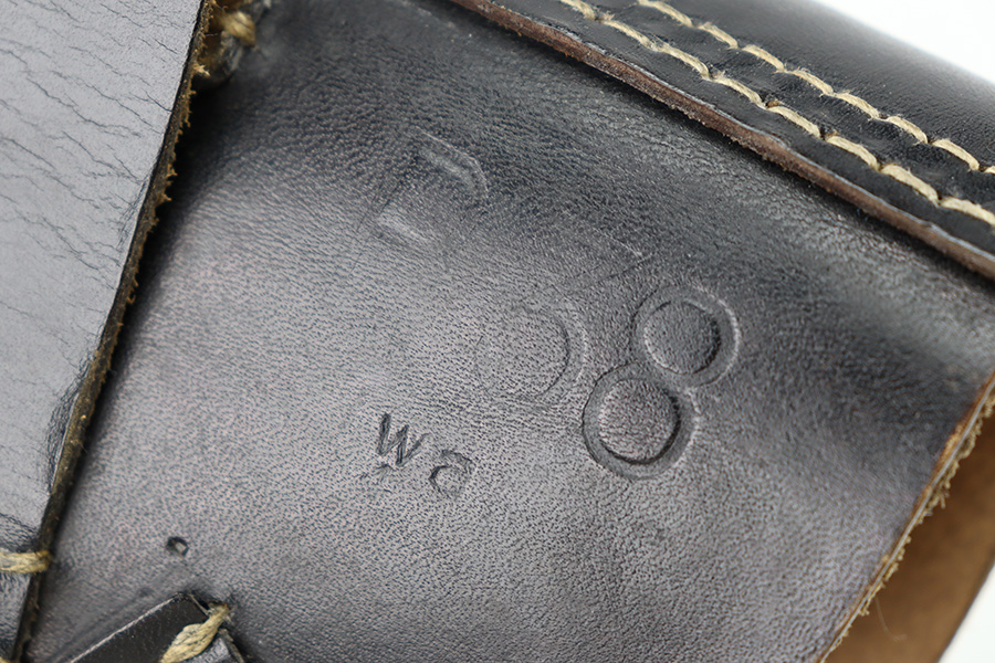 12/6/23 – This is an excellent condition, late WW2 production P.38 holster. The holster is softshell style with clean, strong leather throughout. The stitching is all intact and original. The back leather is P.38 stamped with a “jwa” maker code and “4” date stamp for 1944.