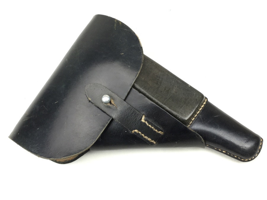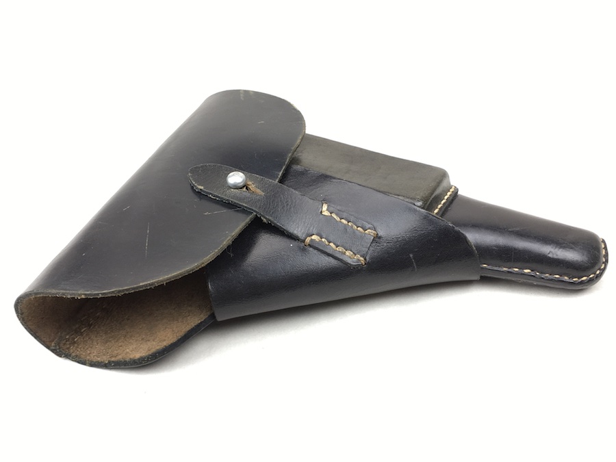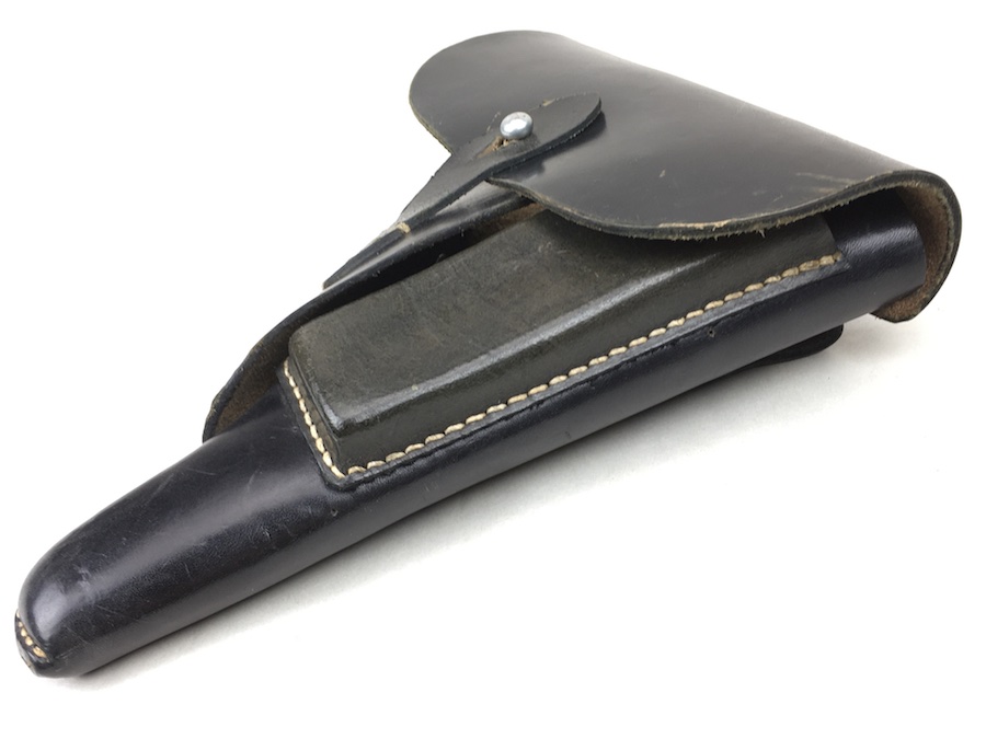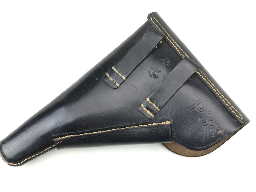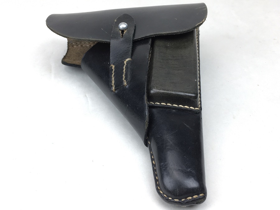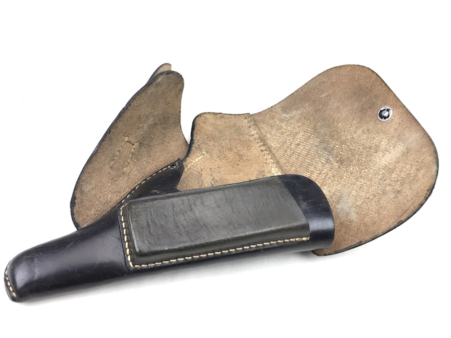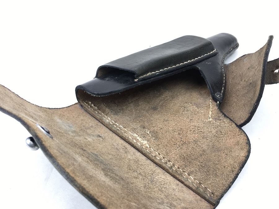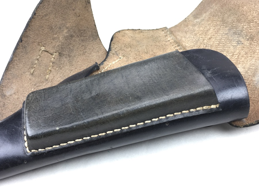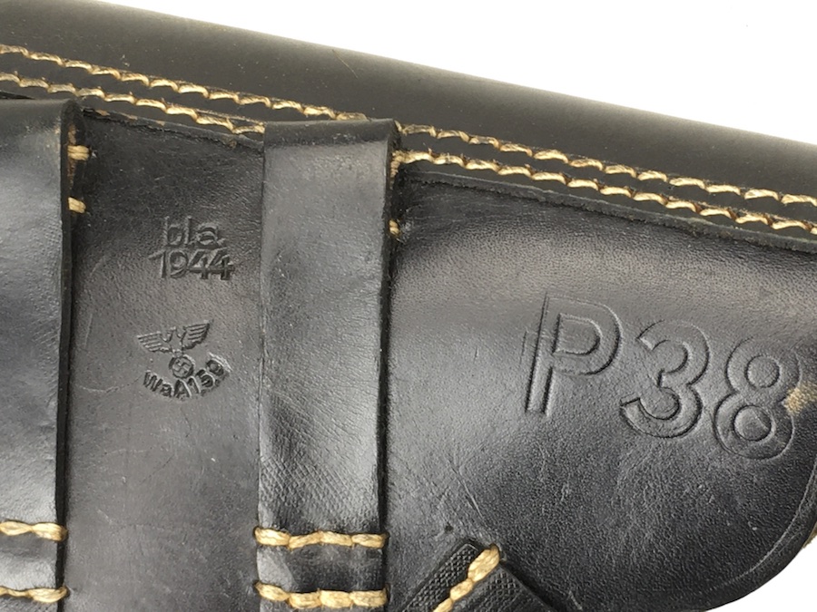 12/9/19 – This is a minty example of a late WW2 P.38 holster. The holster is softshell leather and is in almost unissued condition. The stitching is completely in tact as well with no issues. The back of the holster has a distinct, waffen eagle WaA159 military stamp. There is also a “bla” maker code and “1944” date stamp. There are no issues with this holster, and would go well with a 98%+ P.38 from 1943-45. Guaranteed original and authentic from WW2.