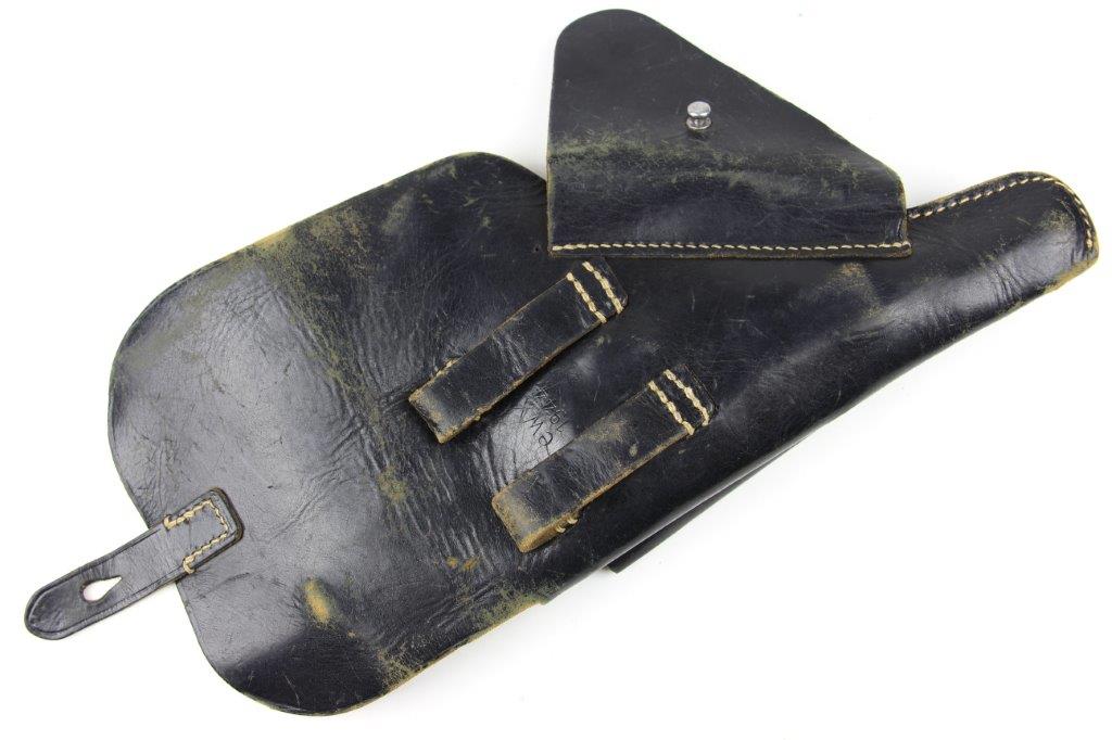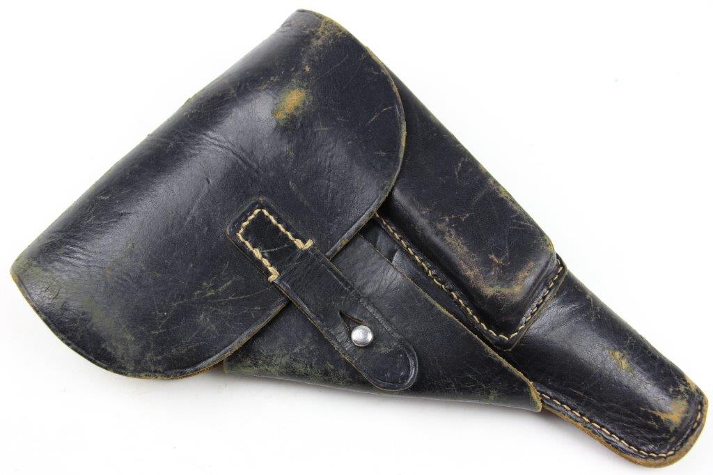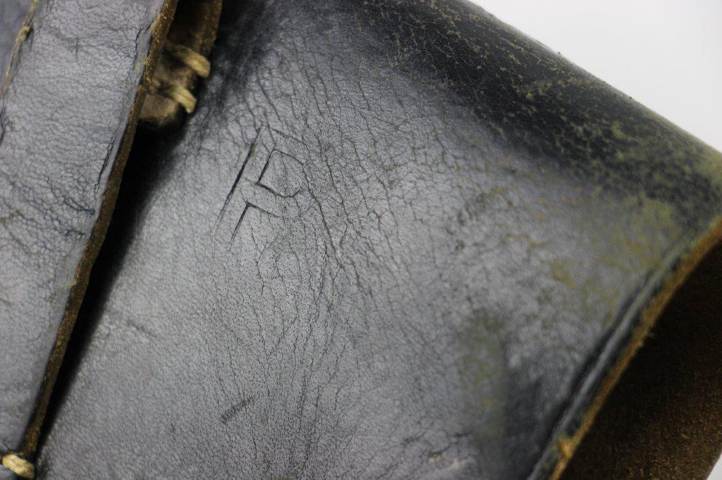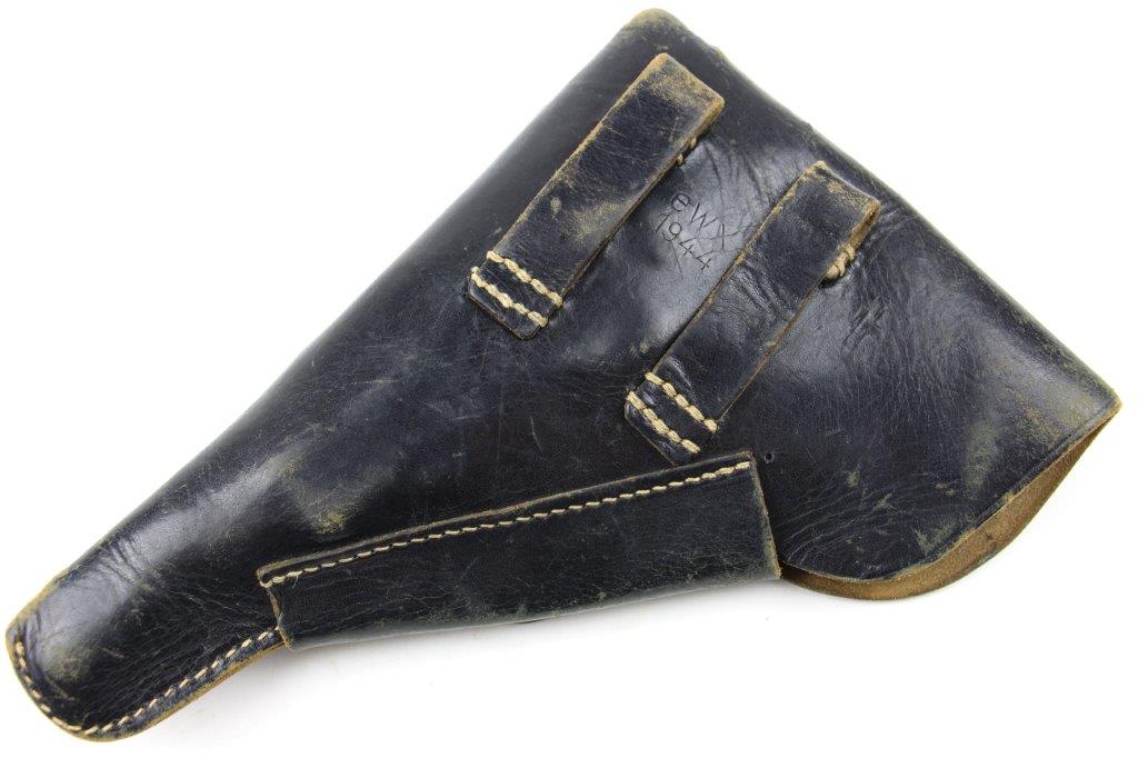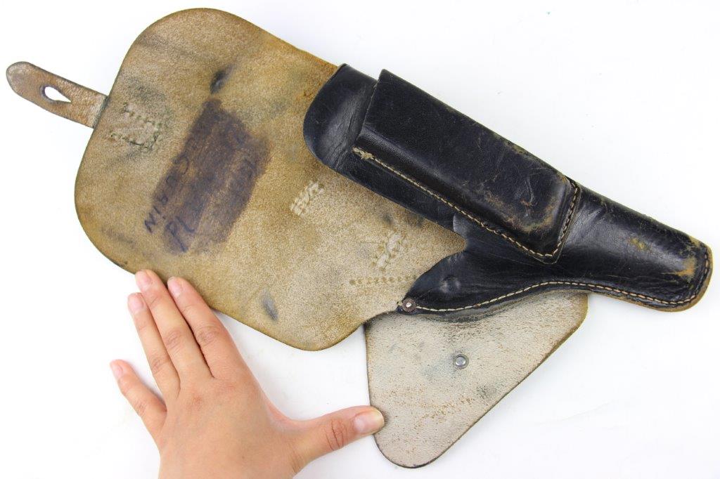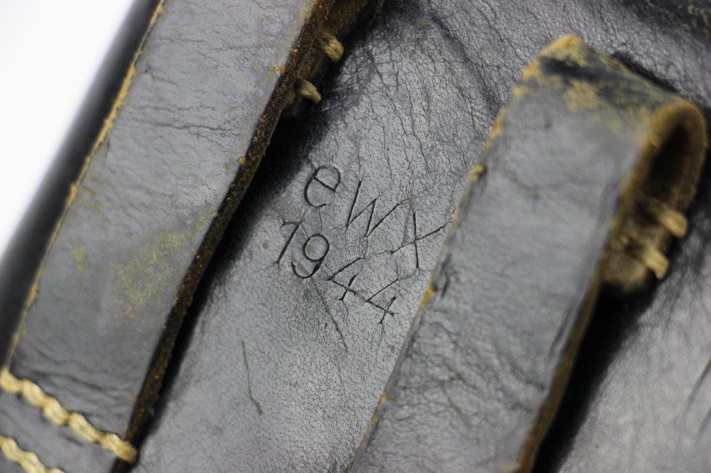 5/14/24 – This is an original 1944 dated soft-shell style P.38 holster from WW2. The holster is in very good overall condition and features a one-piece construction. This is fairly uncommon and an interesting design change – notice the lack of stitching above the belt loops on the backside of the holster. This is a late-war feature to increase production efficiency. The leather is soft and pliable with signs of previous use. There’s wrinkling and scuffing throughout, as well as surface cracking on the top leather. The stitching is tight and all original throughout. The interior leather has some writing that has been blacked-out, and the back leather is maker stamped, dated, and P.38 stamped.