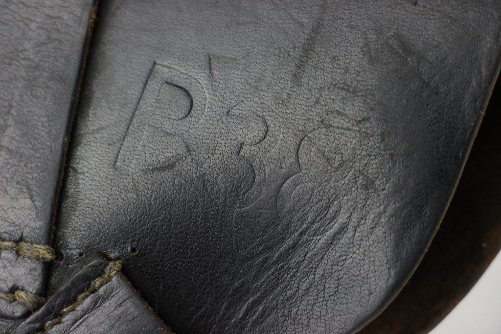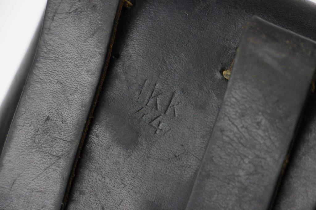 9/25/24 – This is a rare variation late WW2 P.38 holster. The holster is soft-shell style with no top seam, also referred to as a “1 piece” body style. This is due to the lack of stitching along the top leather, where typically the lid or upper portion of the holster is a separate piece of leather. This example is in great overall condition and well marked with a maker stamp, date code stamp, waffen military proof stamp, and P.38 designation stamp on the back leather. The leather is soft and pliable with normal use wear. The stitching is all original and intact throughout. A rare late war example.