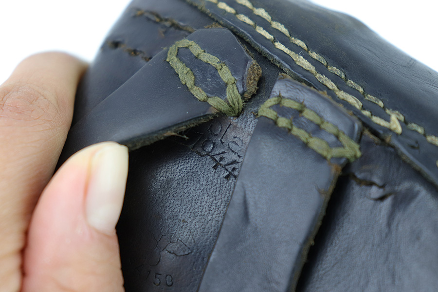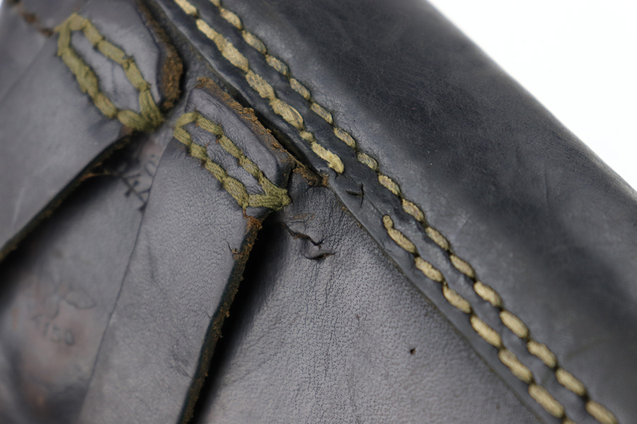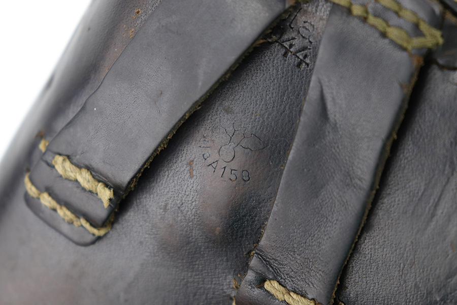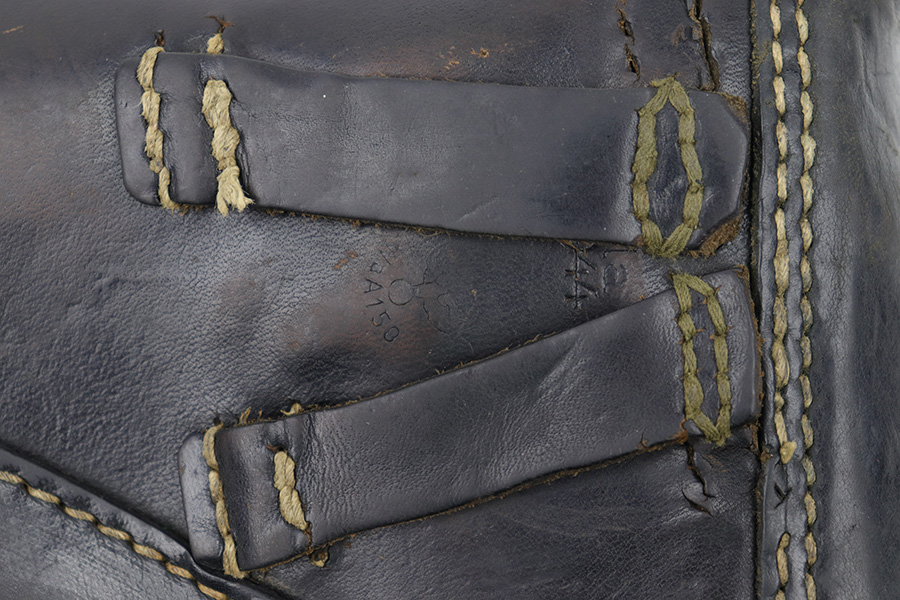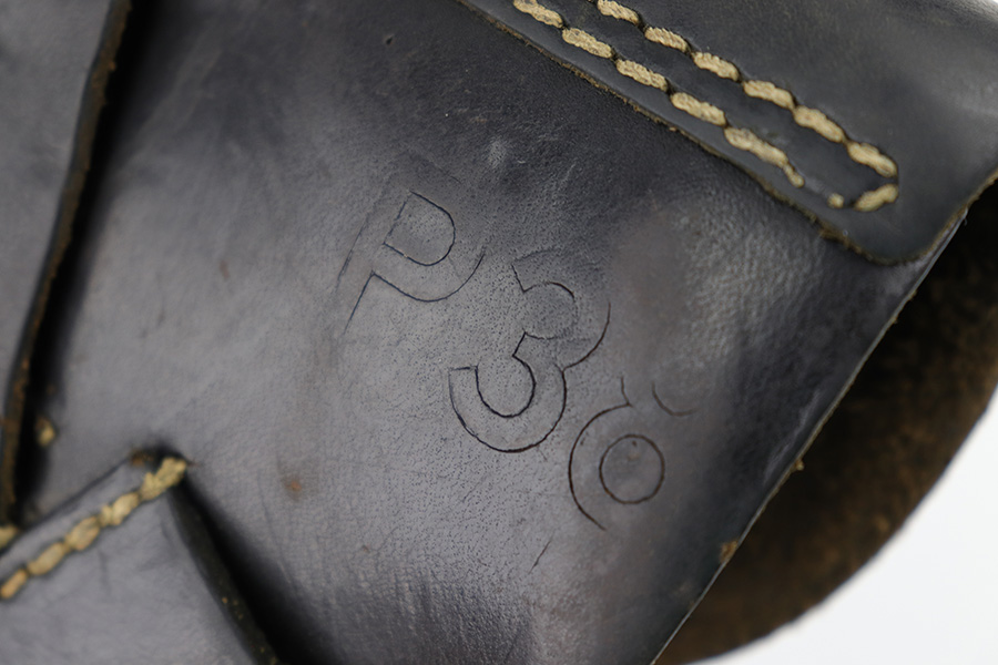 6/27/23 – This is an original 1944 dated soft shell style P.38 holster. The holster is all original and in very good overall condition. The back belt loops have been repaired and re-stitched at the top of each loop, as shown in photos. The back leather is P.38 stamped, waffen military proof stamped, maker code stamped “bla” and 1944 date stamped. The leather is soft and pliable with use wear and aging throughout.