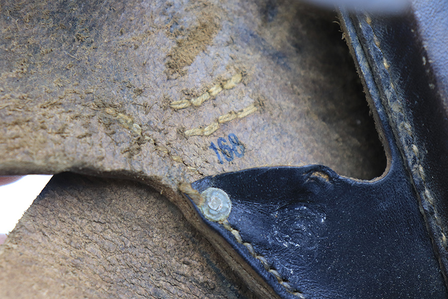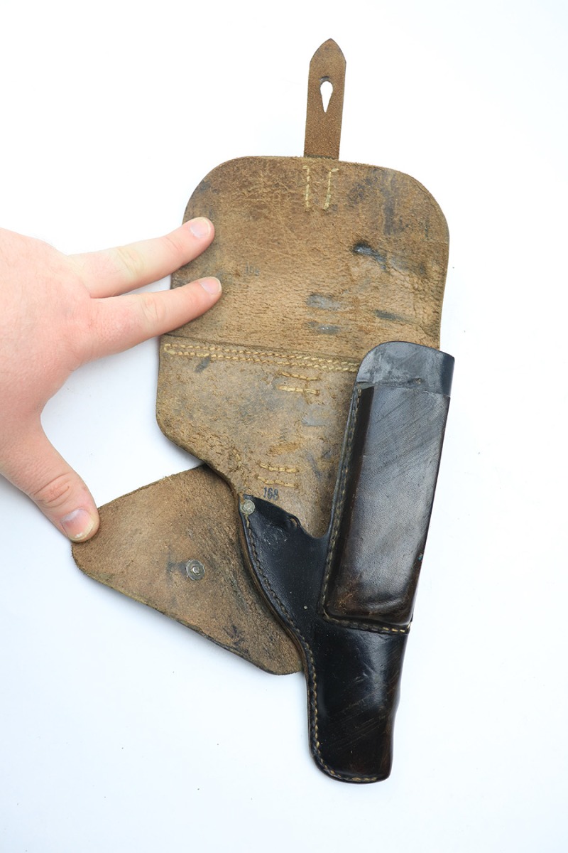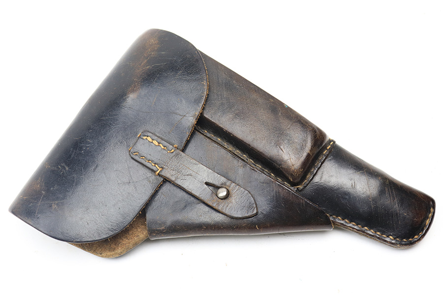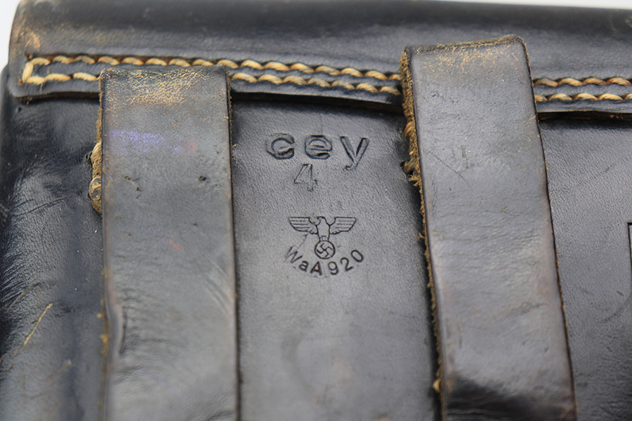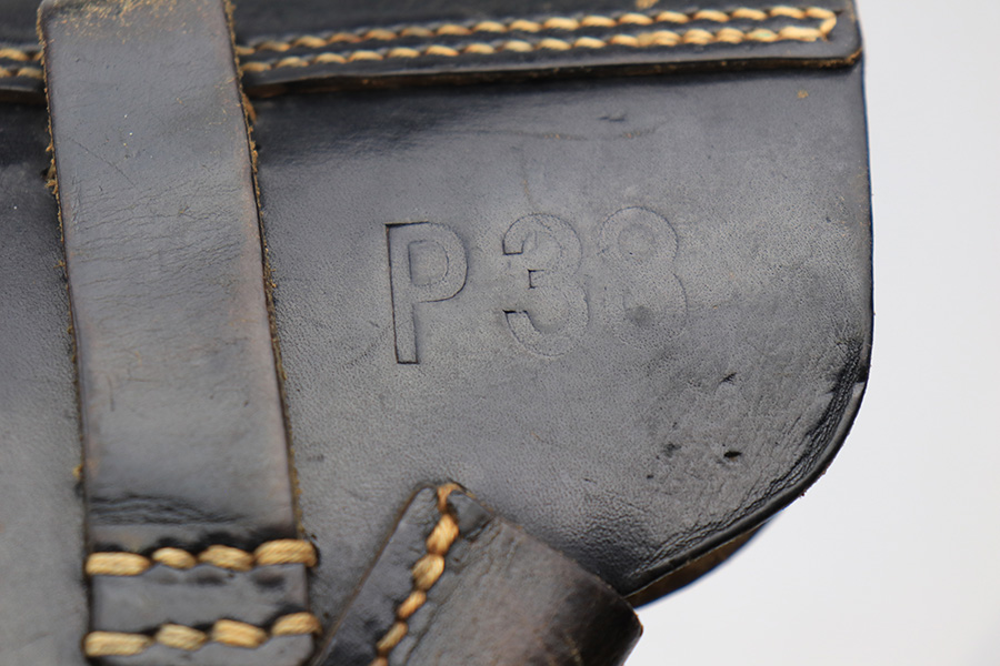 4/4/22 – This is an original late WW2 production P.38 holster. The holster is softshell style, with a date stamp, maker stamp, waffen proof, and P.38 stamp on the back leather. The stamps are all crisp and legible. The black leather shows typical signs of aging and previous use with normal pliability. No stitching issues. The interior leather is fairly clean with no notable issues. A great late-war example.