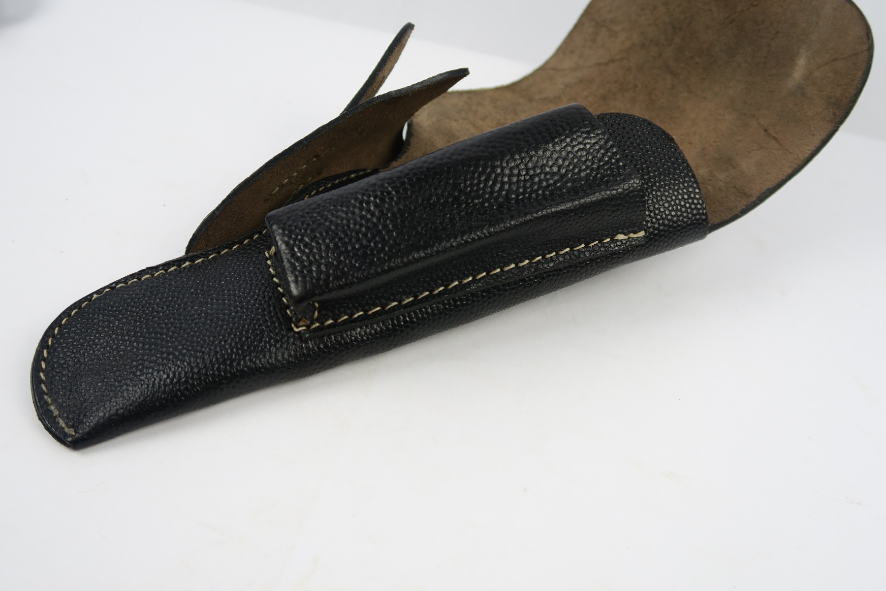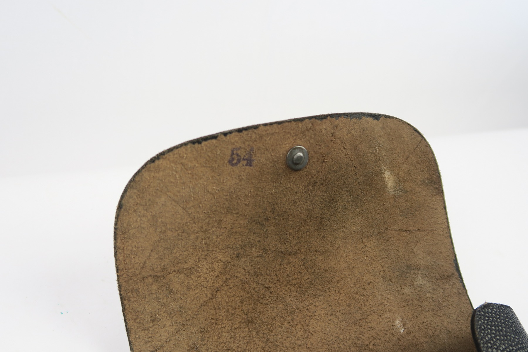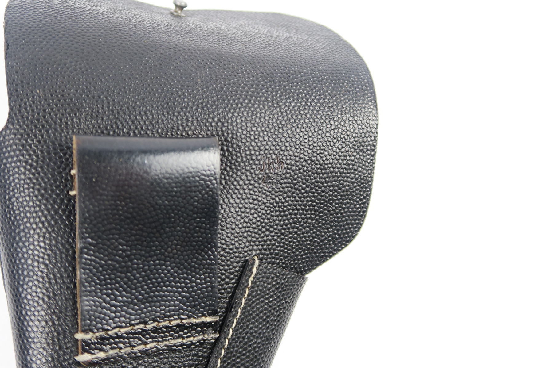 2/28/18 – This is an original black pebble grain Hi Power holster from late WW2. The holster is in minty, unissued condition with very nice, clean leather and stitching. The interior leather has a “54” ink stamp. The back leather is “jkh” maker stamped with a “4” for 1944 date stamp. There are no other markings. Guaranteed original and authentic.