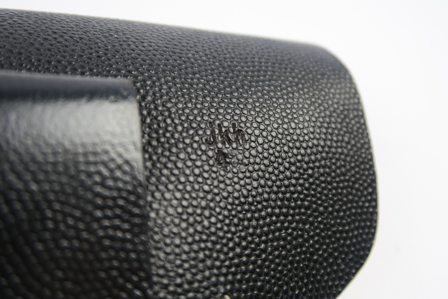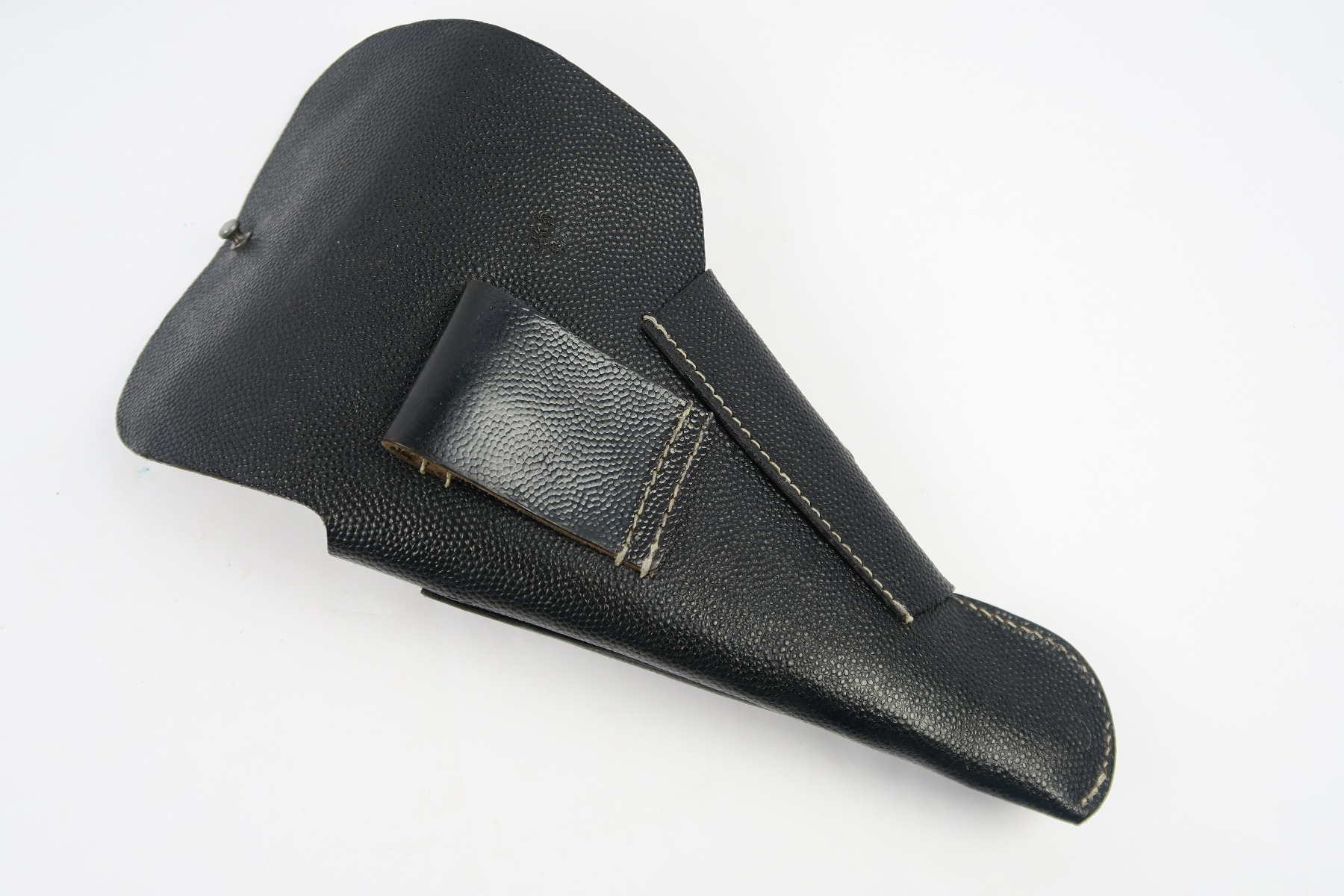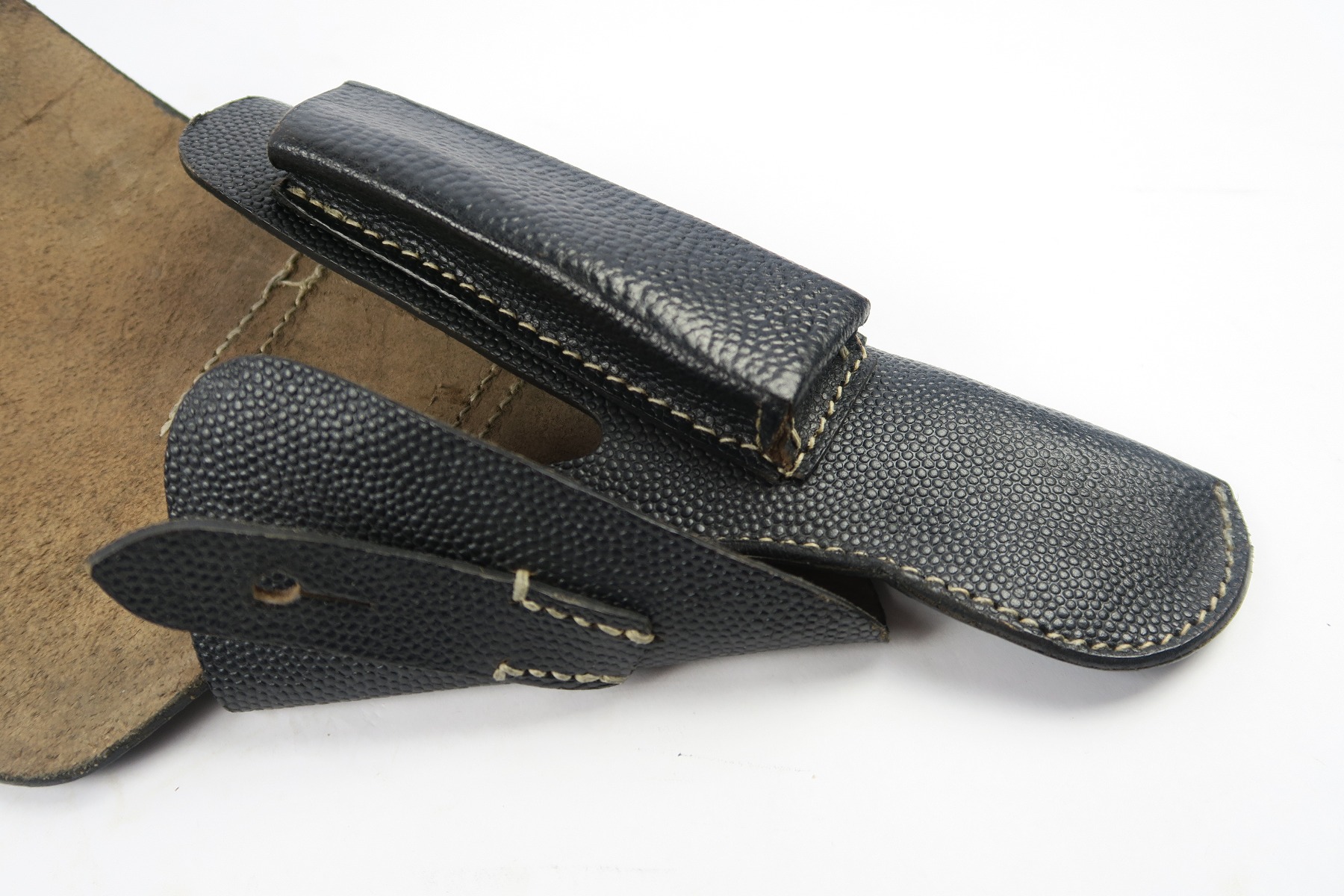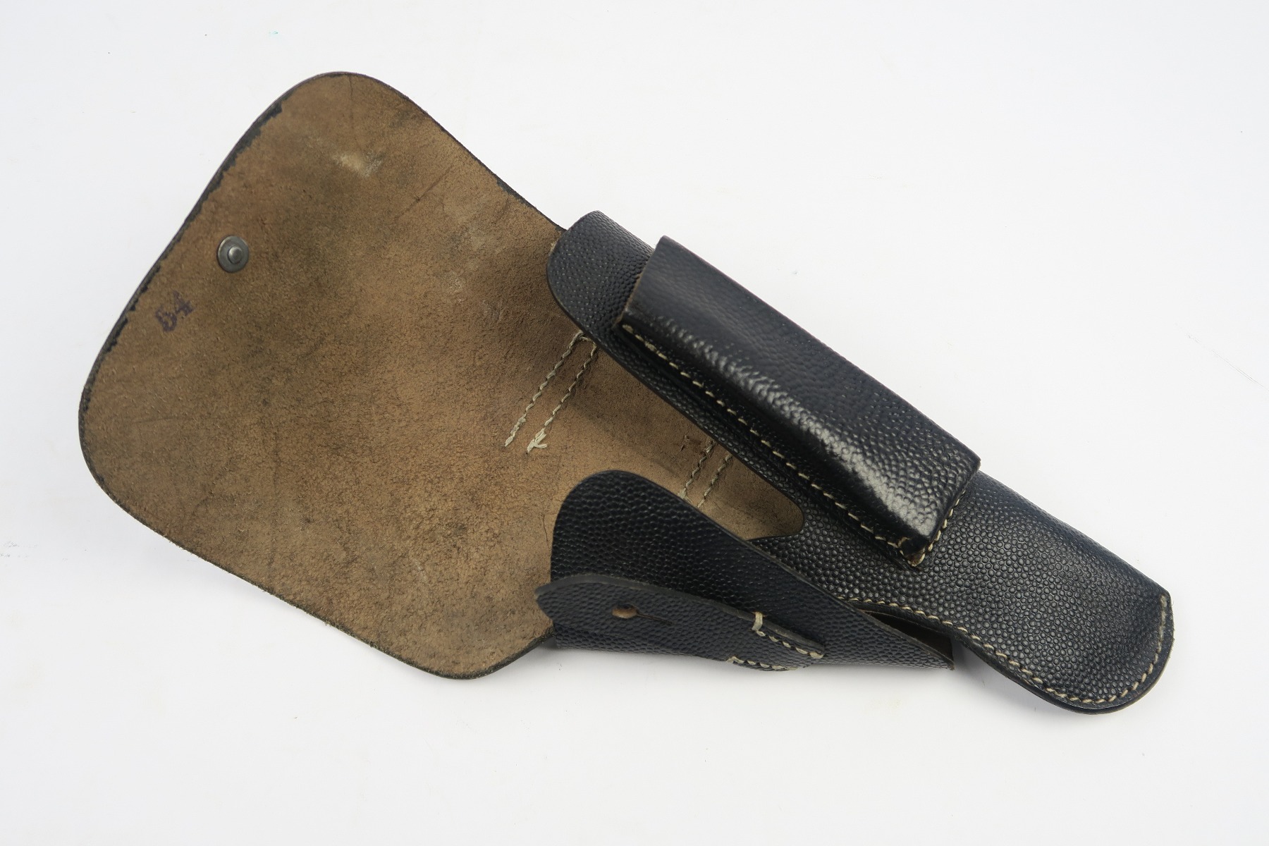2/28/18 – This is an original black pebble grain Hi Power holster from late WW2. The holster is in minty, unissued condition with very nice, clean leather and stitching. The interior leather has a “54” ink stamp. The back leather is “jkh” maker stamped with a “4” for 1944 date stamp. There are no other markings. Guaranteed original and authentic.
