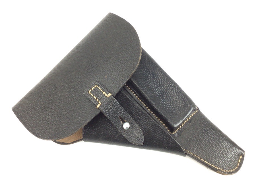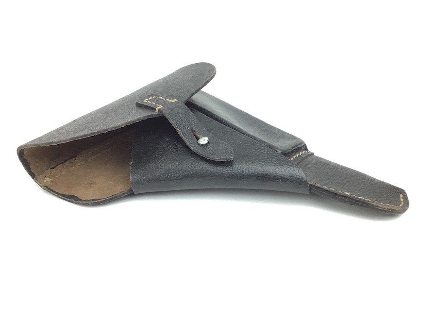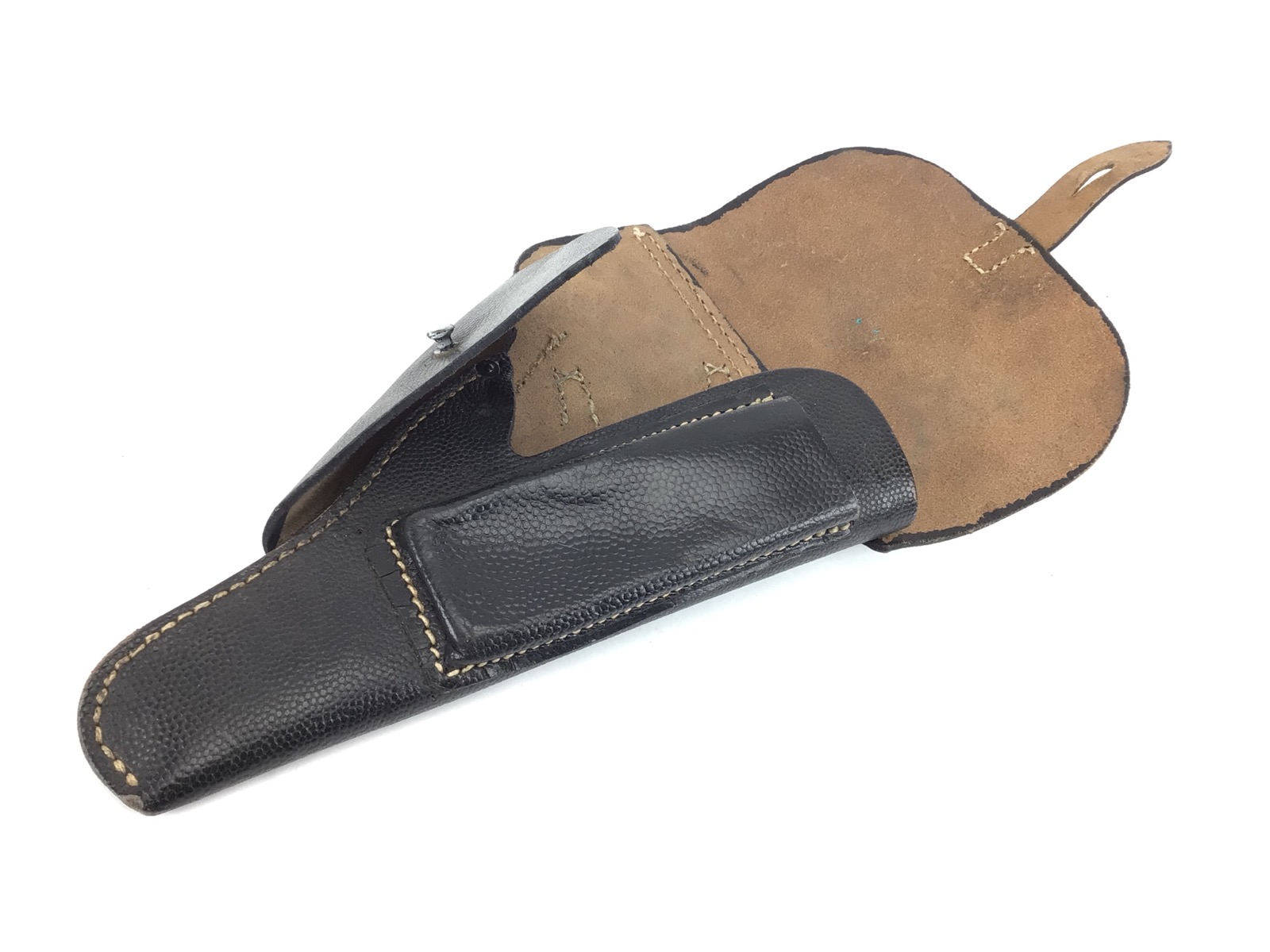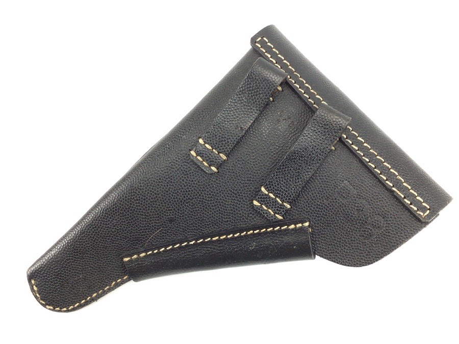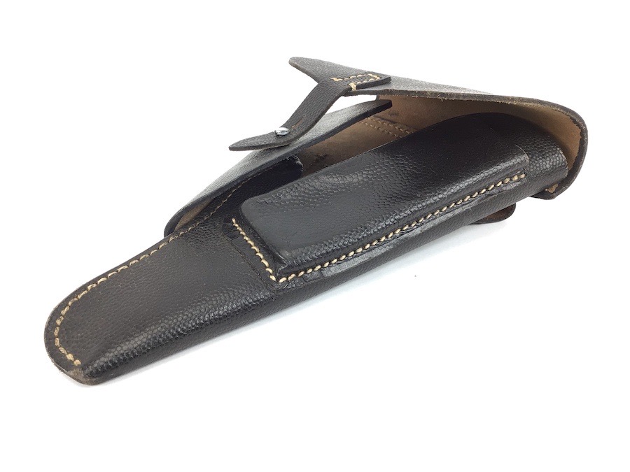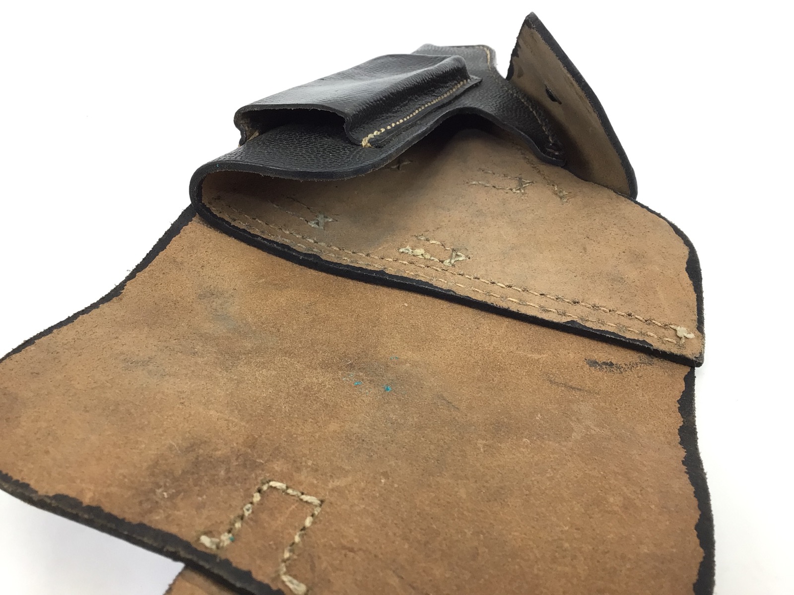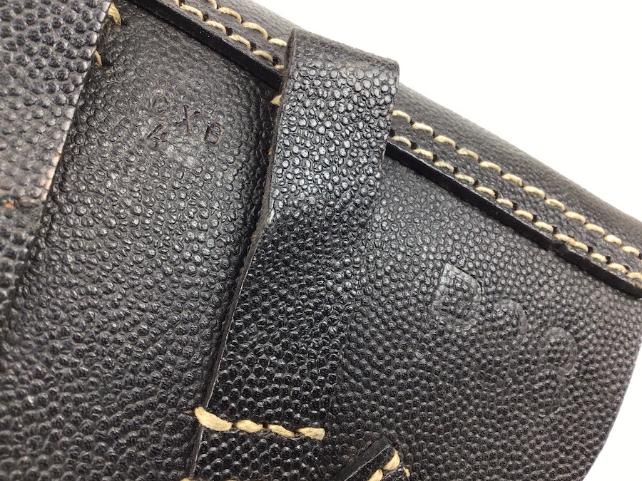 1/12/23 – Original and excellent condition. WW2 era pebble grain softshell P.38 holster. The back of the holster is stamped with maker code “cxb” and date stamped “4” for 1944. The leather is soft and pliable with very little use wear. The stitching is all tight and original. Clean interior.