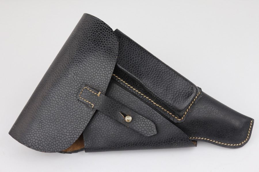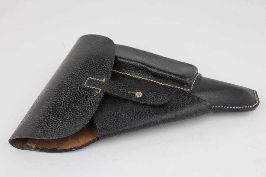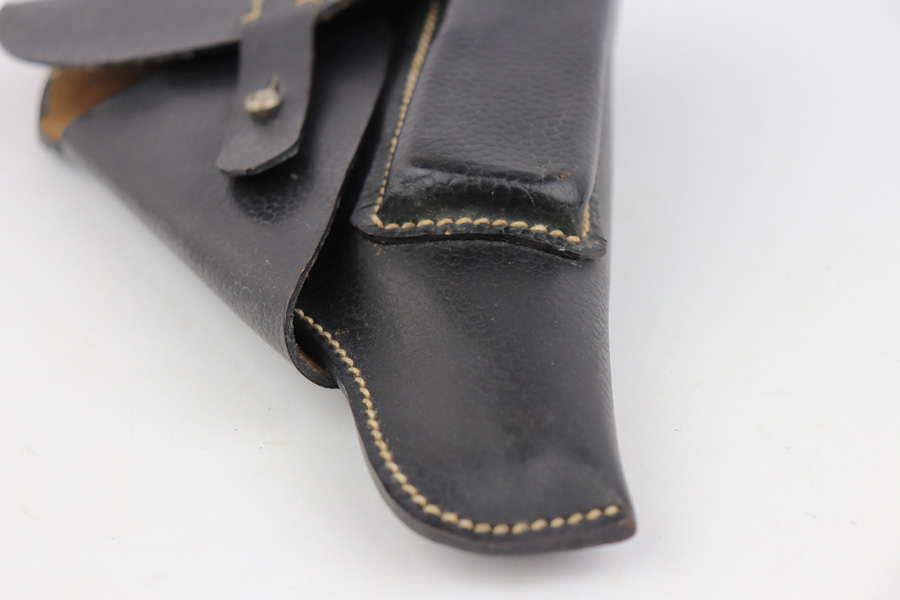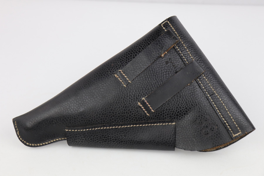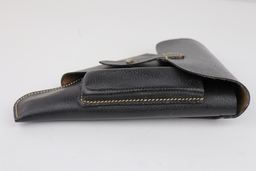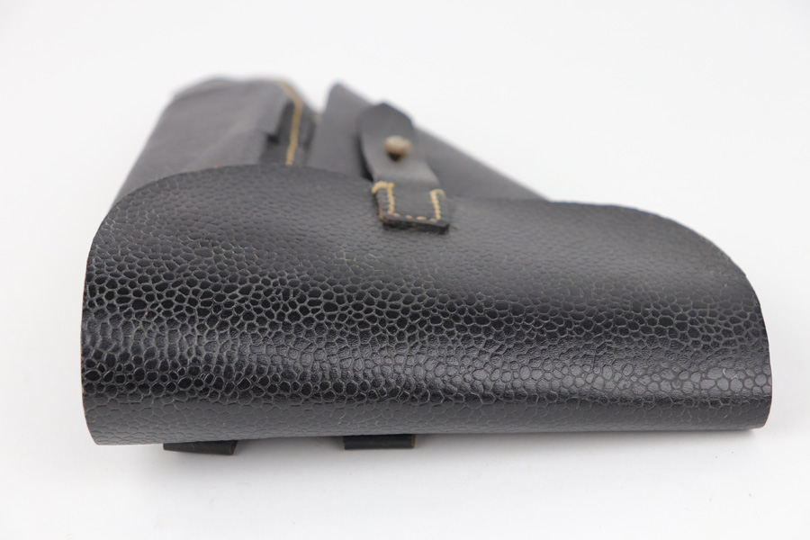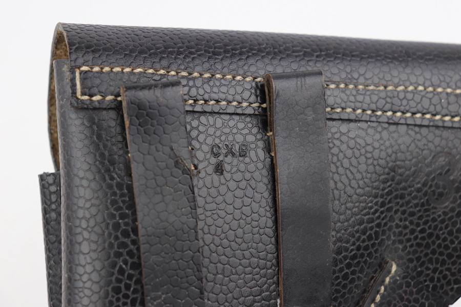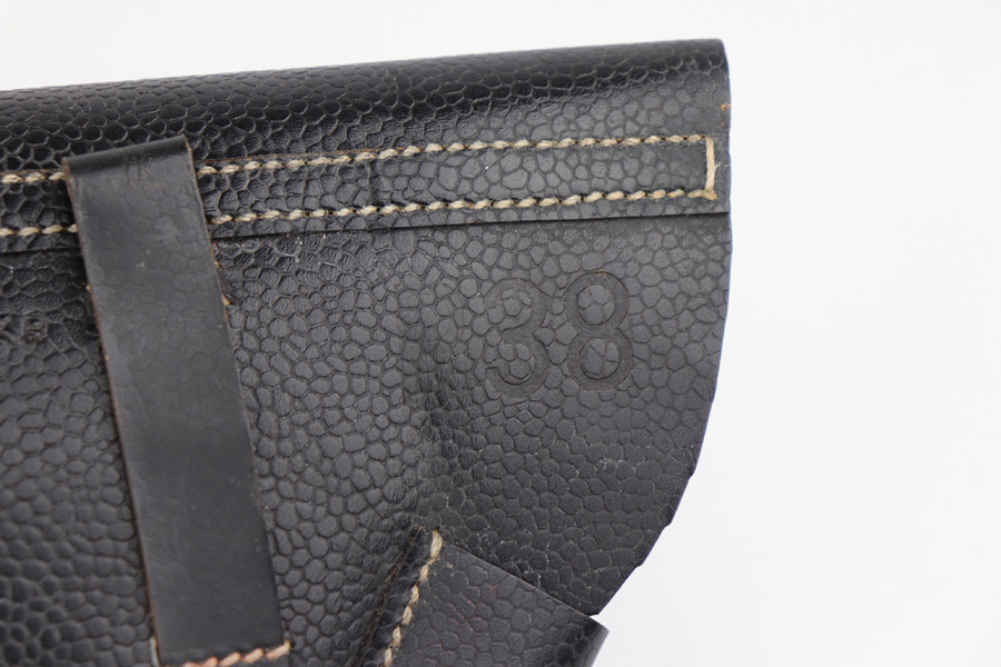 8/7/19 – This is an original 1944 dated P.38 softshell style holster with pebble grain style leather. The holster is “4” stamped on the back leather for 1944, along with a “CXB” maker stamp and P.38 stamp. The “P” in the P.38 stamp is very faint for unknown reasons (likely due to a bad stamp-strike). The holster leather is very clean and strong, and the stitching is all original and in tact. No notable flaws or issues.