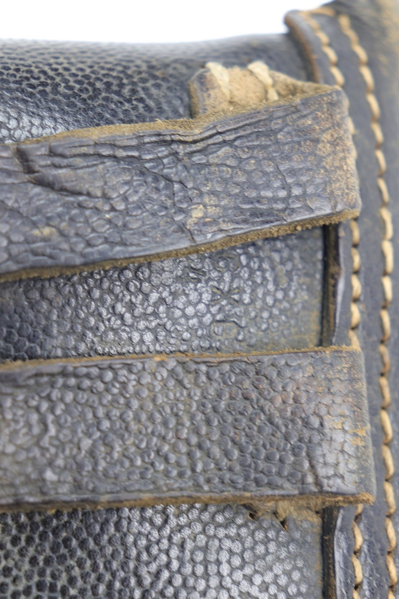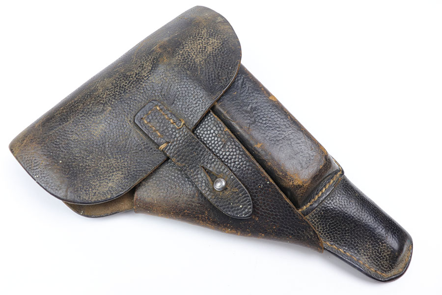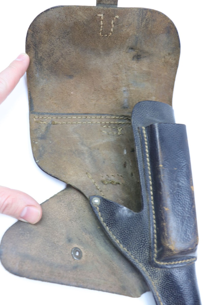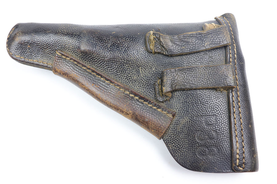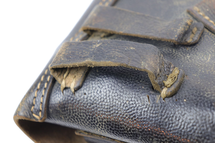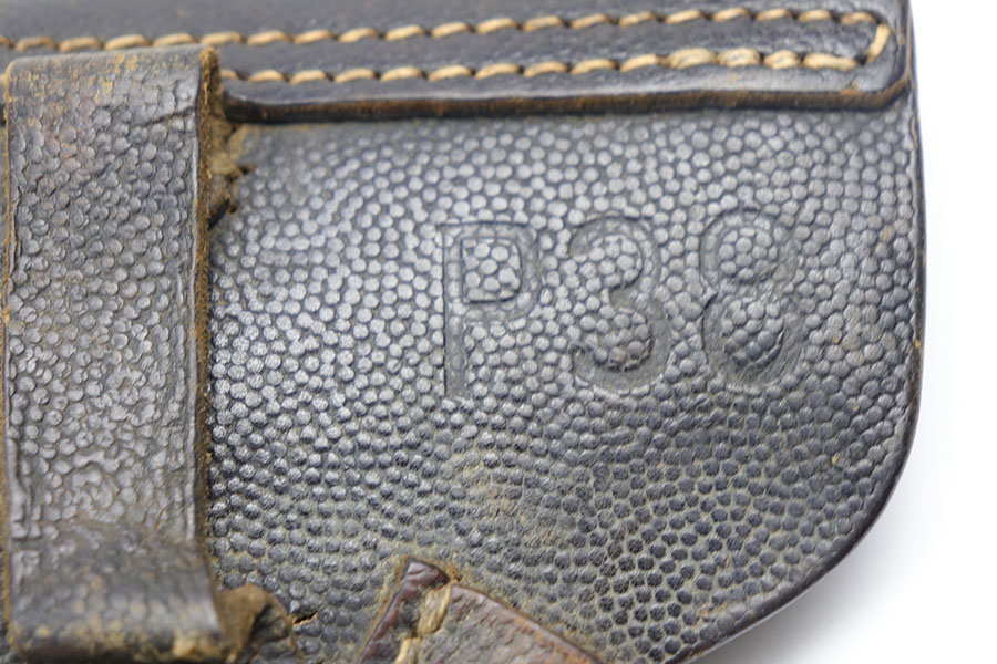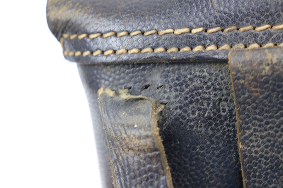 10/27/20 – This is an original pebble grain softshell P.38 holster from WW2. The holster is stamped on the back leather “cxb 4” and P.38 stamped. The leather is pebble grain on the exterior with some normal signs of use and aging. The leather is in tact, but the stitching is missing on the back belt loops in a few small areas and has been re-stitched onto the back leather. Priced accordingly.