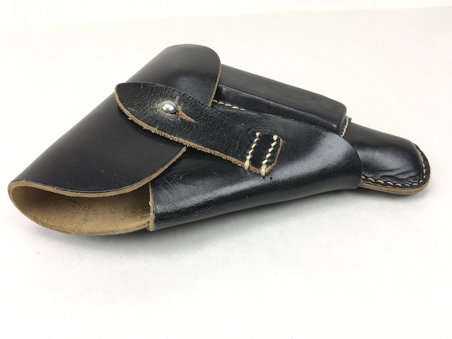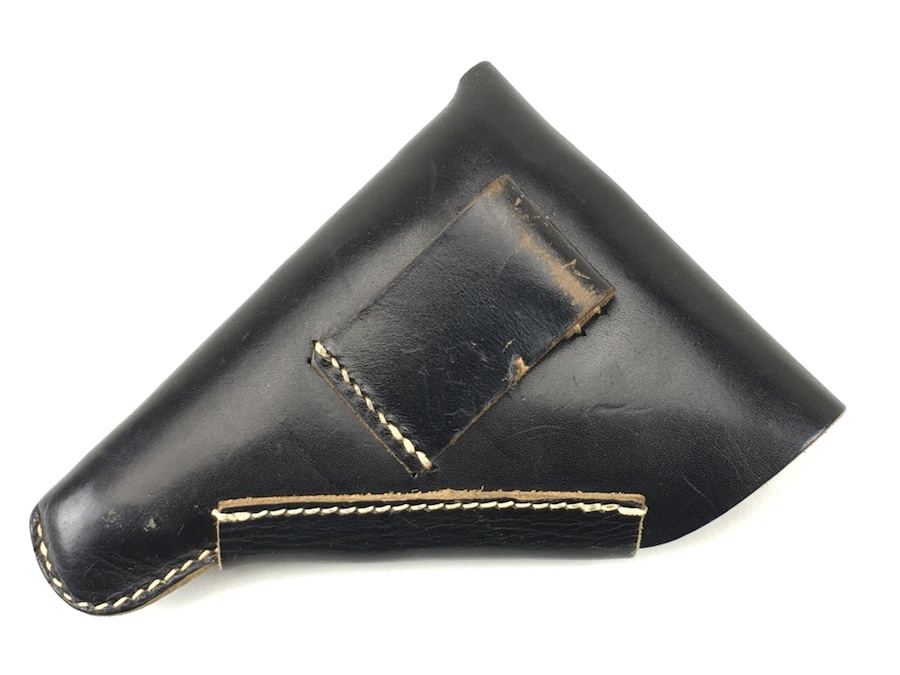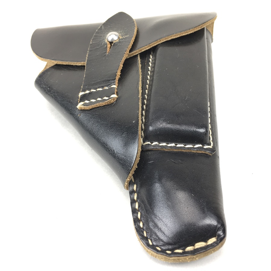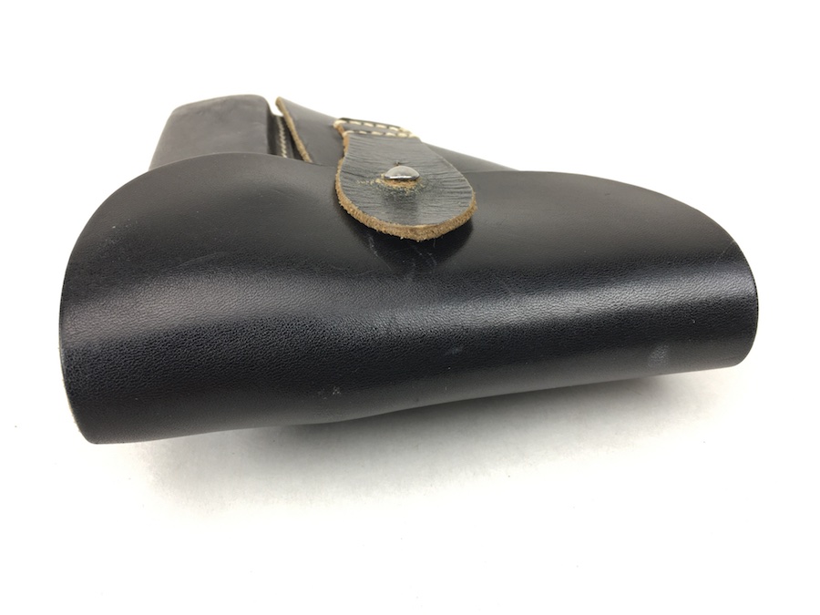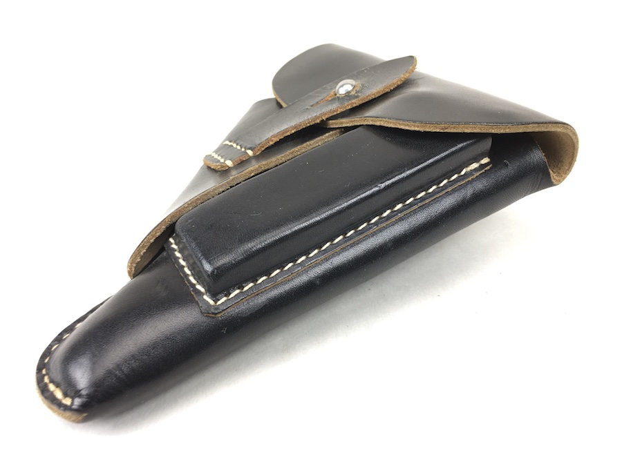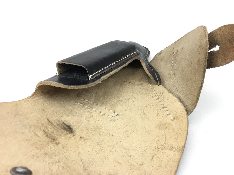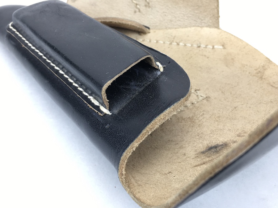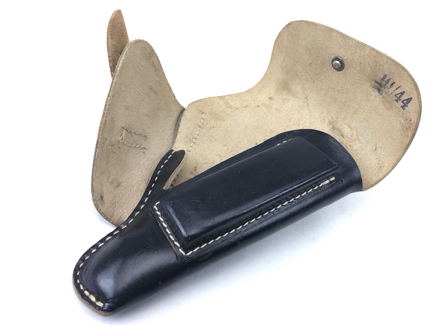 12/2/19 – This is a minty condition holster for the Sauer 38H, Mauser HSc or Walther PPK. We’ve commonly seen these paired with the 38h and HSC. All models fit nicely though. The interior flap is ink stamped “ftt 44”. (Most 1944 holsters were stamped with “jhg”) Very minor wear and beautiful, tight stitching. Beautiful condition.