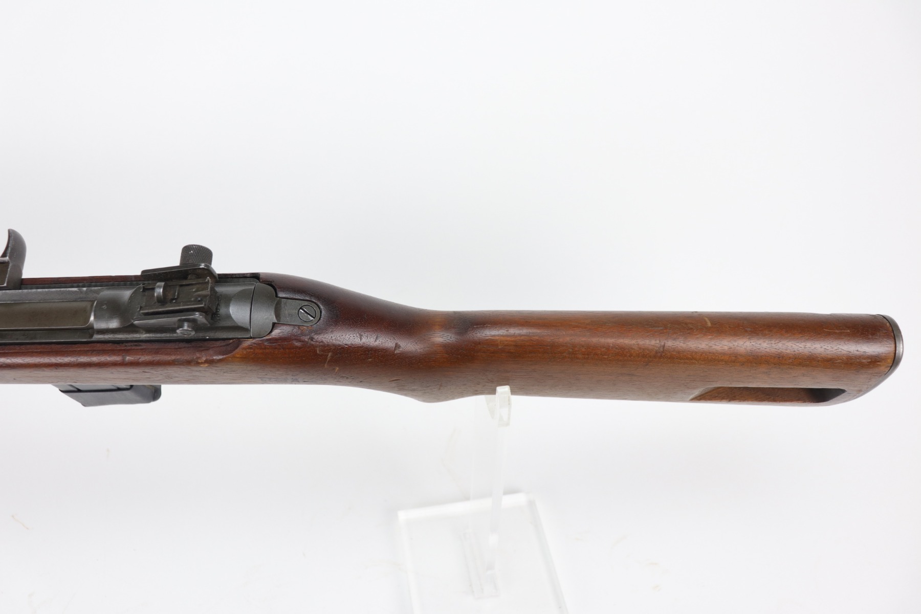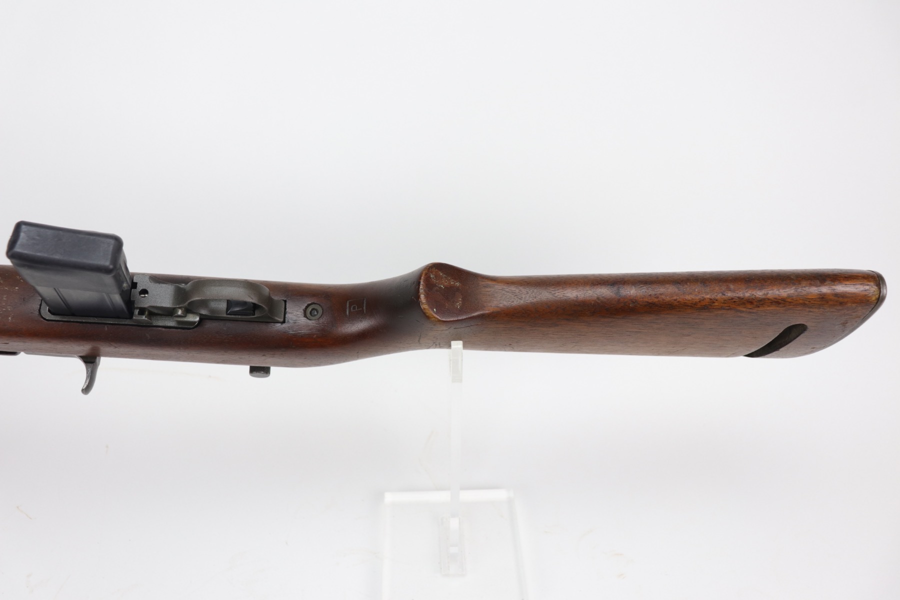 2/26/21 – This is a very nice example of a Quality Hardware M1 Carbine issued to the US military in 1944. A bayonet lug and adjustable rear sight was added, likely for the Korean war. It has an Inland barrel and a replaced Rockola stock. There is also an “RRA” rework marking on the stock. A parts list of their markings is included. Most of the internals are Quality Hardware. Overall, the gun is in very nice condition. Just a few handling marks on the barrel and some spotty discoloration on the receiver. The stock is very nice with minor bruises and scratches here and there. The bore is minty. Comes with a WW2 magazine.