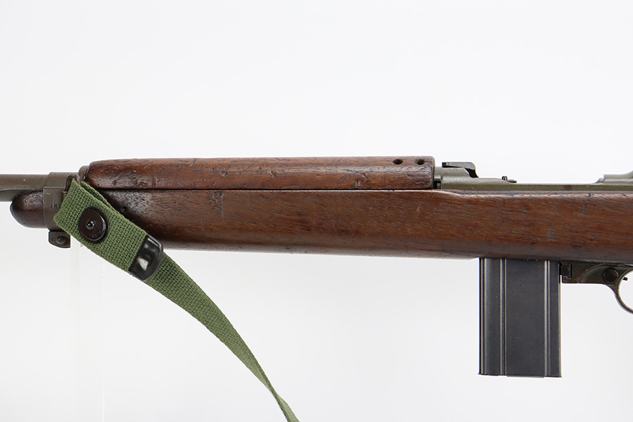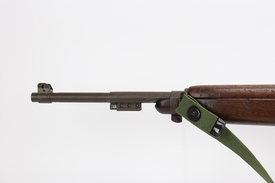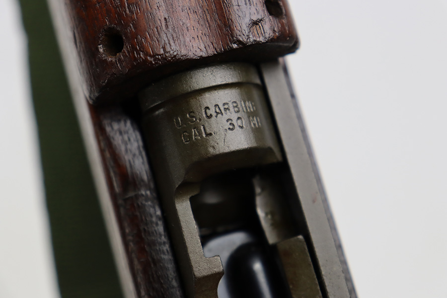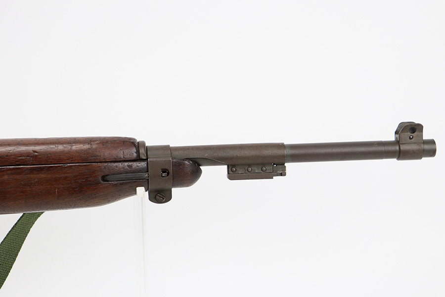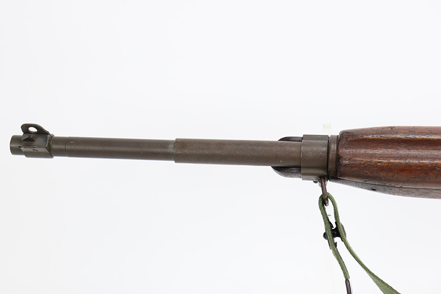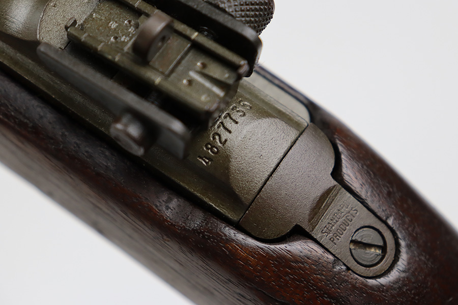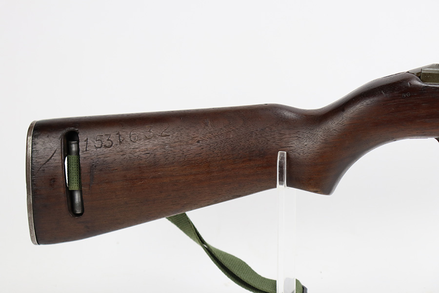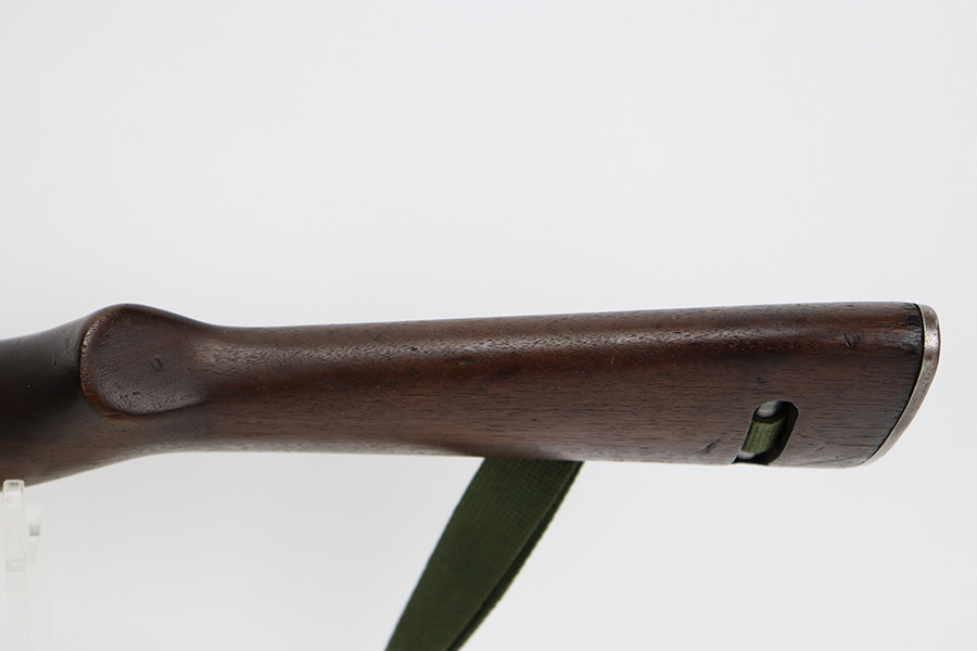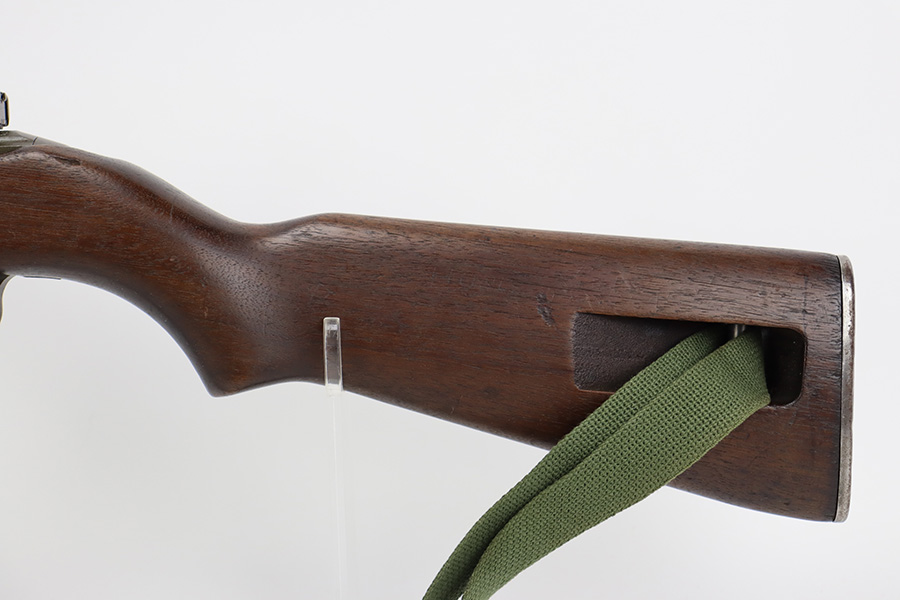8/25/23 – This is an excellent example of a Quality Hardware M1 Carbine. The serial number on the receiver dates it to 1944. Underwood barrel dated February of 1944. An adjustable rear sight and bayonet lug were added later, likely for use during the Korean War. The stock is Underwood marked and has a rack number on the right side of the butt stock. Standard Products marked recoil plate. The metal parts have retained nearly all of their parkerized finish with just some light spotty oxidation on the bayo lug. Overall, the wood furniture is nice, but there are some small gouges on the upper handguard. Mint bore. Comes with an original oiler, reproduction canvas sling, and an un-marked magazine.