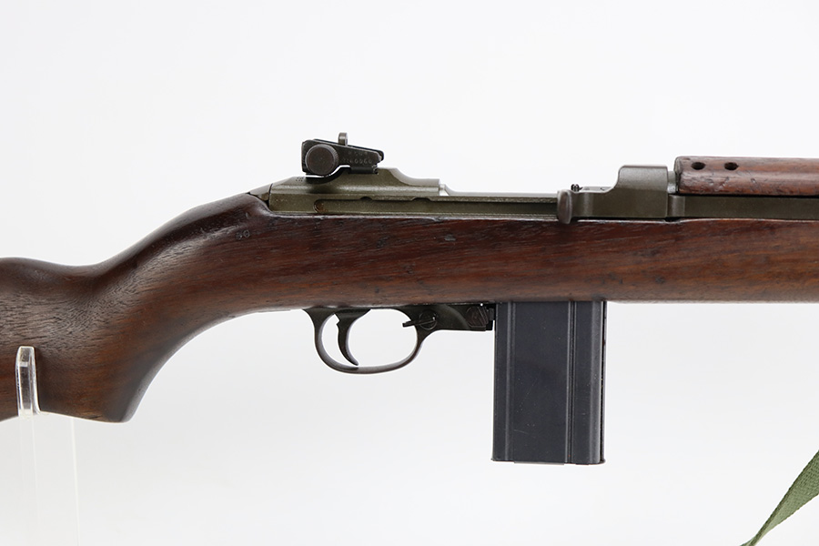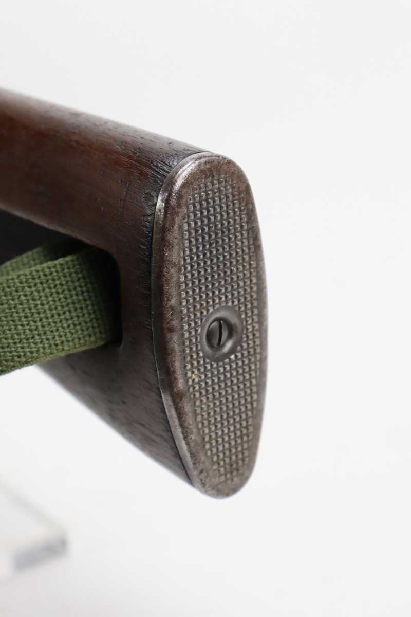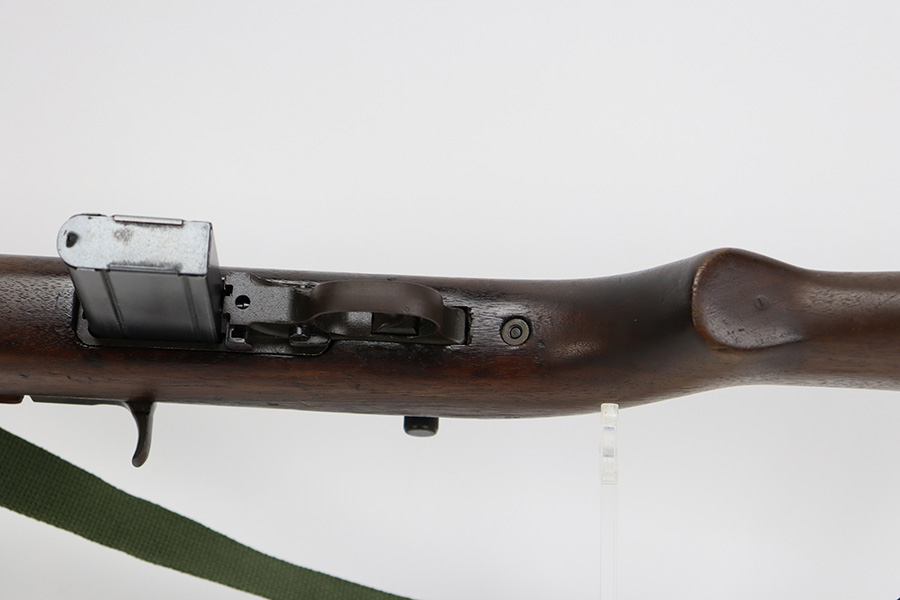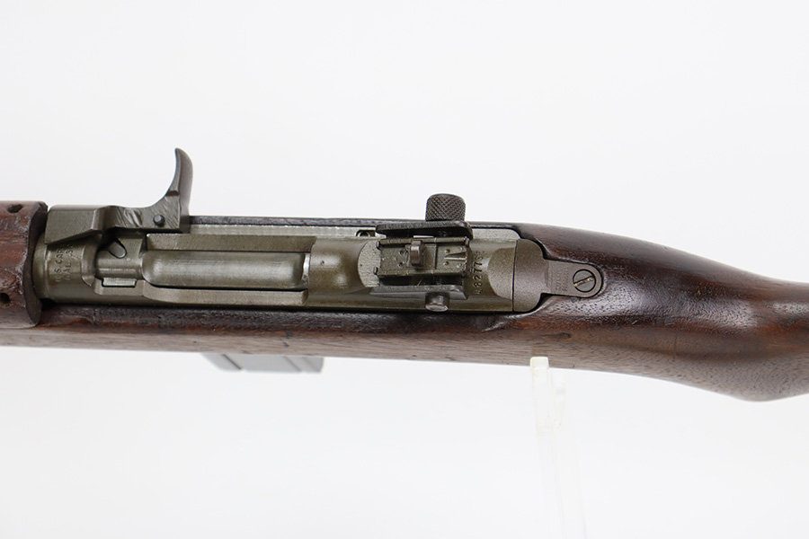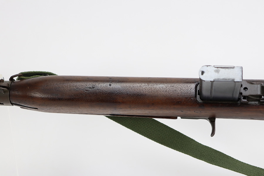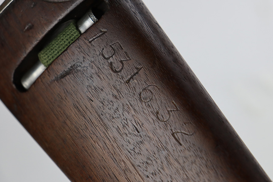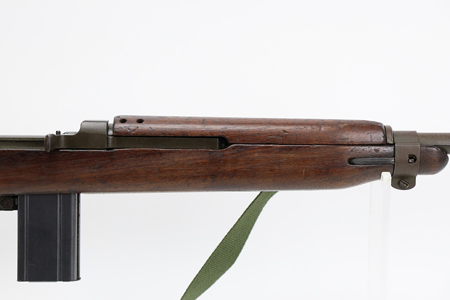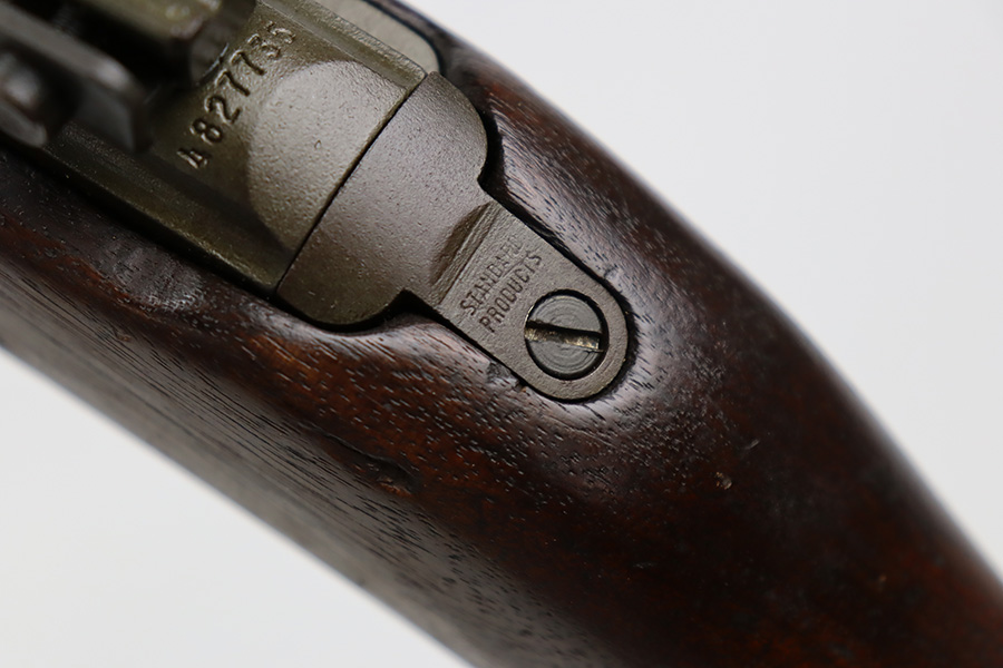 8/25/23 – This is an excellent example of a Quality Hardware M1 Carbine. The serial number on the receiver dates it to 1944. Underwood barrel dated February of 1944. An adjustable rear sight and bayonet lug were added later, likely for use during the Korean War. The stock is Underwood marked and has a rack number on the right side of the butt stock. Standard Products marked recoil plate. The metal parts have retained nearly all of their parkerized finish with just some light spotty oxidation on the bayo lug. Overall, the wood furniture is nice, but there are some small gouges on the upper handguard. Mint bore. Comes with an original oiler, reproduction canvas sling, and an un-marked magazine.