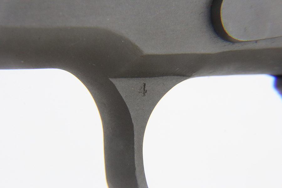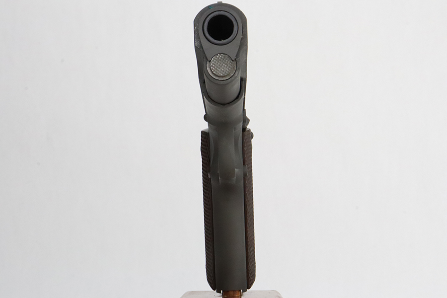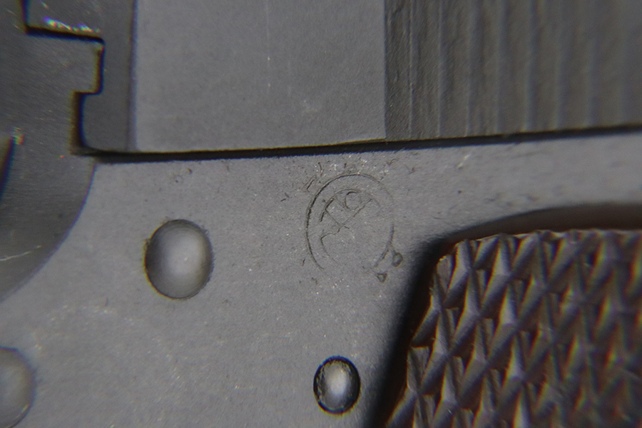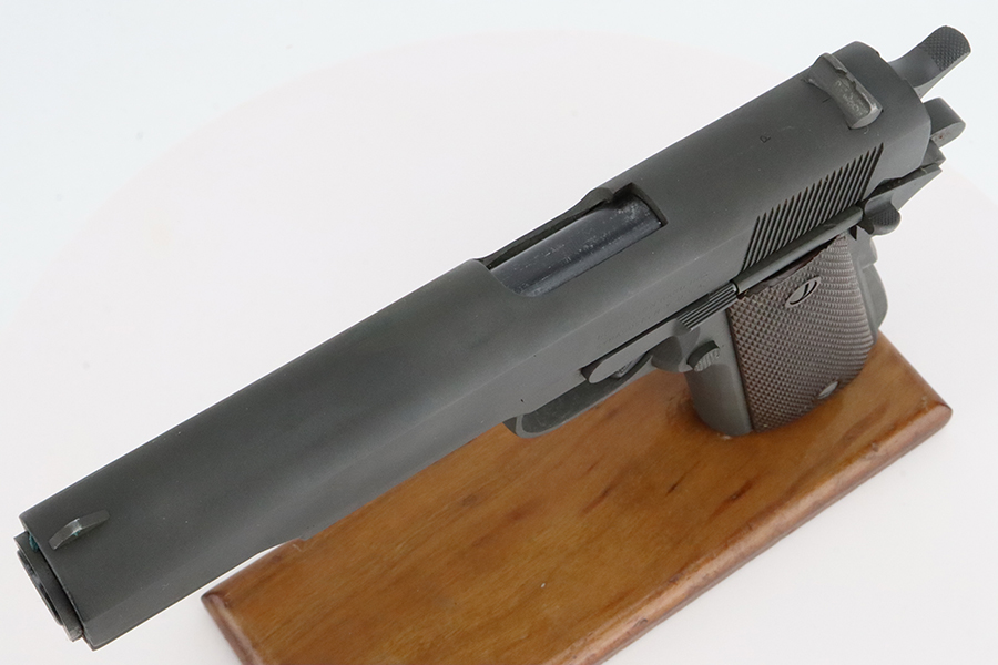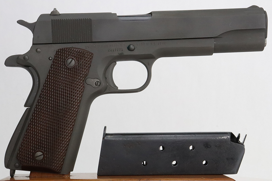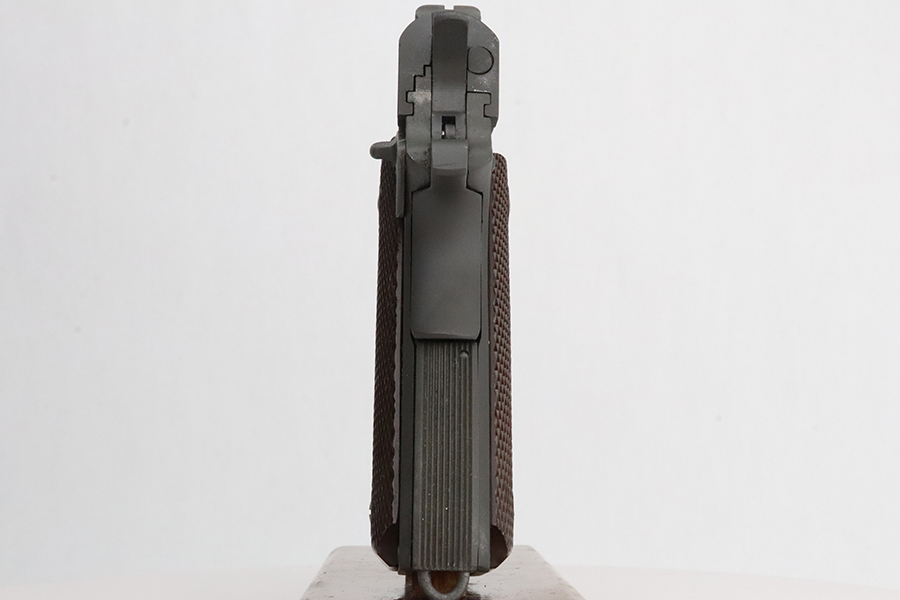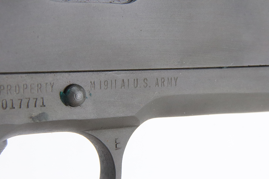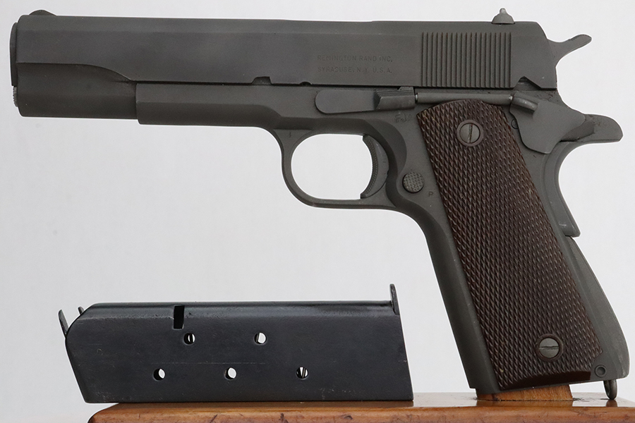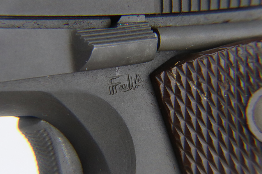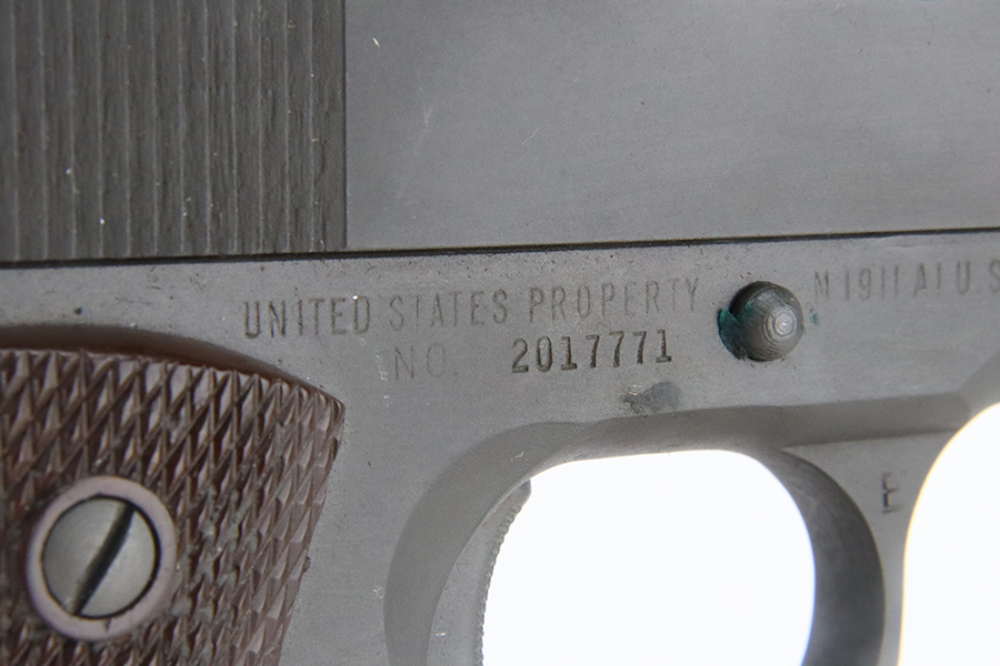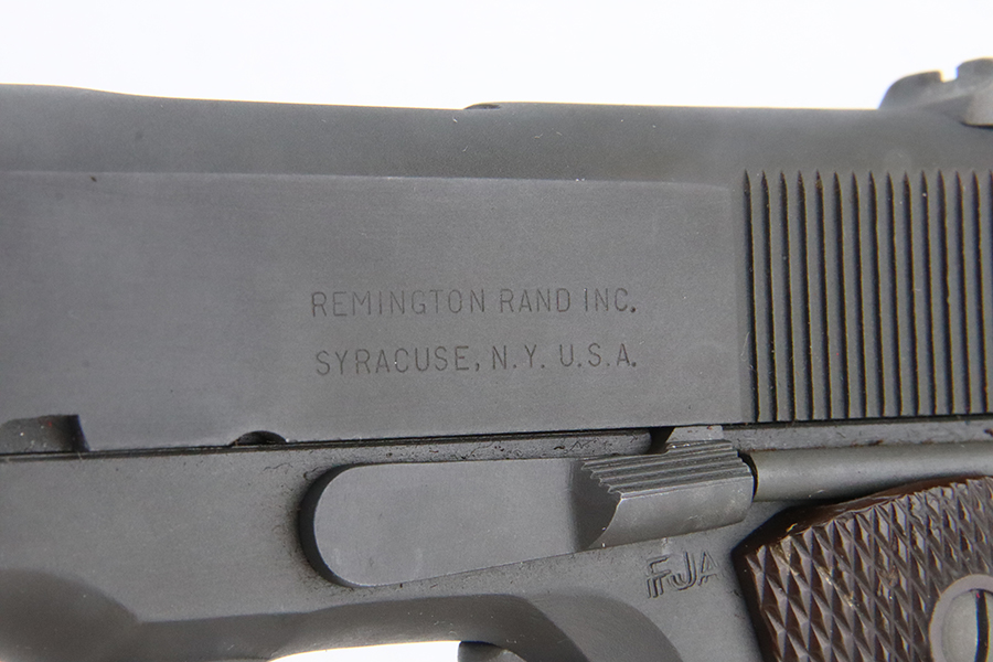 3/7/24 – This is an excellent example of a Remington Rand Model 1911A1 issued to the US military in 1944. It is “United States Property” marked, has a cross-canon cartouche, and has the proper “FJA” inspector initials. Proper HS barrel. This gun has been refinished, and there is virtually no actual finish loss. Fitted with period-correct reddish plastic grips and comes with a proper “S” marked magazine. Mint bore.