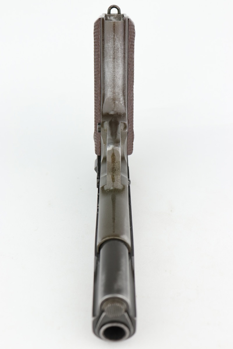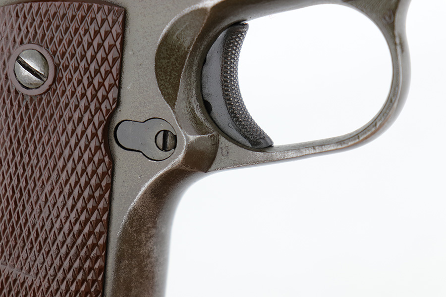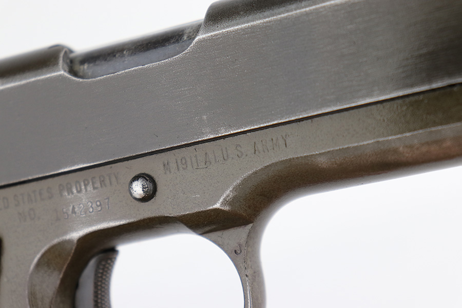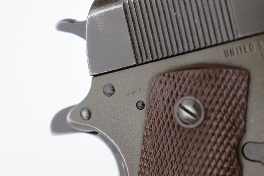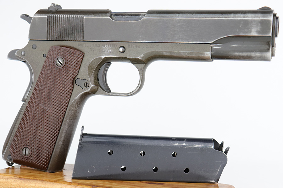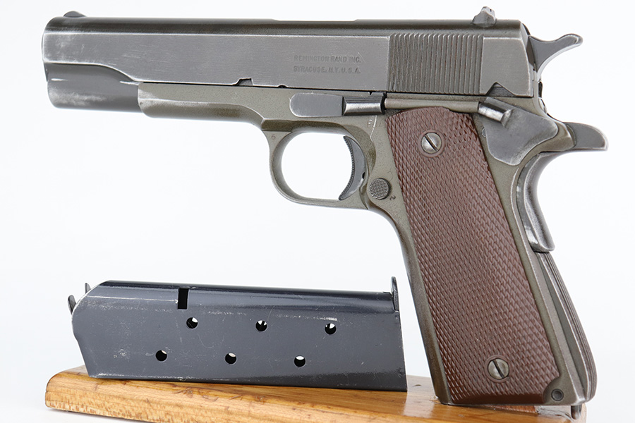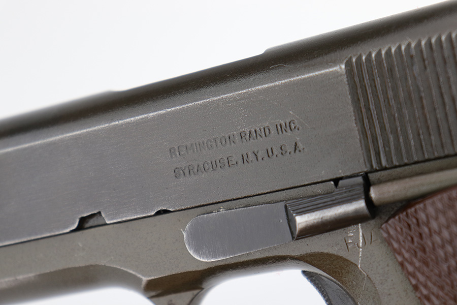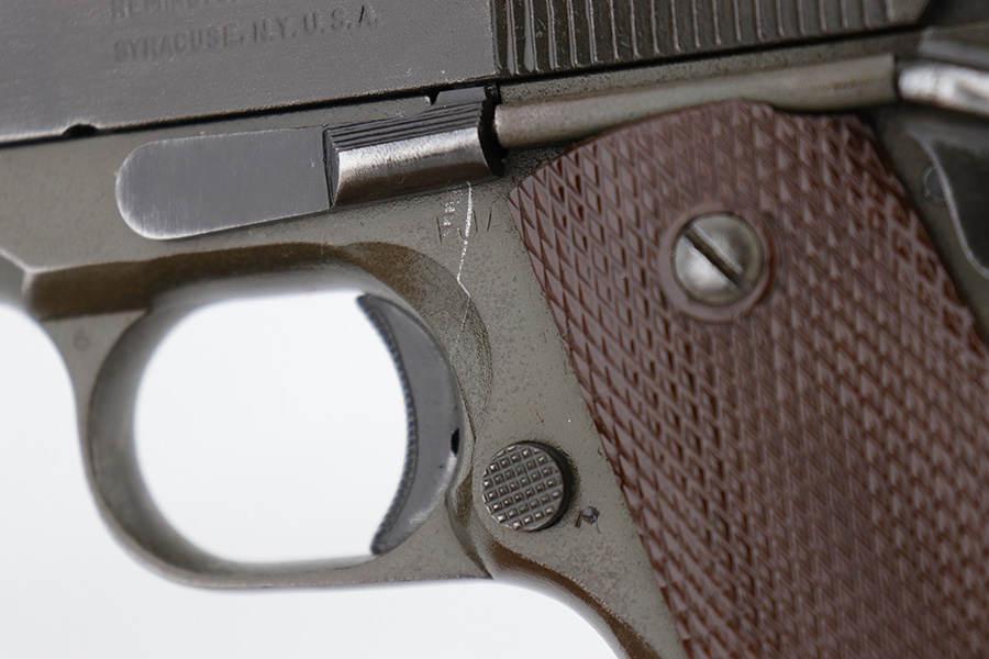 12/19/22 – This is a nice example of a Remington Rand Model 1911A1 issued to the US military in 1944. It is “United States Property” marked, has the proper “FJA” inspection stamp, and has a faint cross-canon military cartouche on the right side of the frame. The slide and frame are slightly different colors, so we believe they have been mated. Period-correct High Standard barrel. The gun has retained about 90% of its original parkerized finish. There is wear around the muzzle, on the high edges of the slide, on the front edge of the frame, and on the grip straps. Light spotty oxidation on the whole frame. Fitted with a set of very nice period-correct reddish plastic grips – one small gouge on the right side. Comes with a reproduction magazine. The bore has good rifling with very minor frosting in the grooves.