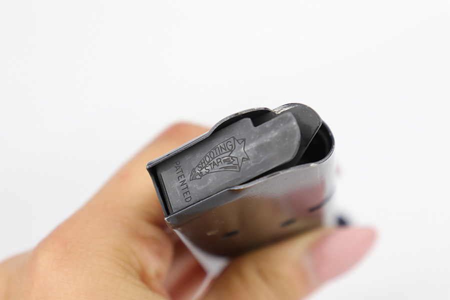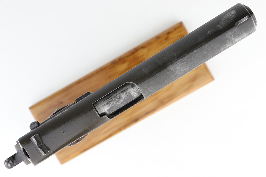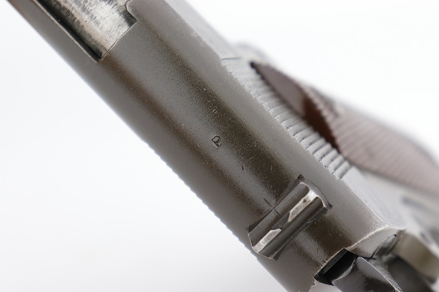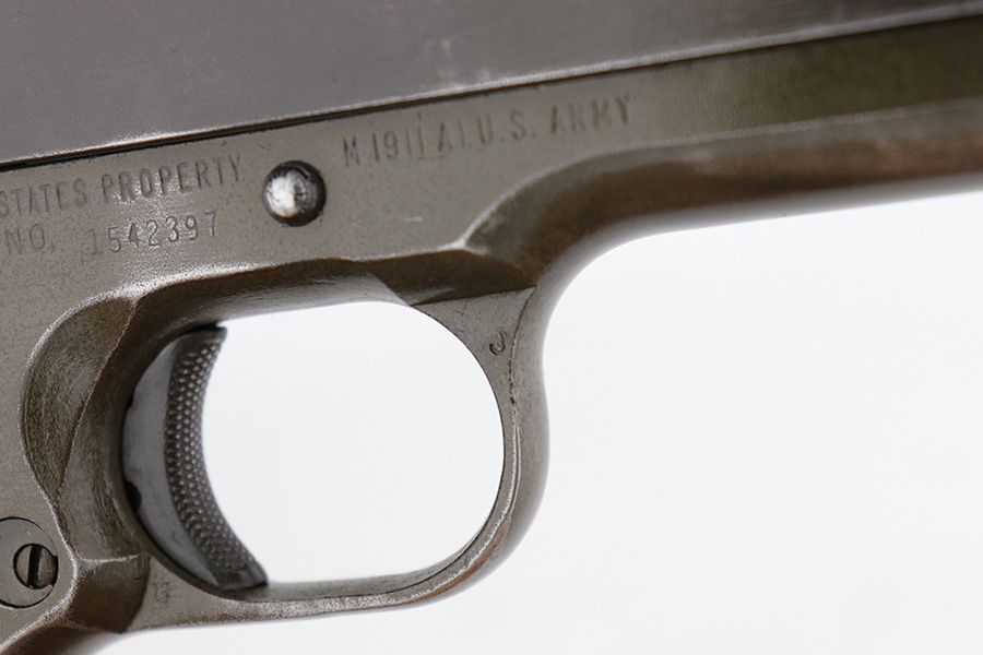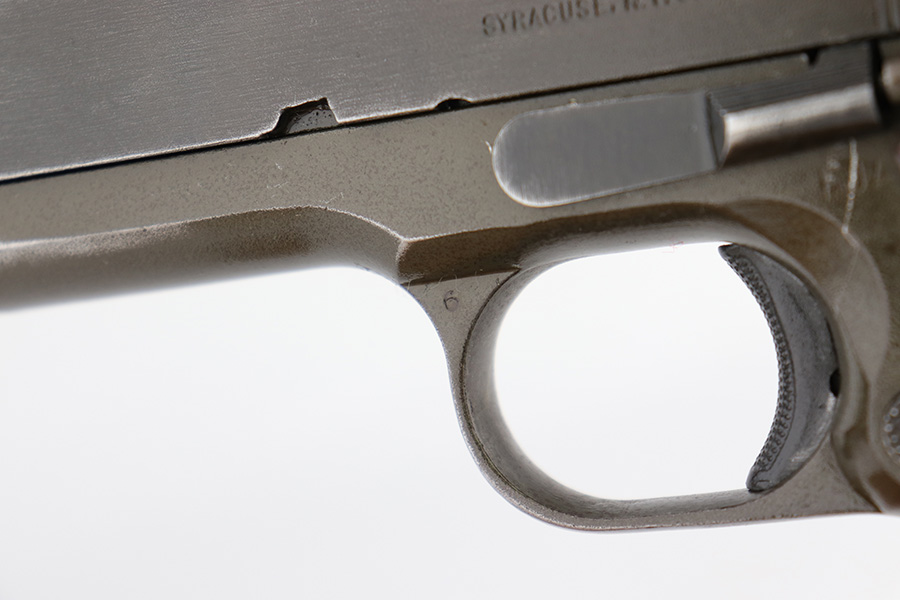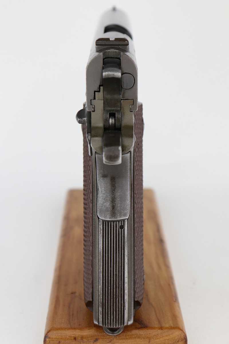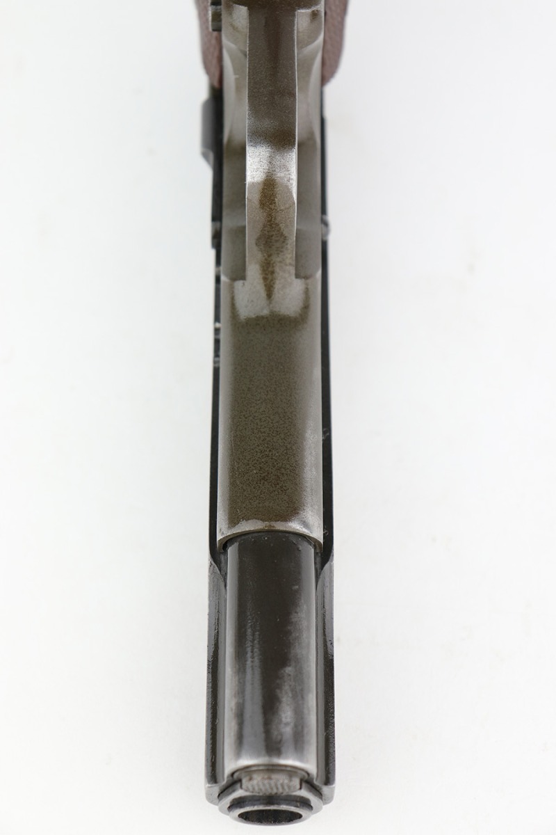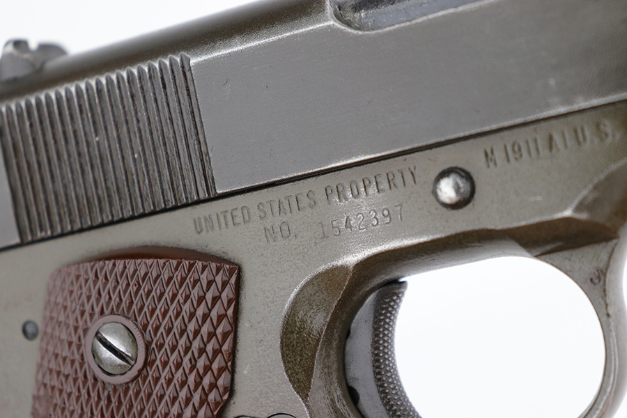 12/19/22 – This is a nice example of a Remington Rand Model 1911A1 issued to the US military in 1944. It is “United States Property” marked, has the proper “FJA” inspection stamp, and has a faint cross-canon military cartouche on the right side of the frame. The slide and frame are slightly different colors, so we believe they have been mated. Period-correct High Standard barrel. The gun has retained about 90% of its original parkerized finish. There is wear around the muzzle, on the high edges of the slide, on the front edge of the frame, and on the grip straps. Light spotty oxidation on the whole frame. Fitted with a set of very nice period-correct reddish plastic grips – one small gouge on the right side. Comes with a reproduction magazine. The bore has good rifling with very minor frosting in the grooves.