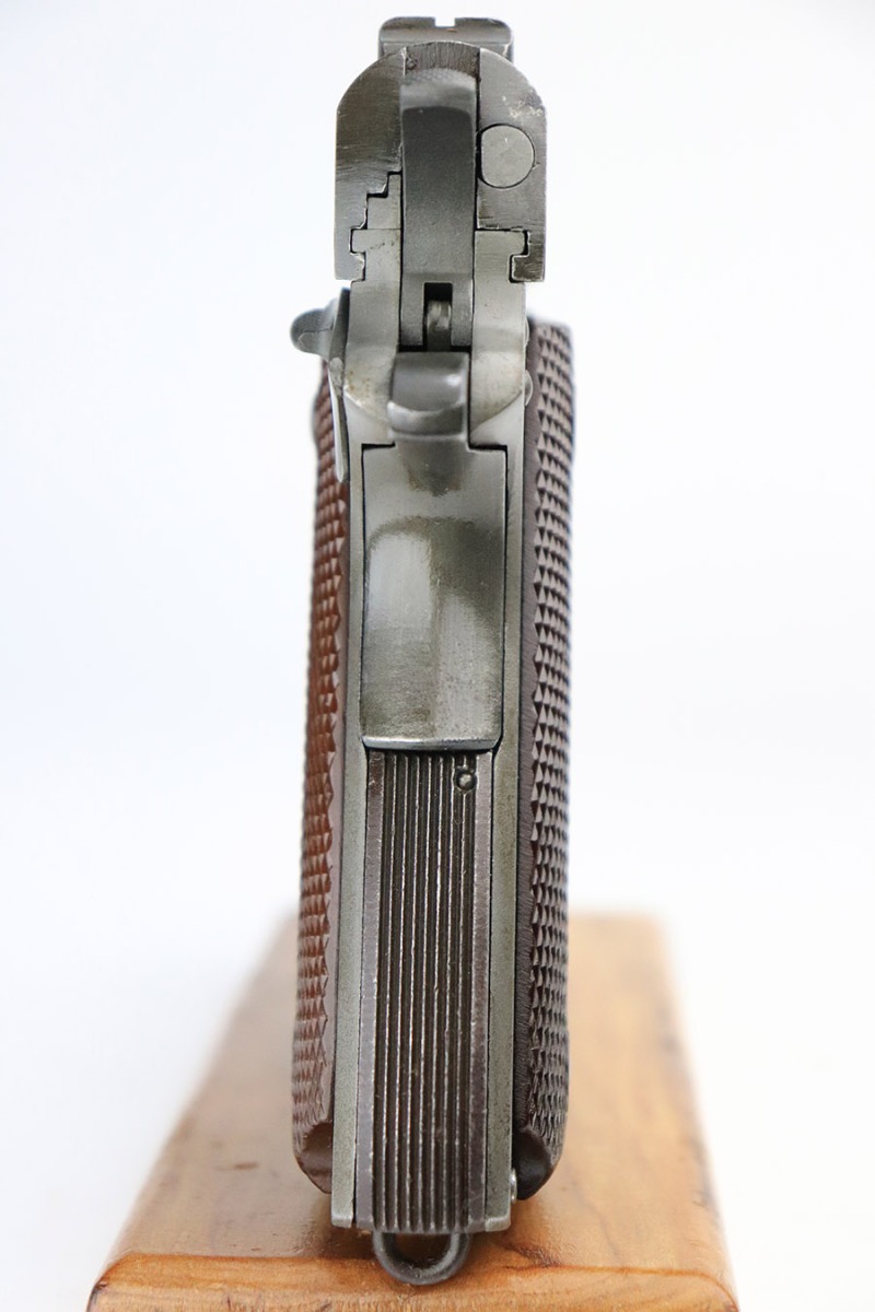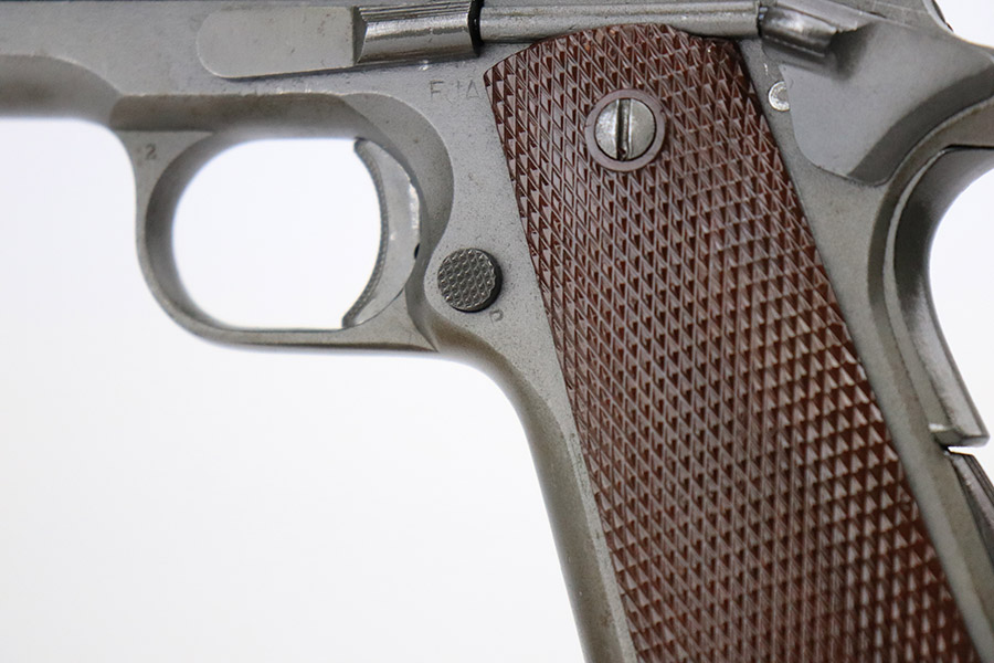 11/17/22 – This is a very nice example of a Remington Rand Model 1911A1 issued to the US military in 1944. It is “United States Property” marked, has the correct “FJA” inspection stamp, and has the faintest remnants of a cross-canon military cartouche on the right side of the frame. There is an “RIA” marking on the right side of the frame as well, indicating this gun was reworked at the Rock Island Arsenal. There is an “EB” marking as well, the inspection marking of the RIA inspector Ernest Blind. Comes with a proper High Standard barrel. Overall, the gun is in very nice condition, but the condition of the slide and frame does not match. There is very minor wear around the muzzle and high edges of the slide. The whole slide is covered in obvious brown patina with some spotty oxidation here and there. Some tiny dots of oxidation on the front strap. Comes with excellent period-correct reddish plastic grips and one magazine. The bore is mint.