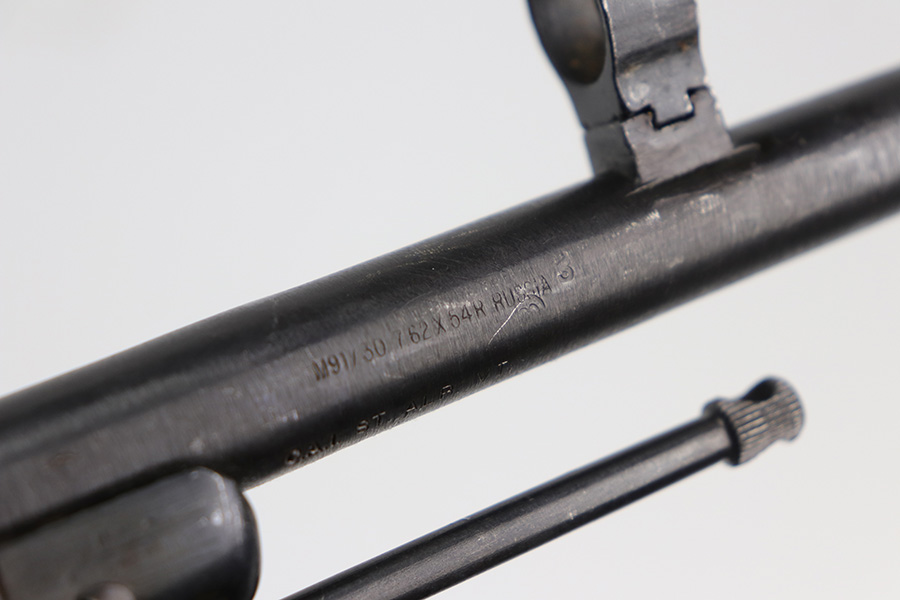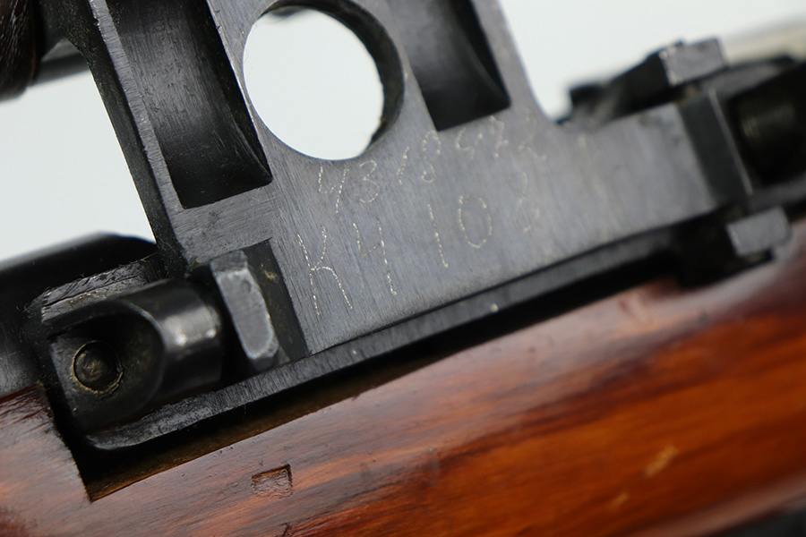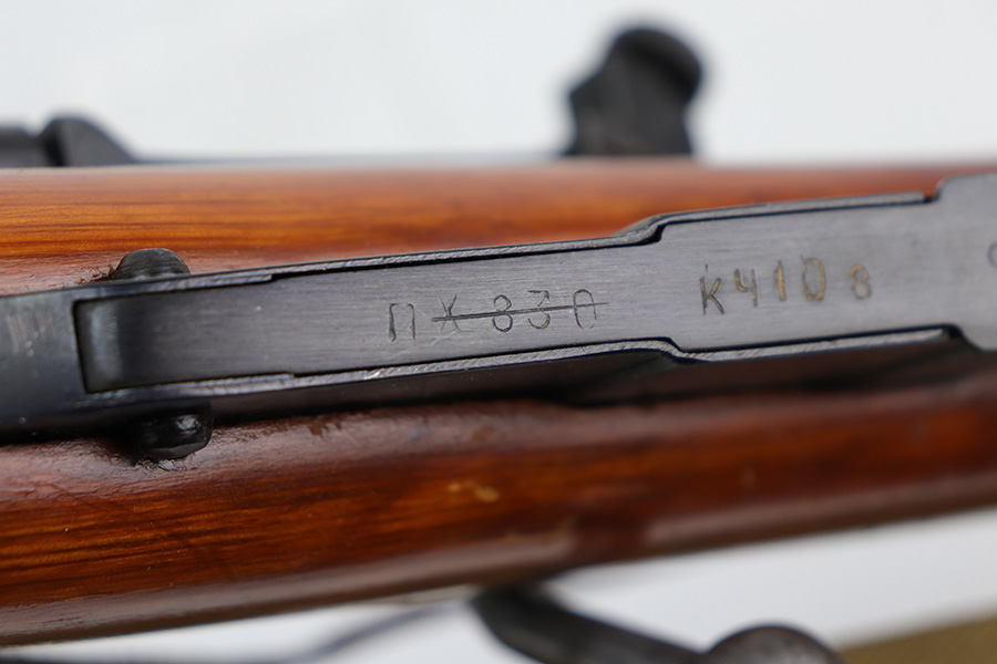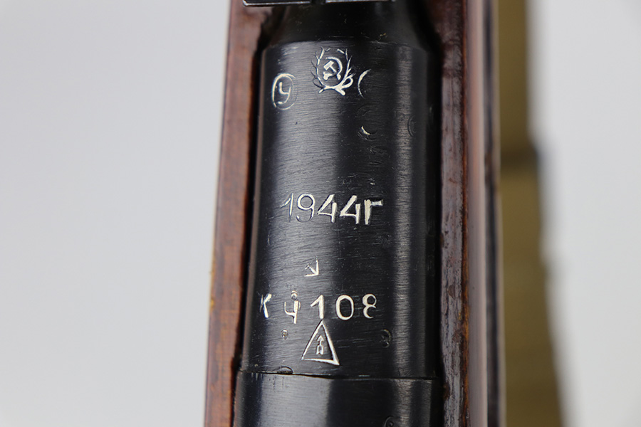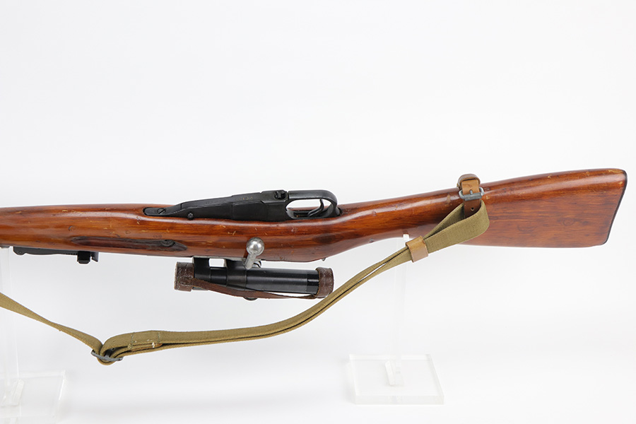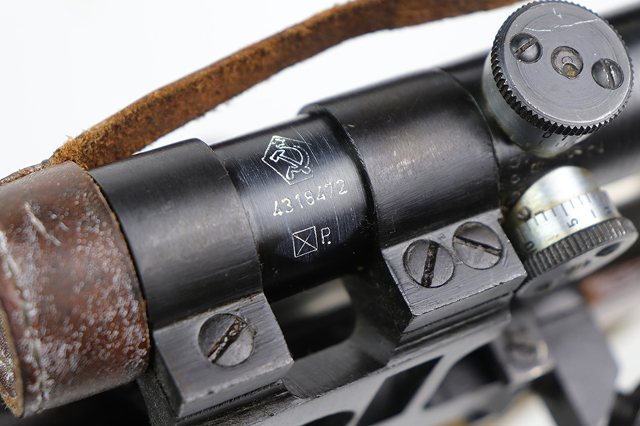 9/10/21 – This is an excellent example of a Mosin-Nagant Model 1891/30 sniper rifle issued to the Soviet military in 1944. The gun is mostly matching, but there is a different number on the receiver and the number on the magazine has been re-numbered. It’s possible the gun has been arsenal-reworked. Import mark on the barrel. The serial number is scratched into the scope mount. The scope is serialized and has the Soviet seal on it. Excellent, clear optics. The gun comes with a leather scope cover and a canvas sling. It has returned most of its bluing with a few very light handling marks here and there. The stock is nice, but there are minor dings throughout. The bore is mint.