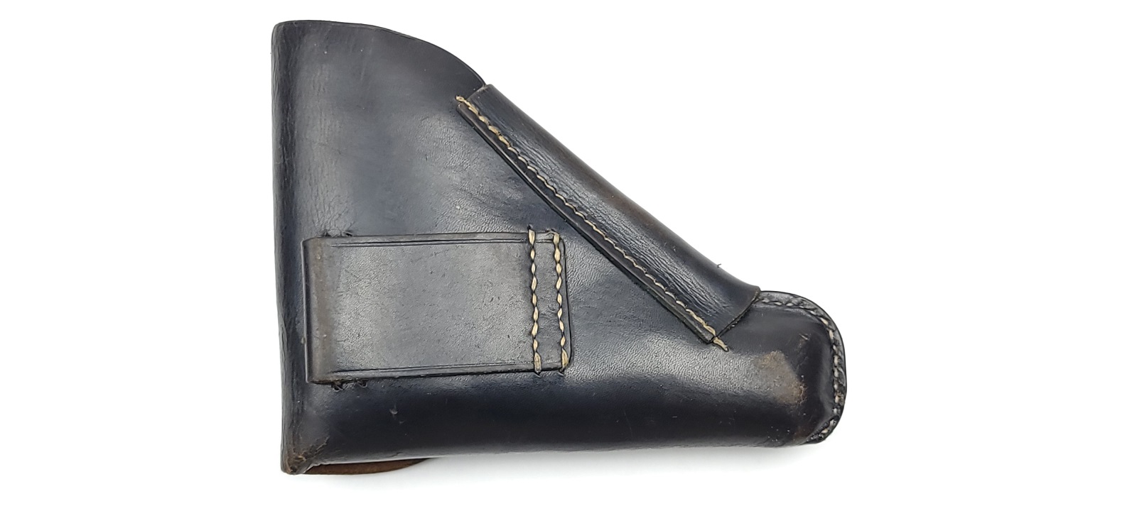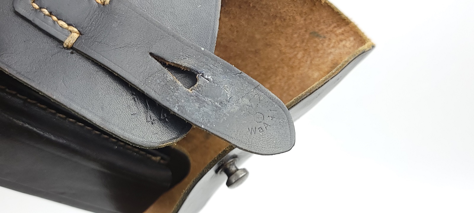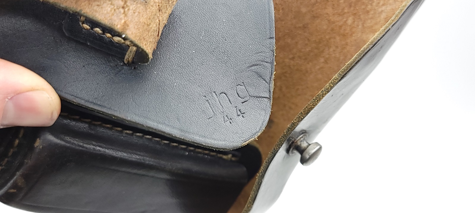 3/8/22 – This is an original waffen proofed 1944 dated holster for a Mauser HSC or Sauer 38h pistol. This style of holster is also appropriate for other 7.65mm Axis pistols, but the 38h and HSC are most commonly found with this style. The holster is waffen proof stamped on the closure strap. There appears to be a repair of the opening hole on the closure strap – see photos. This is very minor and doesn’t affect functionality. There’s a maker stamp and date under the closure strap. No notable issues with stitching or leather.