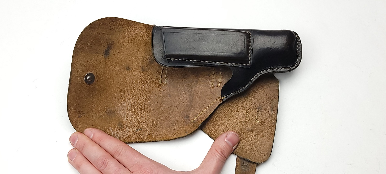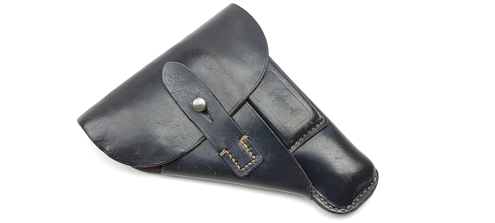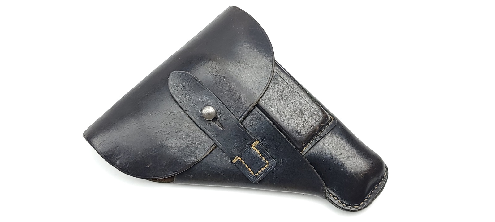 3/8/22 – This is an original waffen proofed 1944 dated holster for a Mauser HSC or Sauer 38h pistol. This style of holster is also appropriate for other 7.65mm Axis pistols, but the 38h and HSC are most commonly found with this style. The holster is waffen proof stamped on the closure strap. There appears to be a repair of the opening hole on the closure strap – see photos. This is very minor and doesn’t affect functionality. There’s a maker stamp and date under the closure strap. No notable issues with stitching or leather.