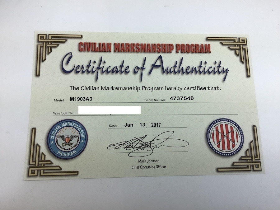 7/25/23 – This is an excellent example of a Smith-Corona Model 03-A3 rifle issued to the US military during WW2. This is a CMP refurbished rifle that includes a CMP Certificate. The serial number on the receiver dates it to 1944. The barrel is S-C marked and dated June of 1943. The stock is un-marked and has a small repair on the left side of the front fore guard. The finish on the metal parts a have been CMP-refinished. In any case, the gun is in excellent condition overall with just minor use wear. The bore rates a strong 8 of 10 with very good rifling. Includes the CMP certificate, however, the previous owner requested the name be blacked out upon sale.
