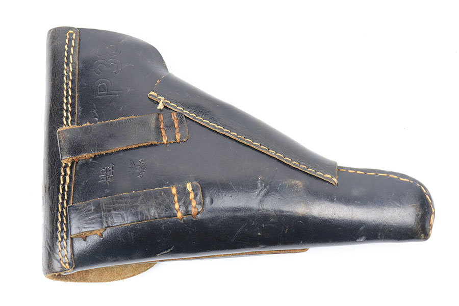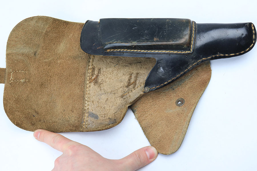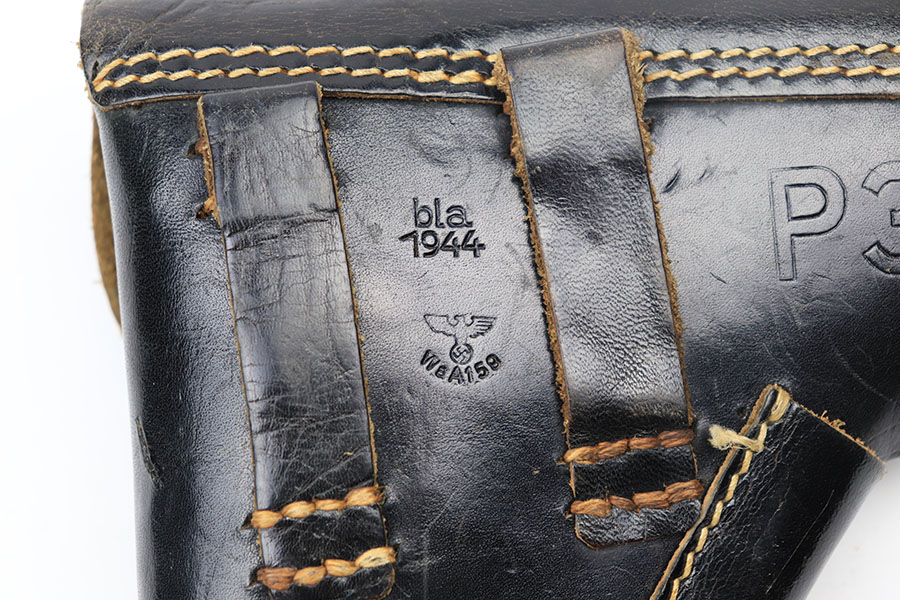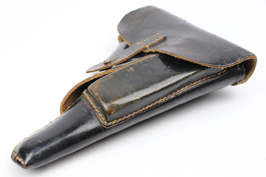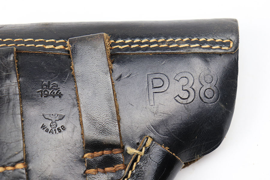 3/4/21 – This is an original WW2 production P.38 holster. The holster is softshell style, as is commonly found for late war production holsters. The holster is dated 1944, maker stamped, waffen proofed, and P.38 stamped on the back leather. The black leather is in great overall condition with some minor surface wrinkling on the front but no major issues. The stitching is all original and in tact. Fairly clean interior leather.