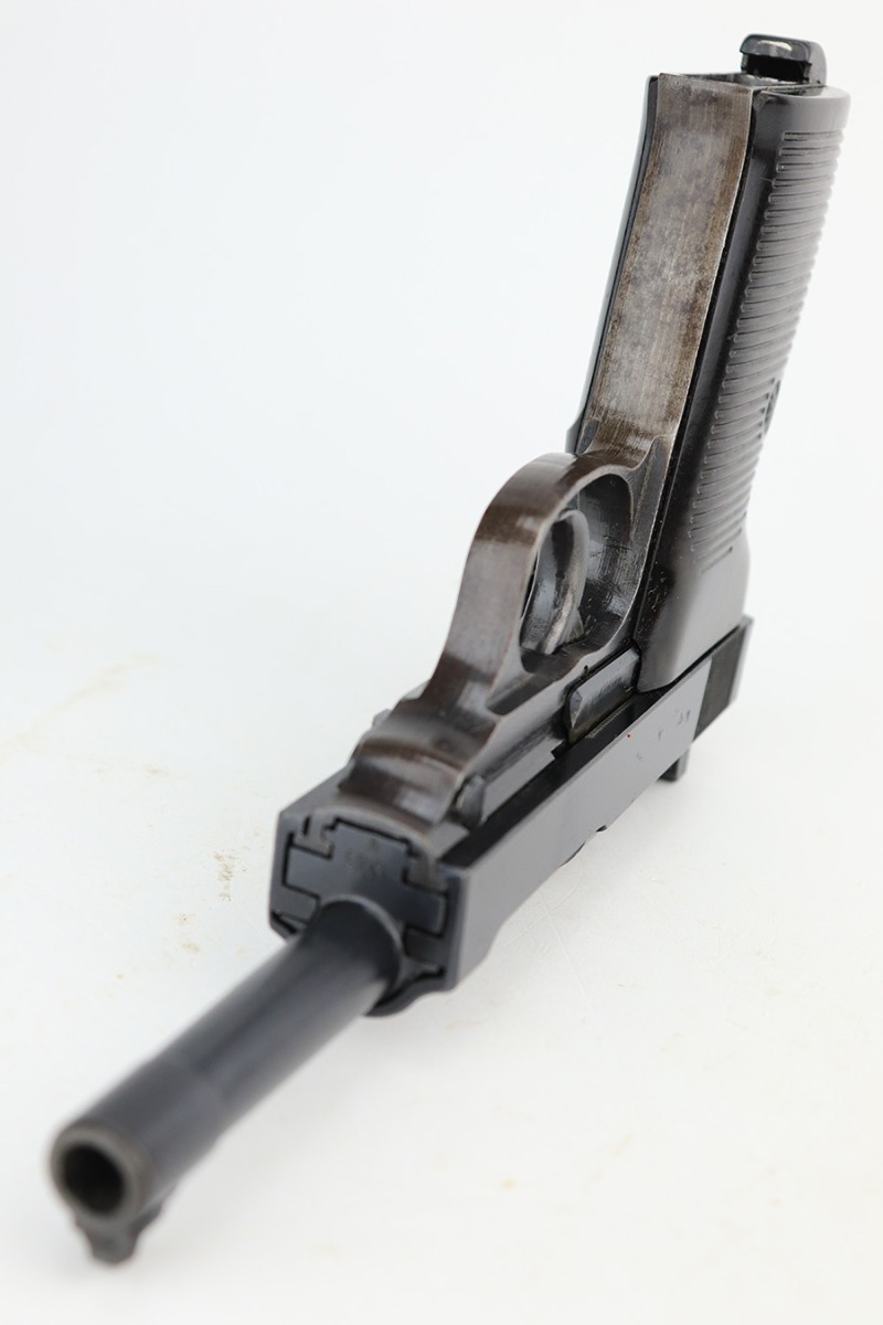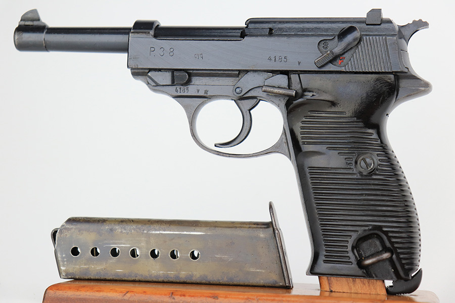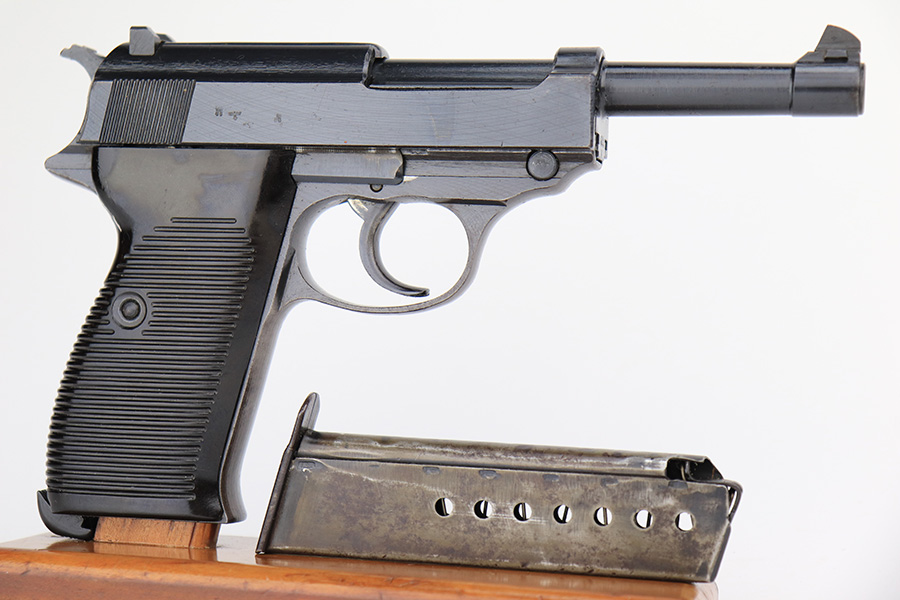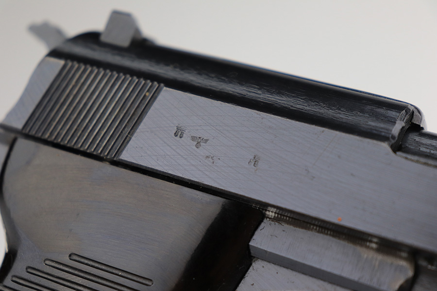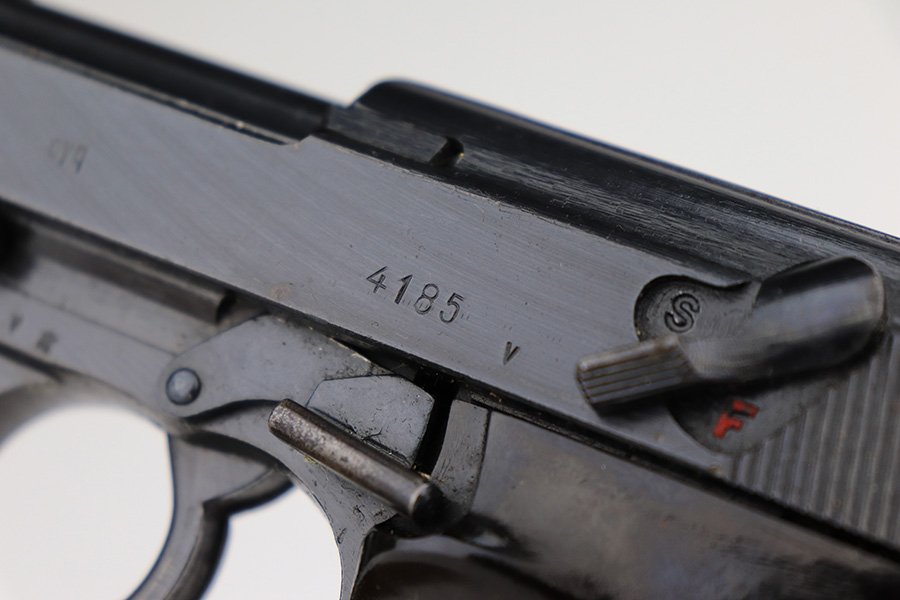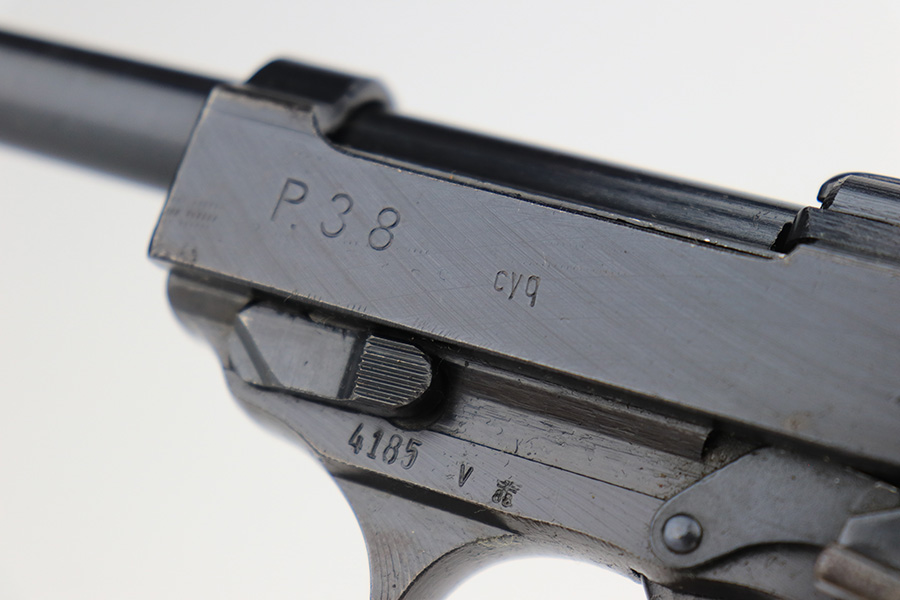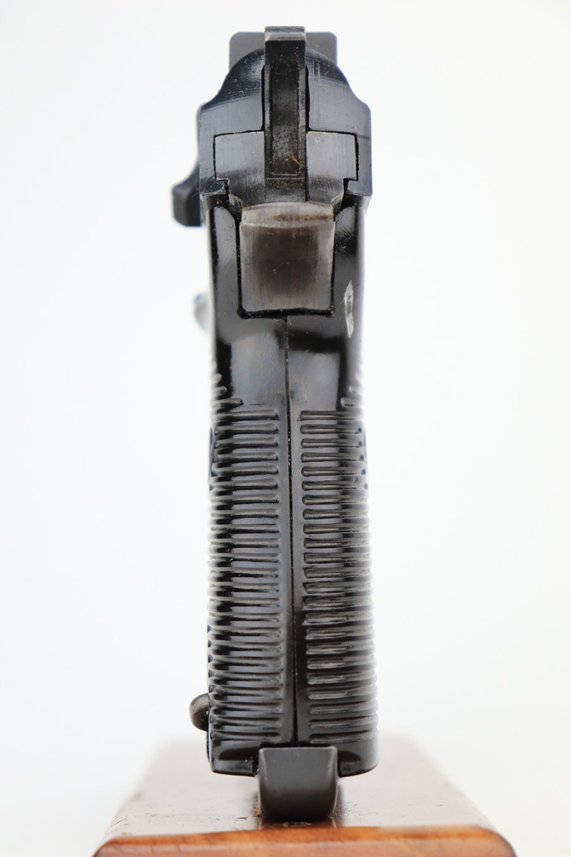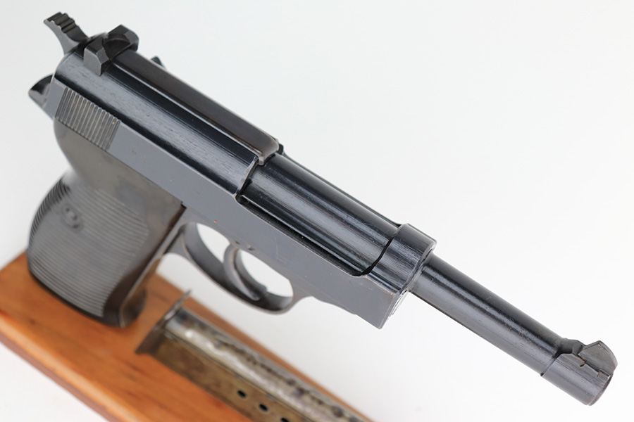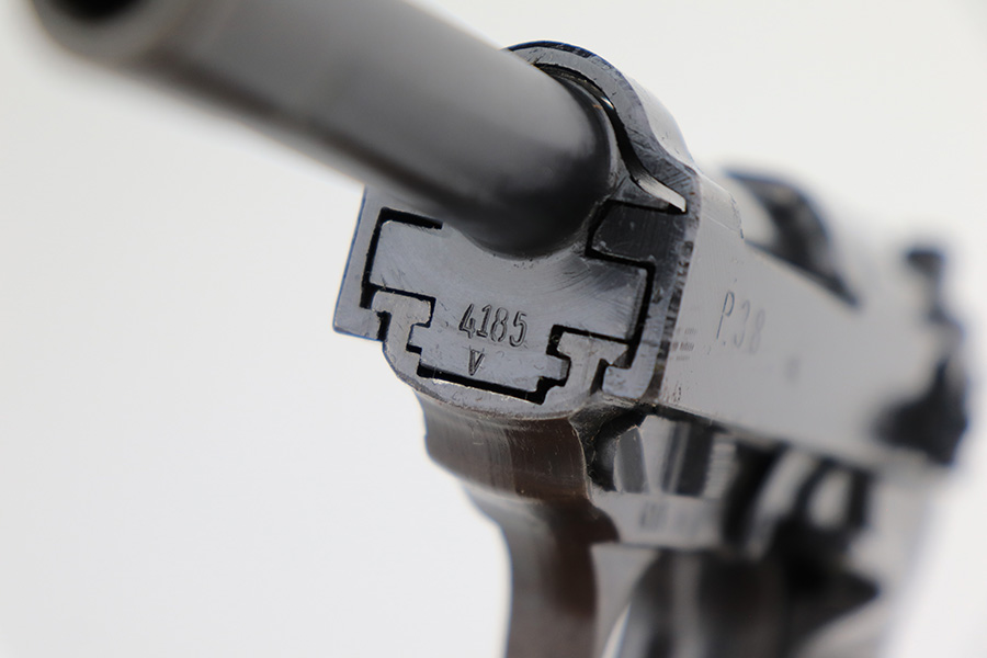 4/18/23 – This is a very nice example of Spreewerk P.38 issued to the Nazi military in October of 1944. It is all matching and has the proper “Eagle 88” military acceptance proofs throughout. There is an asterisk marking on the barrel, indicating it failed initial inspection and was repaired at the factory. This is a desirable trait for collectors. Late-war cog-style hammer. The gun has retained about 94-95% of its original finish. The majority of the wear is on the front strap, so the profile views are minty. Light spotty oxidation on the front strap and underside of the trigger guard. Excellent blackish-brown bakelite grips. Comes with a period-correct jvd magazine. Mint bore. De-cocker is functional.