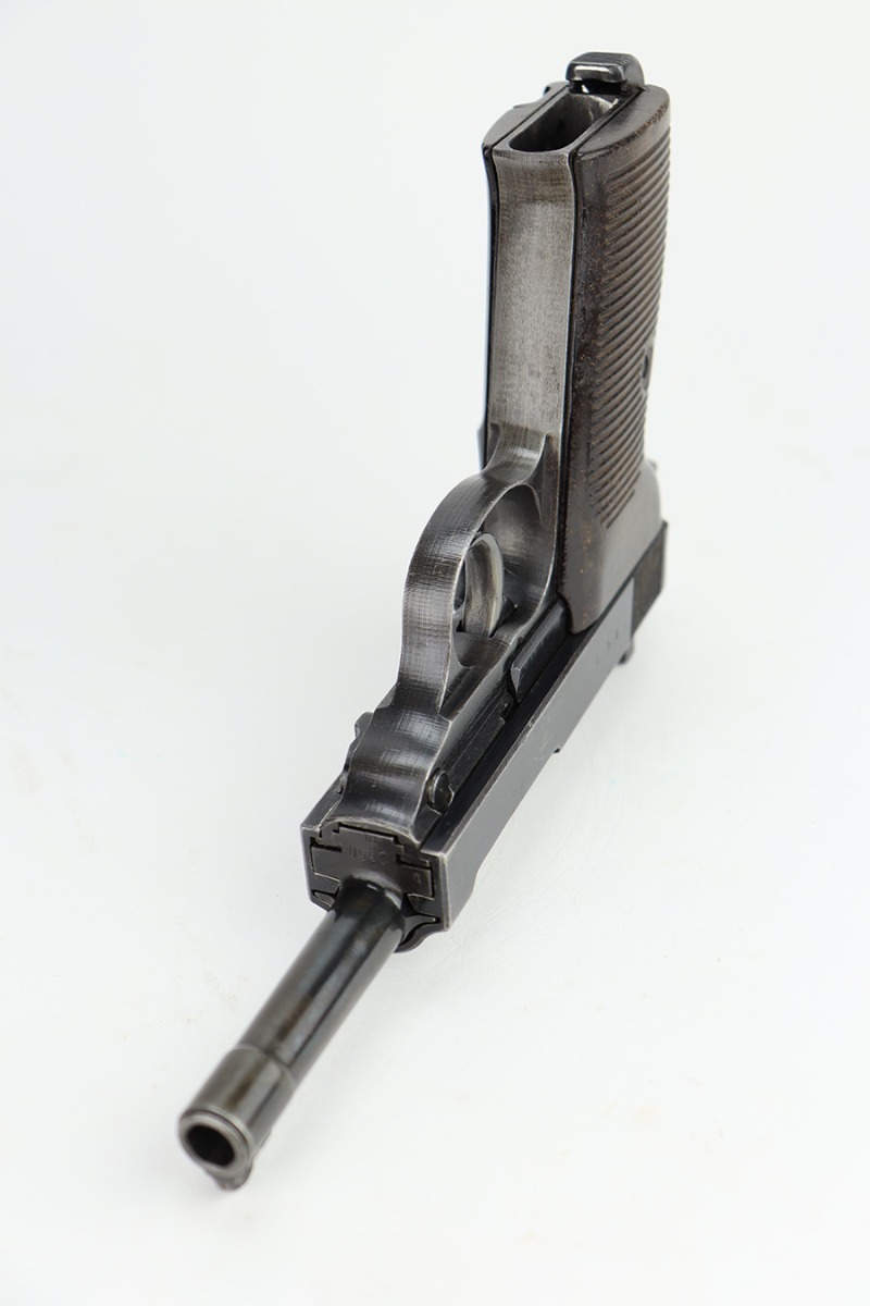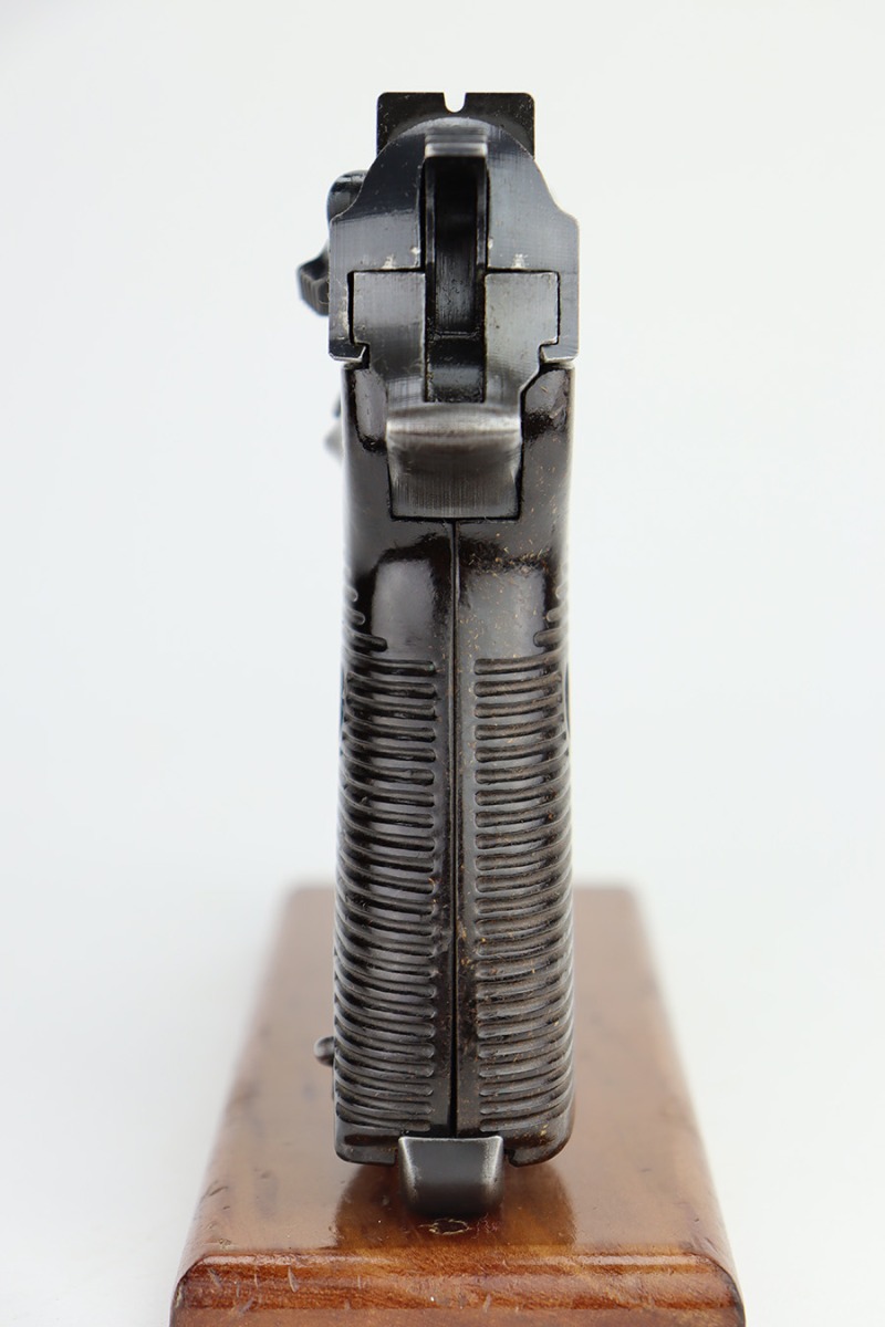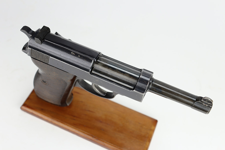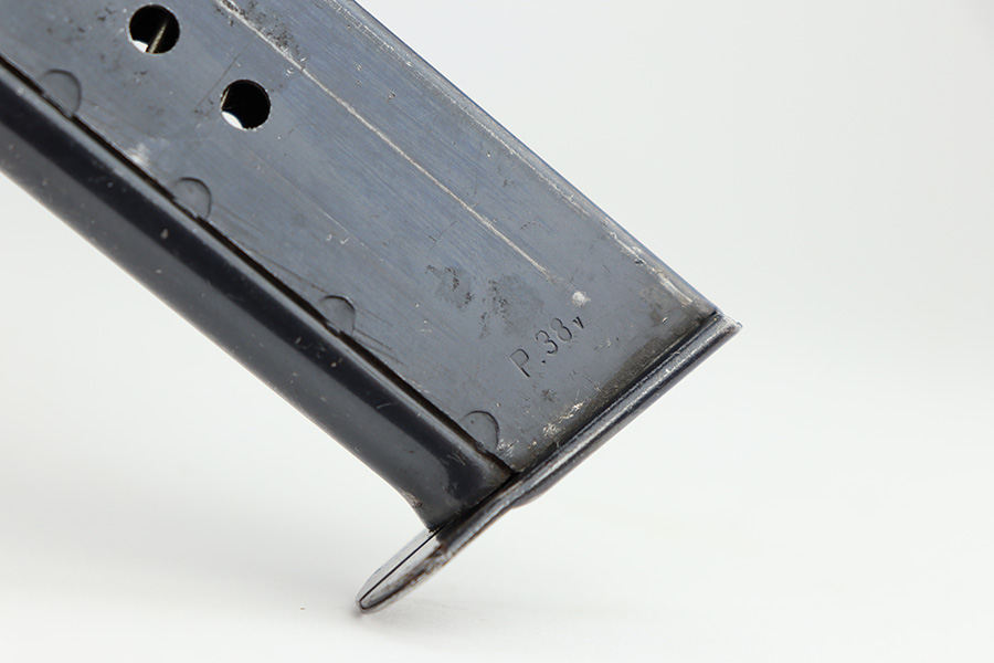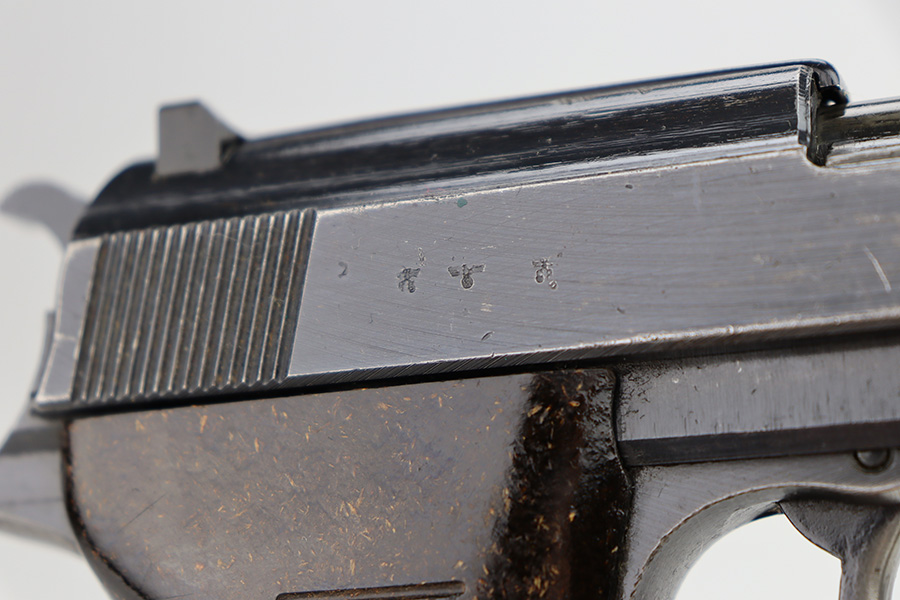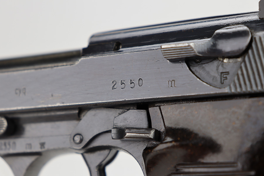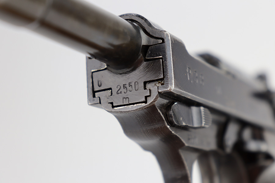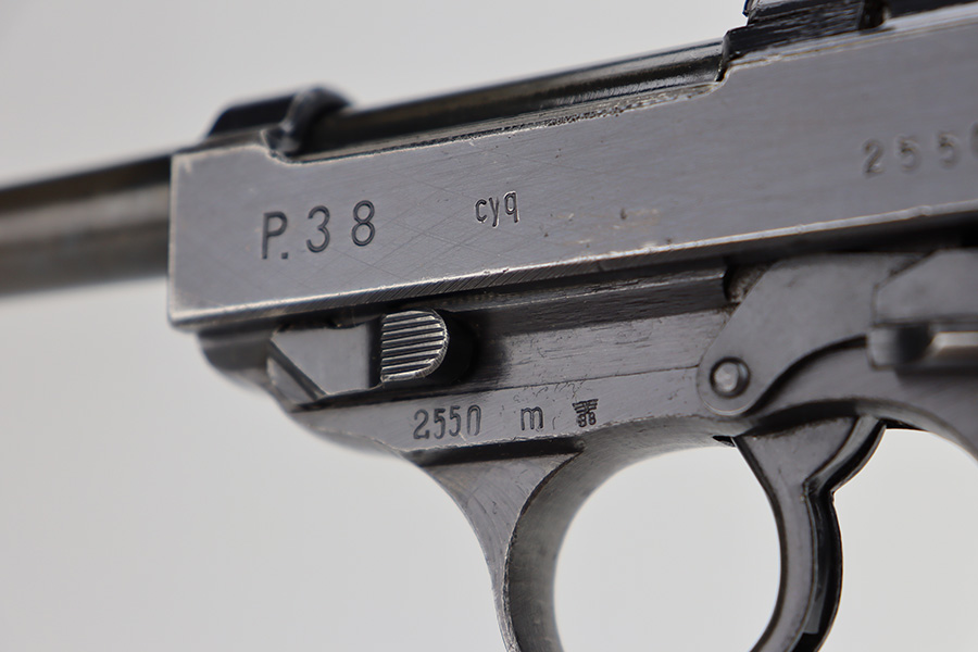 11/13/23 – This is a nice example of a Spreewerk P.38 issued to the Nazi military in about February of 1944. It is all matching and has the proper “Eagle 88” military acceptance proofs throughout. The top plate has been replaced. It has retained roughly 85% of its finish. The majority of the finish loss is on the front strap, but there is spotty discoloration on the barrel which we believe has been touched up with cold-blue. Fitted with period-correct bakelite grips and comes with an “Eagle 359” marked Walther magazine. Very nice bore with great rifling. De-cocker is functional.