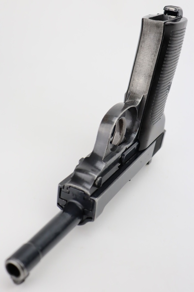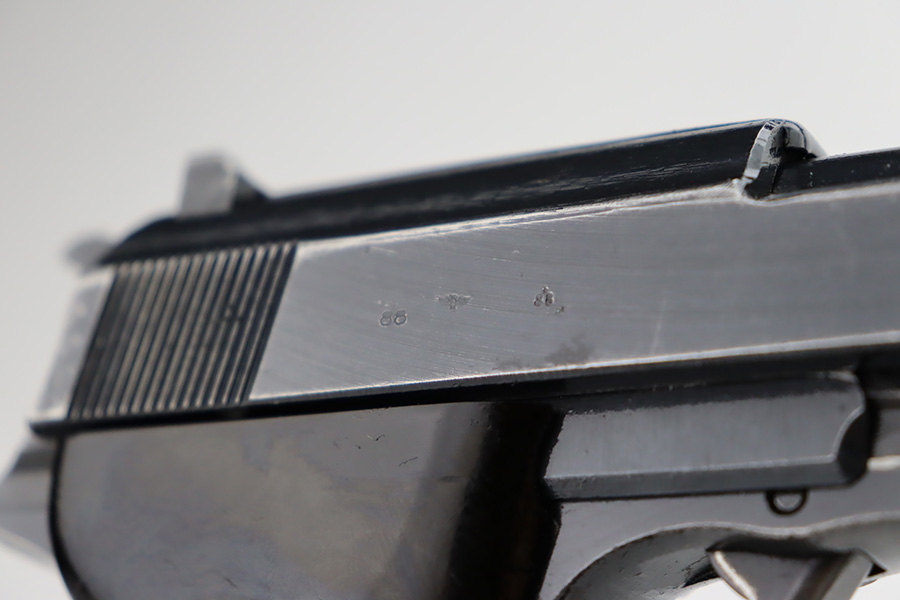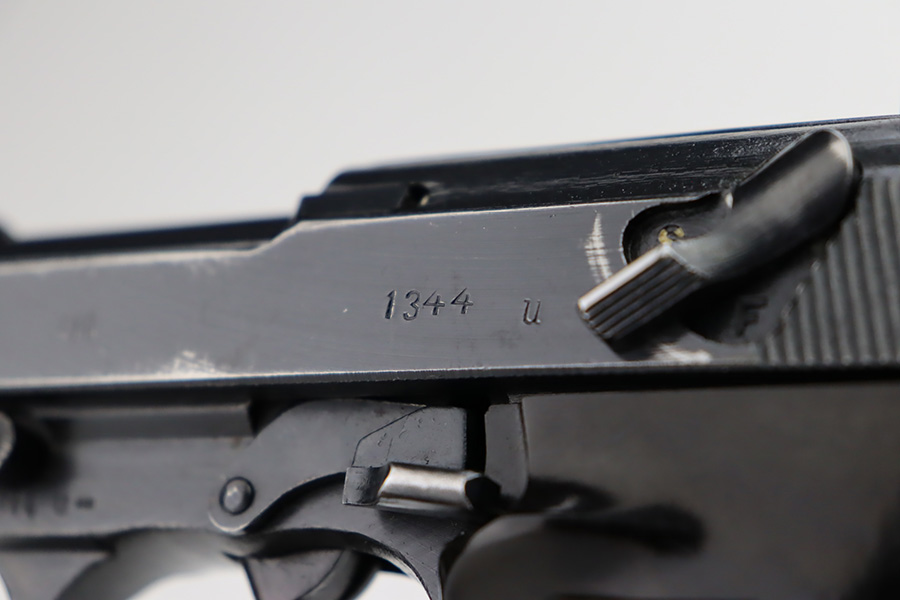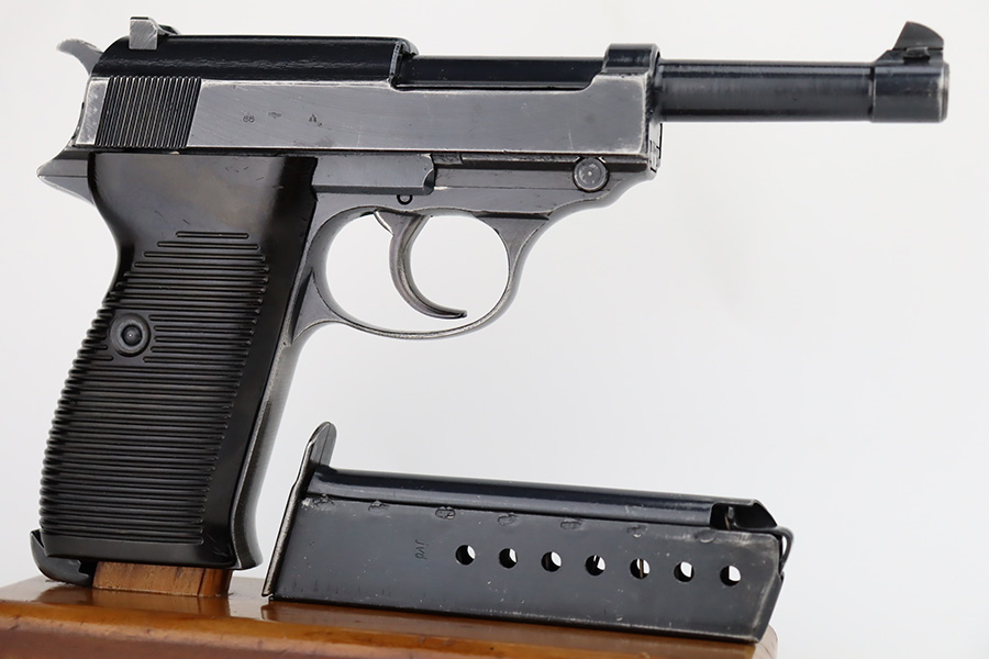 10/4/23 – This is a very nice example of a Spreewerk P.38 issued to the Nazi military in about September of 1944. It is all matching with the proper “Eagle 88” proofs throughout. This one also has a rare “wa” maker code on the right side of the barrel. The bluing rates roughly 85%. The majority of the finish loss is on the front strap, so the profile views are actually very nice. Minor wear around the muzzle and on the high edges in general. Fitted with excellent black bakelite grips. Comes with a period-correct jvd magazine. Mint bore. De-cocker is functional.