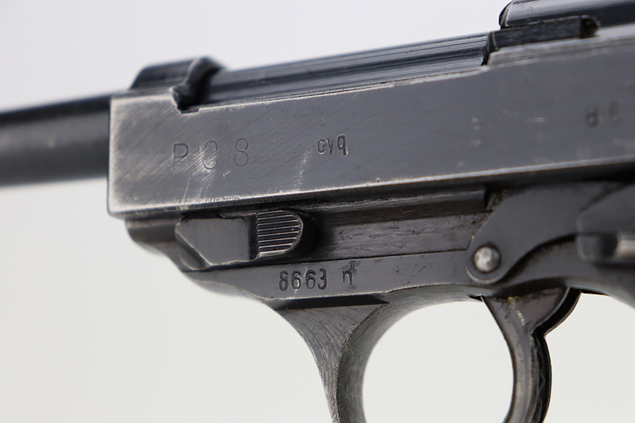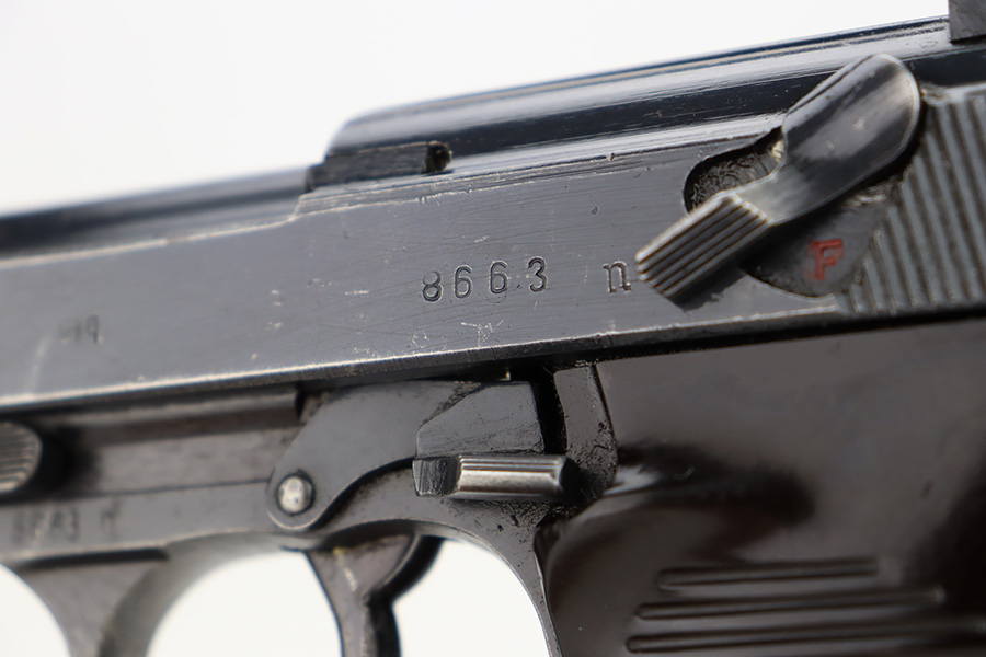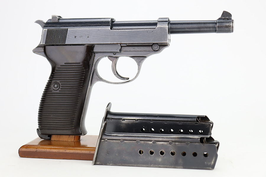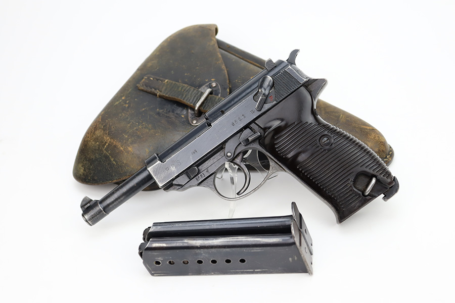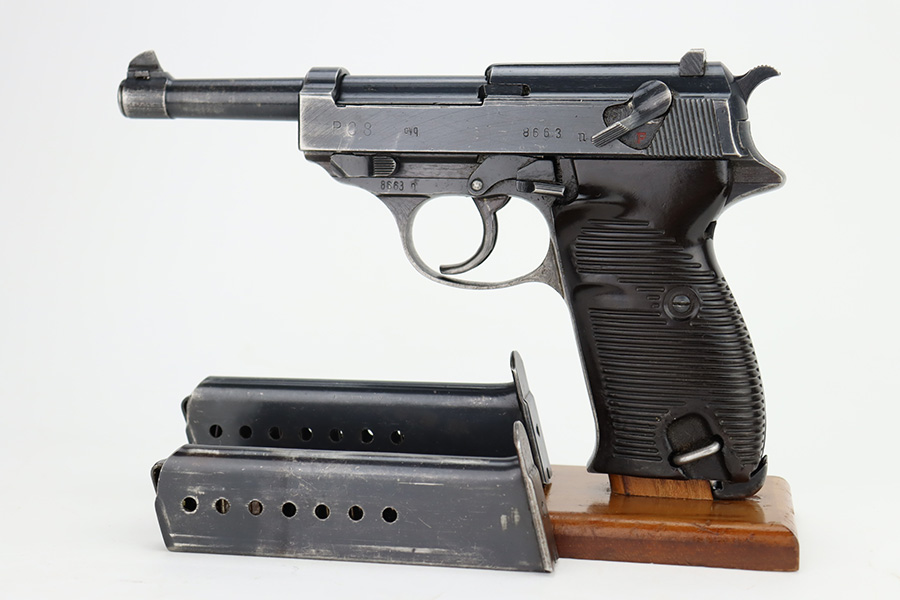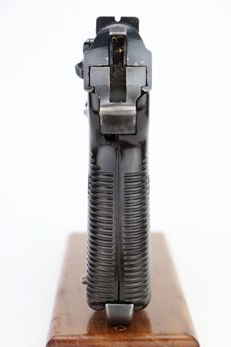 12/1/23 – This is a nice Spreewerk P.38 issued to the German military in April of 1944. All matching with the proper “Eagle 88” military acceptance proofs. It comes as a rig with a nice hard shell holster, one “Eagle 359” marked magazine, and one jvd magazine. The bluing rates roughly 80% with general high edge wear, wear around the muzzle, and thinning on the underside of the frame and front strap. Fitted with excellent blackish-brown bakelite grips. Minty bore. De-cocker is functional.