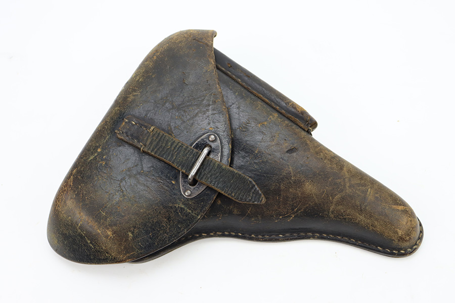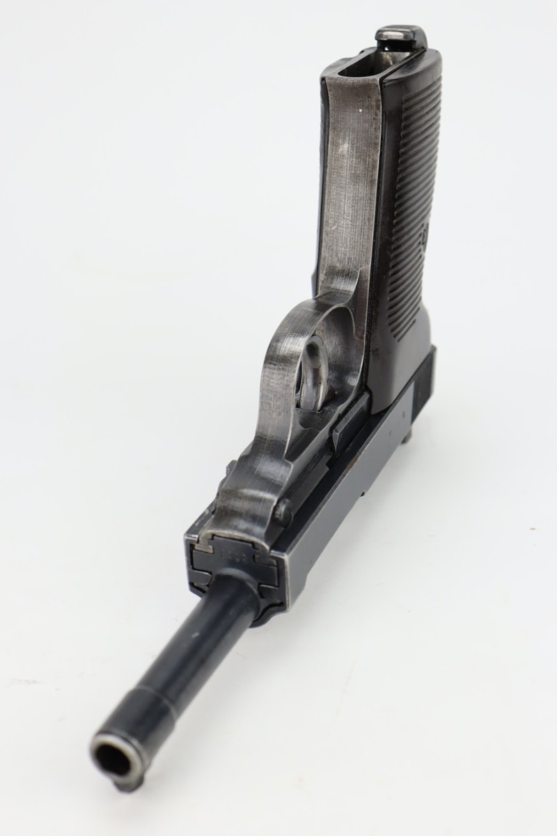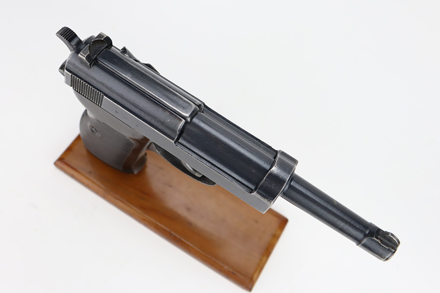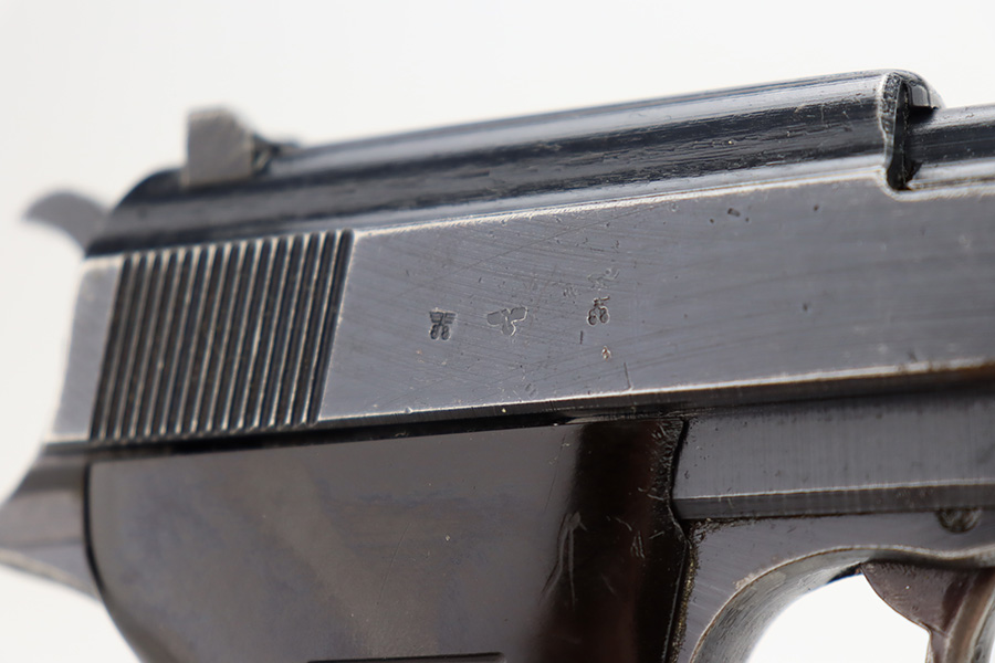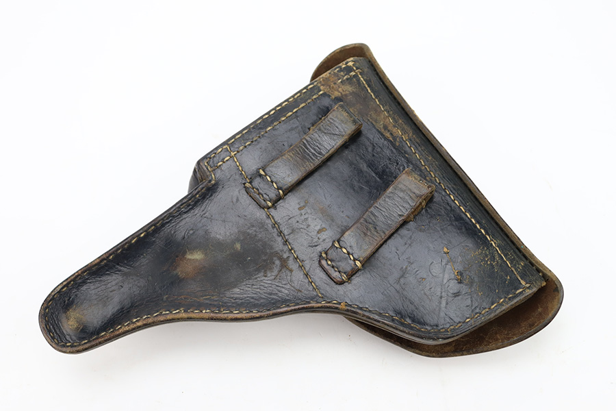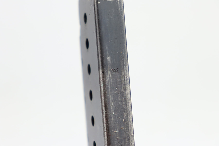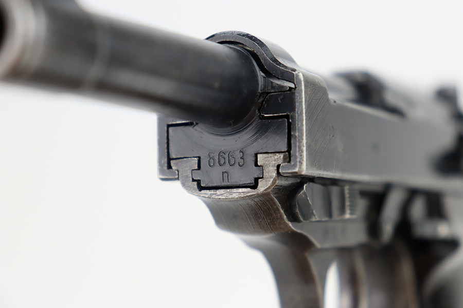 12/1/23 – This is a nice Spreewerk P.38 issued to the German military in April of 1944. All matching with the proper “Eagle 88” military acceptance proofs. It comes as a rig with a nice hard shell holster, one “Eagle 359” marked magazine, and one jvd magazine. The bluing rates roughly 80% with general high edge wear, wear around the muzzle, and thinning on the underside of the frame and front strap. Fitted with excellent blackish-brown bakelite grips. Minty bore. De-cocker is functional.