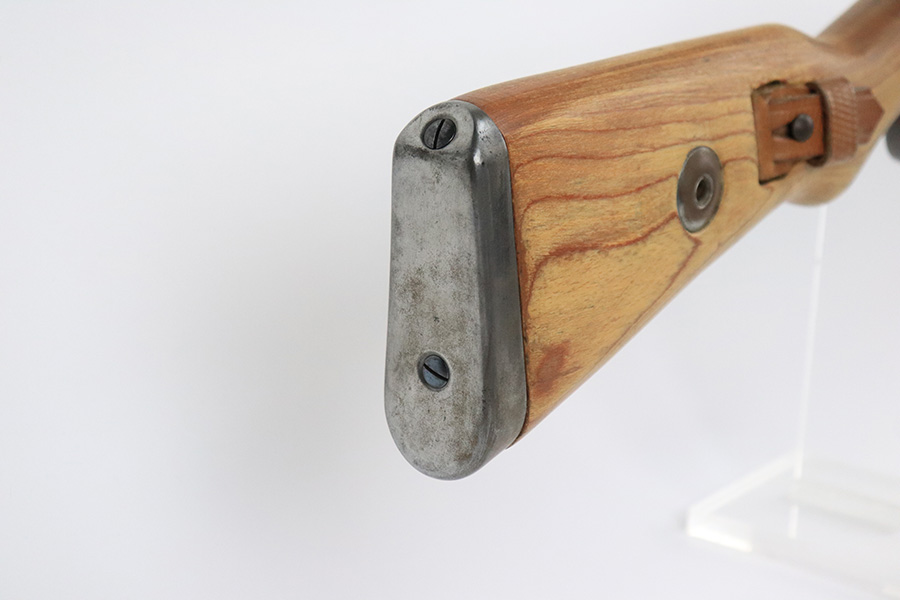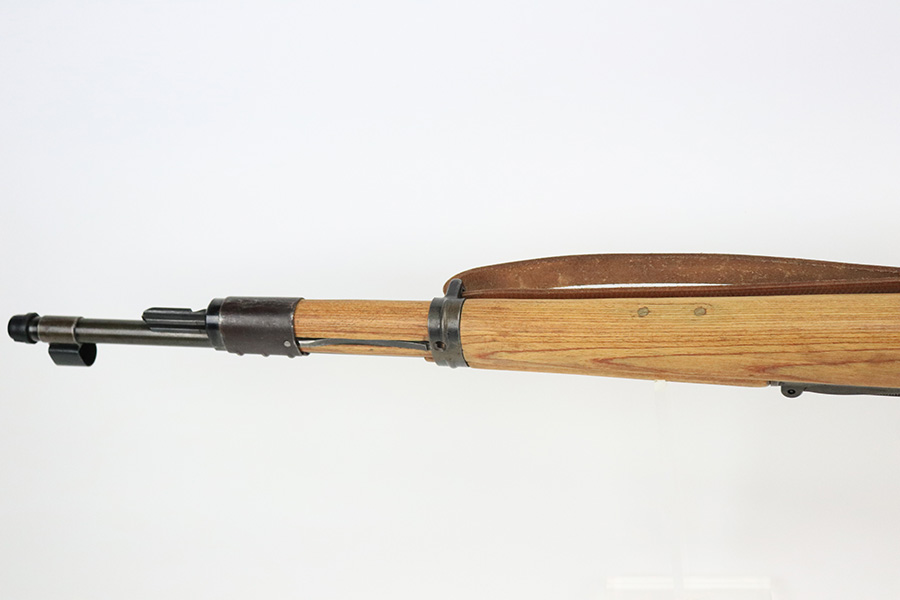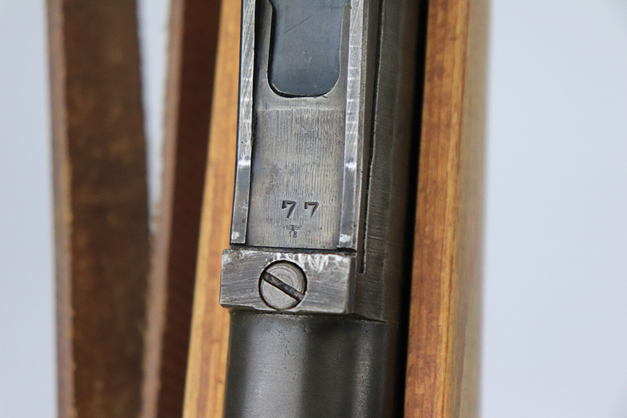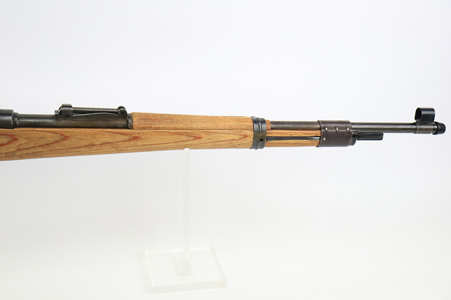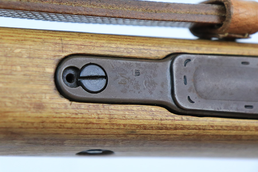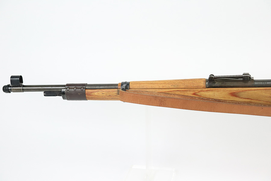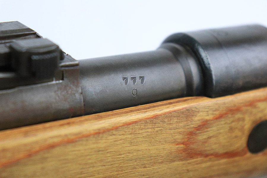 8/17/22 – This is an excellent example of a 1944 Steyr-made K98 rifle with a rare “bnz” factory code. All of the numbered parts are matching, and it has the proper military acceptance proofs throughout. The floor plate and trigger group have “byf” Mauser factory codes, so they were likely replaced. The rear barrel band was replaced. The stock is un-numbered and was likely replaced – there is a waffen proof on the right side of the butt stock that was likely reapplied. The bayonet lug is missing a screw and moves freely. The rear barrel band does not lock in, so both barrel bands move freely as well. Overall, the gun is in excellent condition. There is minor muzzle wear and light spotty oxidation on the barrel and receiver. Brown patina on the floor plate and trigger group. The wood stock is excellent. There are small wood repairs on the underside of the butt stock and underside of the stock just behind the rear barrel band. The gun comes with an excellent leather sling and muzzle cap. Excellent bore – shiny with strong rifling.
