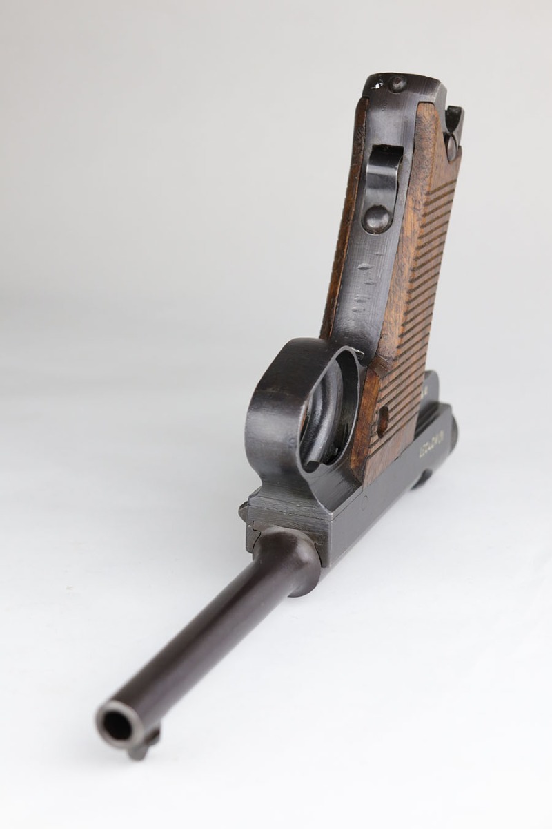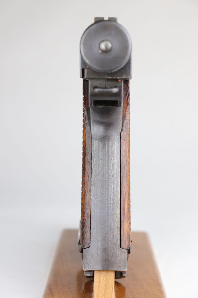 4/15/20 – This is an all matching and original Type 14 Nambu from April of 1944, down to the grips and magazine! The pistol has excellent bluing overall, with minor thinning on the high edges, and a bit of general dulling of the blue on the straps. Pistol has a mint bore and beautiful grips. Late-war configuration with large trigger guard.