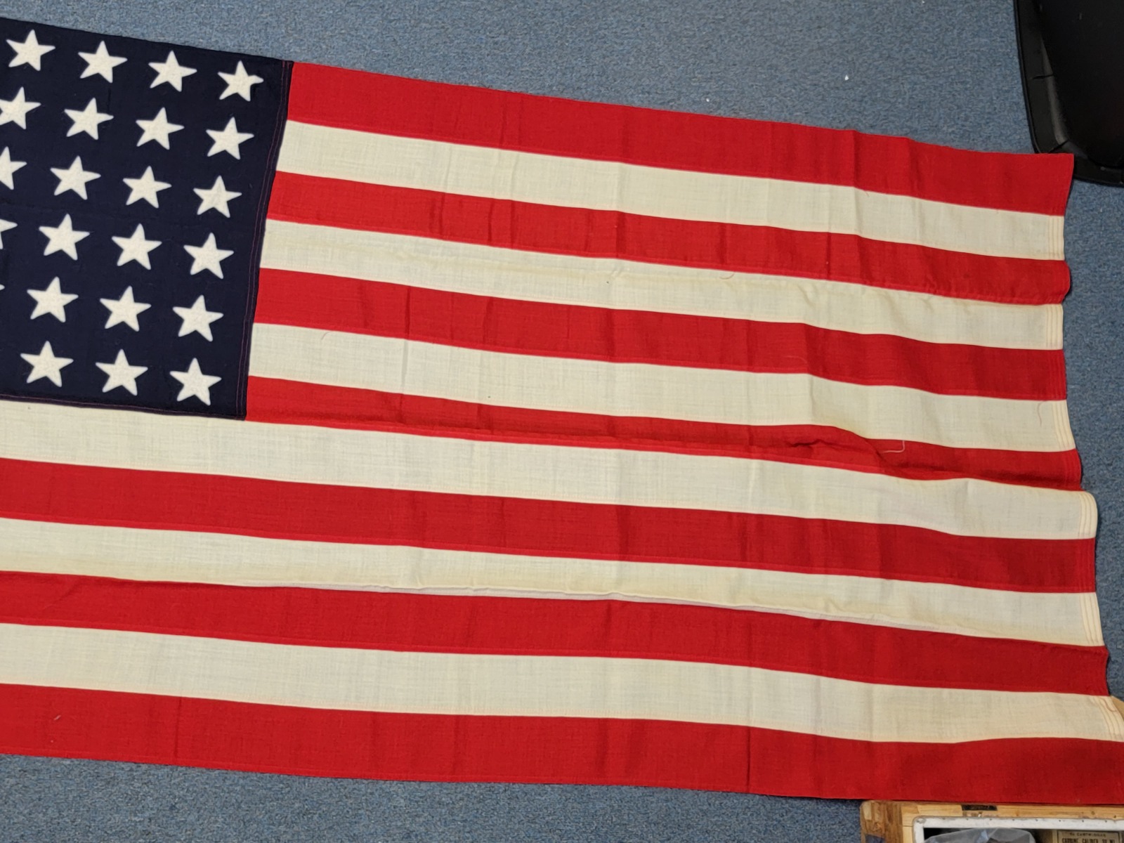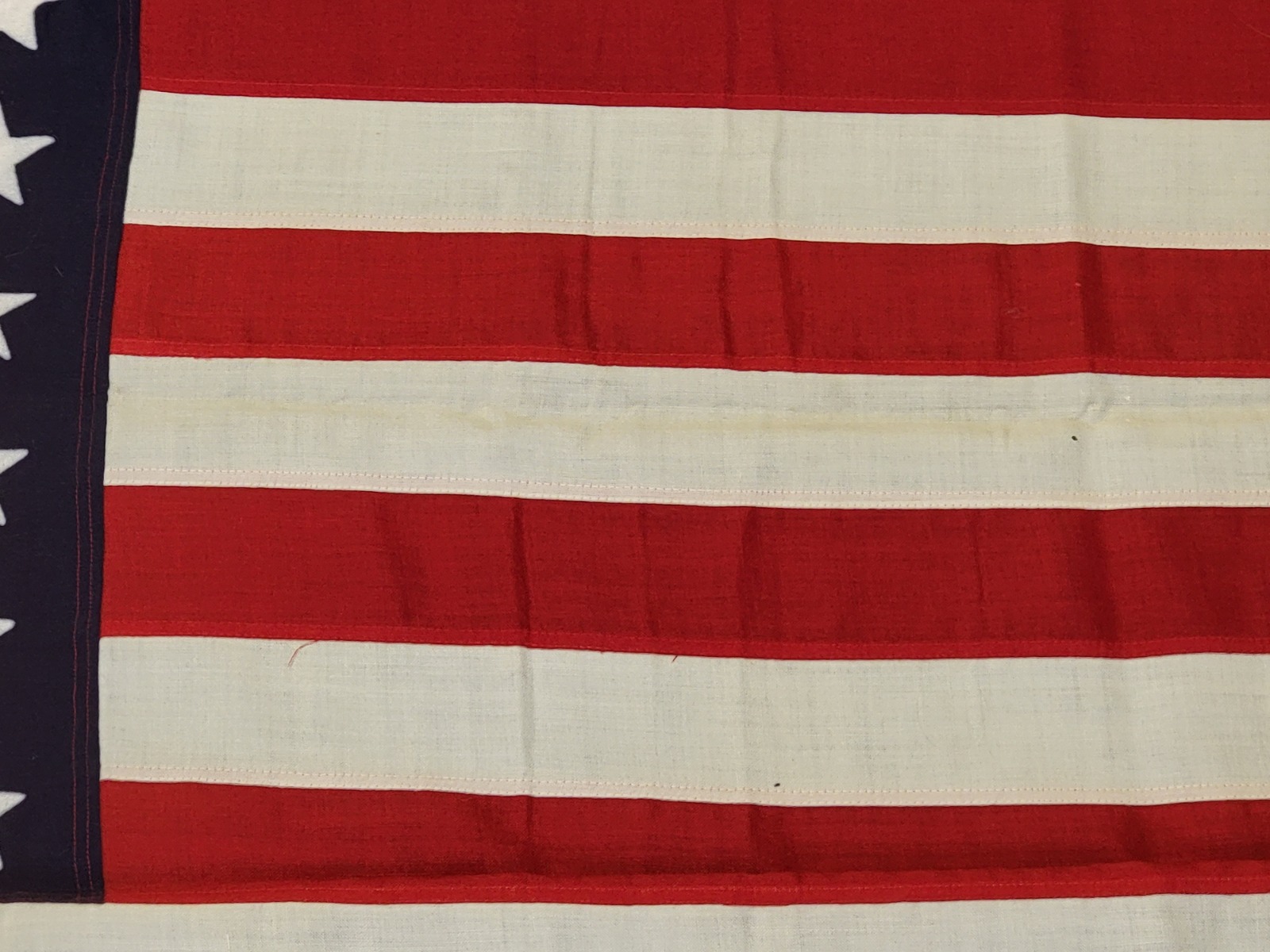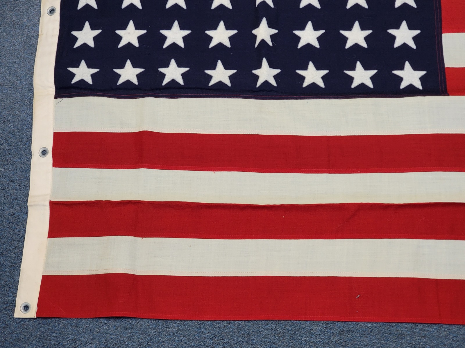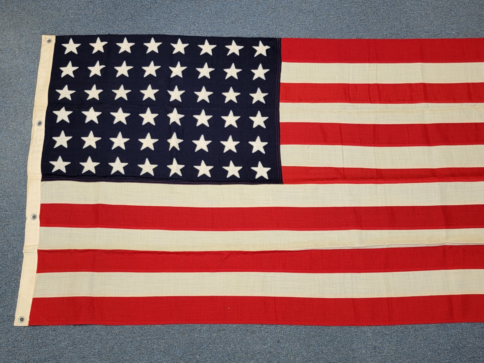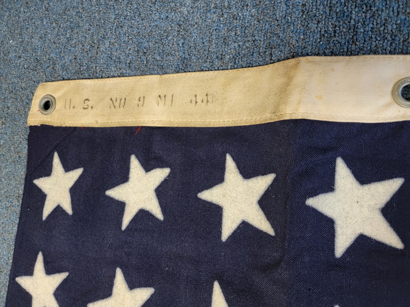 11/3/21 – This is an original US Mare Island No 9 flag from the end of WW2. The 48 star flag is ink stamped “U.S. No 9 MI 44”. There is some mild yellowing around this area, but overall the flag is excellent. No rips, but there are two small holes in the cloth, found on the 2nd white line and 3rd white line (from the top) . Excellent stitching throughout. No stains, but some typical signs of aging throughout. 80″ fly. Approximately 82.5 x 40.5 inches.