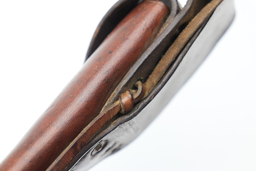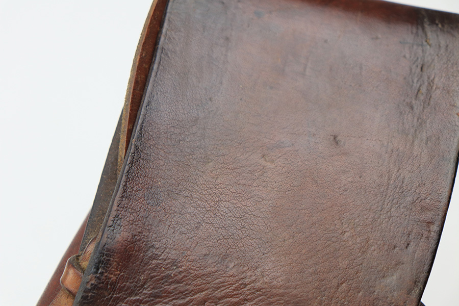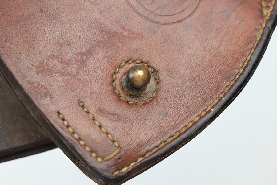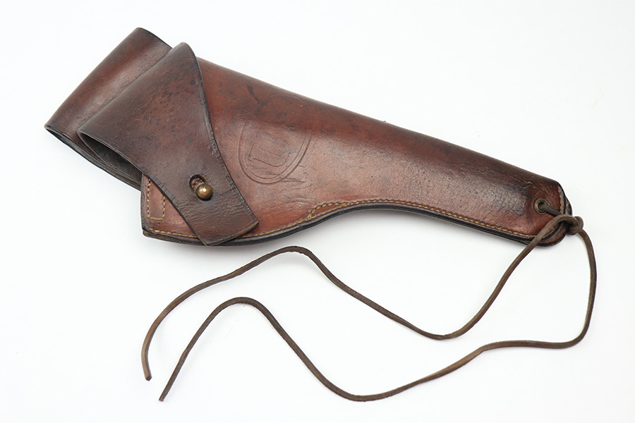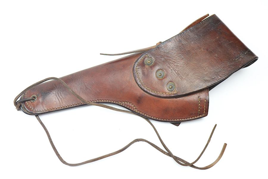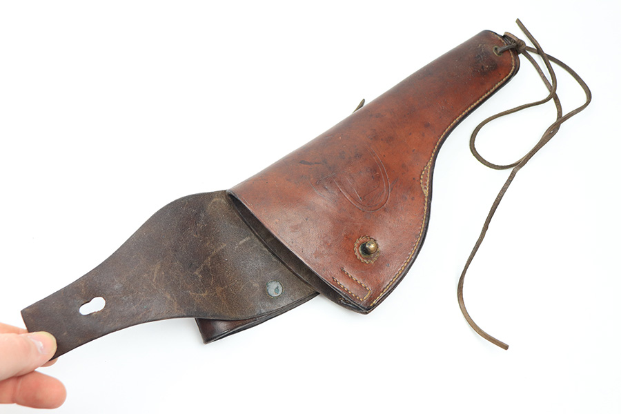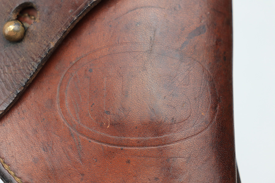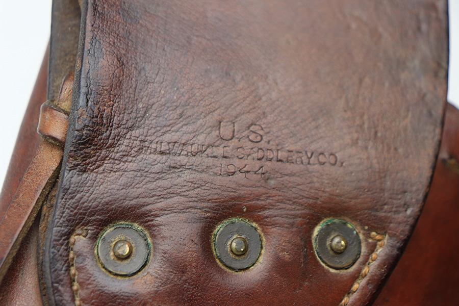 1/17/22 – This is a 1944 dated US Revolver holster. The holster would fit a Victory model revolver or a model 1917 revolver. The holster body length (when closed) is about 10 inches long. The leather is in good overall condition with no major issues and leather that’s completely in tact. Some light surface wrinkling throughout and normal pliability. No stitching issues. Maker stamped and dated on the back leather.