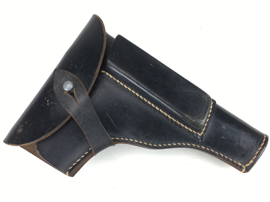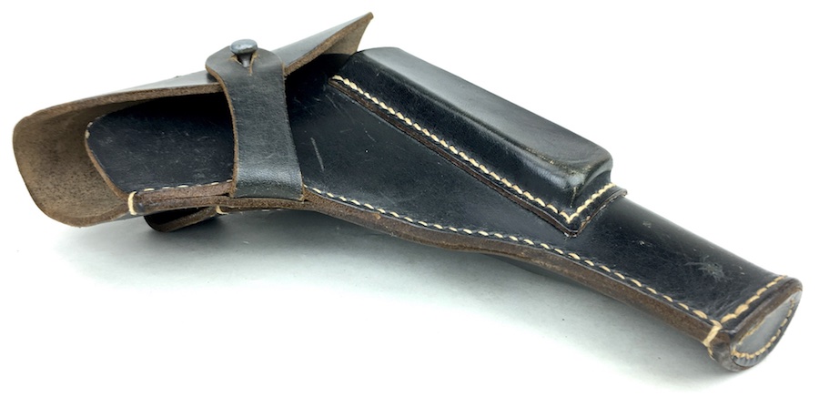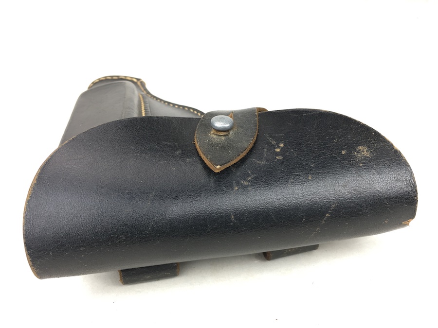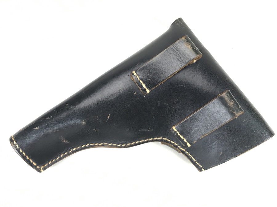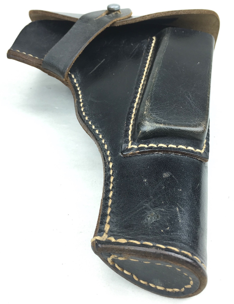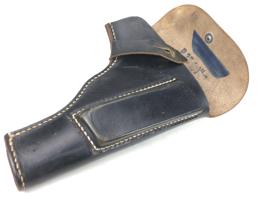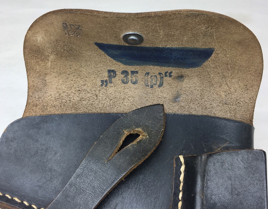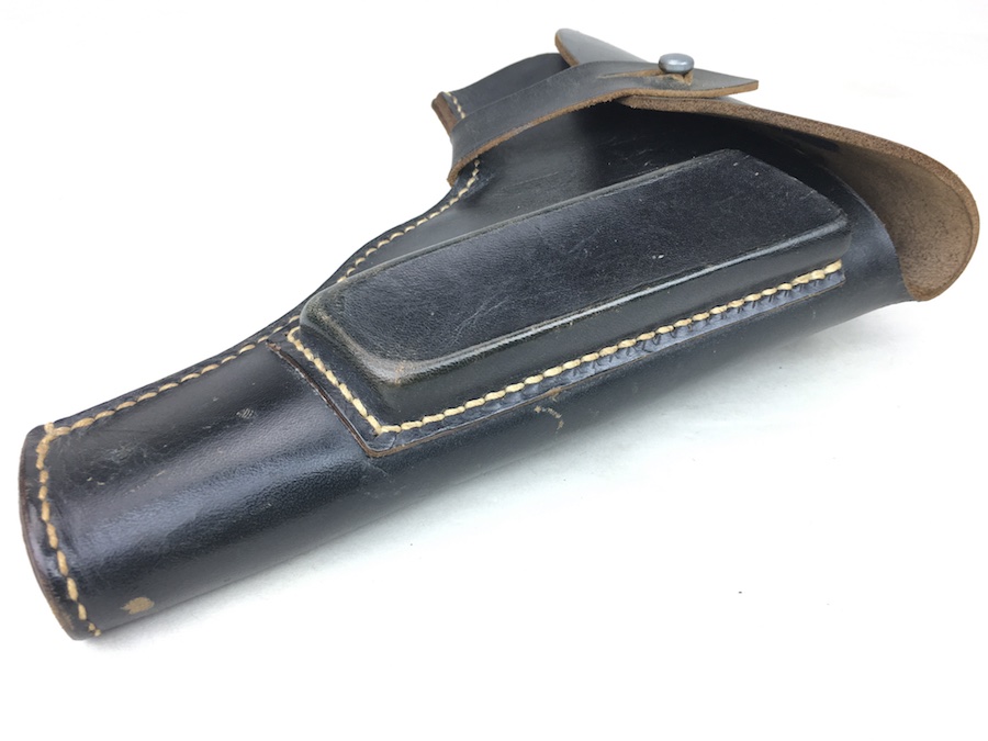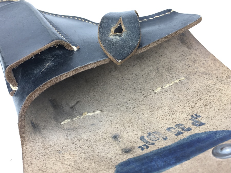 9/23/19 – This is an original 1944 dated, waffen stamped Radom holster. The holster has clean leather that is firm throughout. The leather is completely intact along with the stitching. The backside of the closure flap is stamped “grz 194”. Meaning 1944. Under the date is a waffen eagle military proof stamp. The interior leather is clean and ink stamped “P35 (p)” There is an area above the ink stamped that has been covered over with ink. Guaranteed original and authentic.