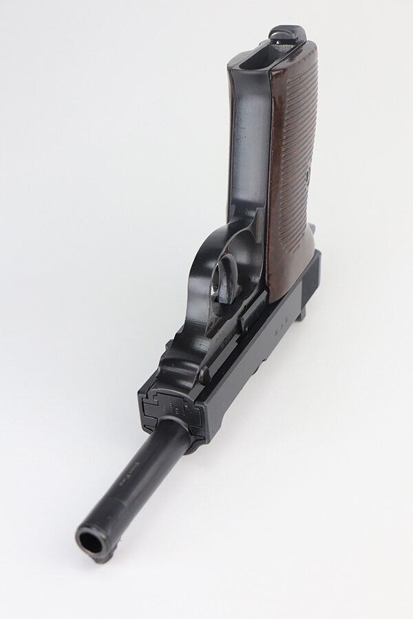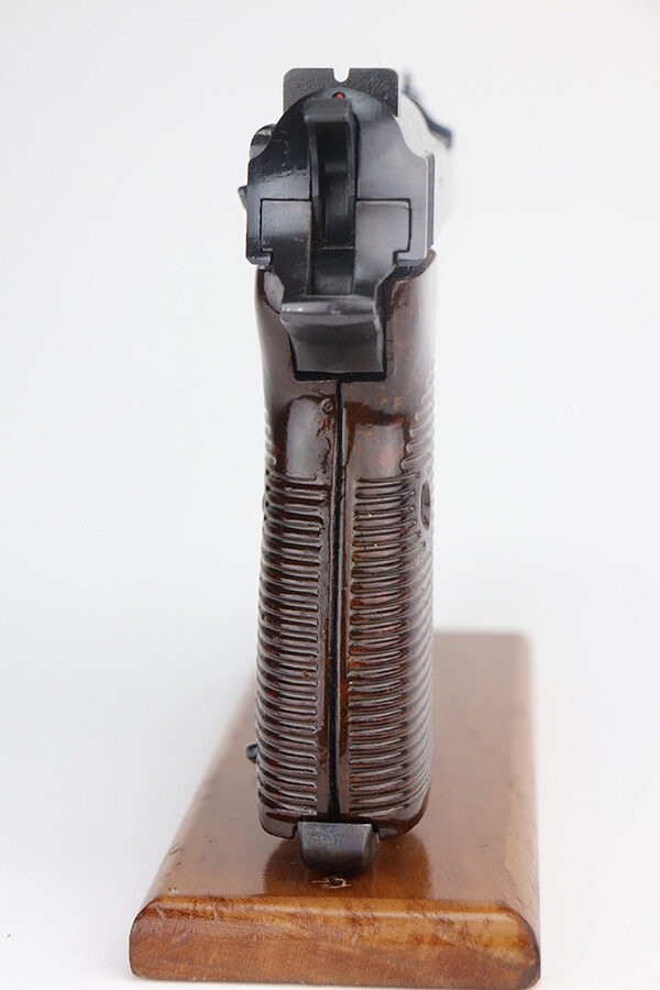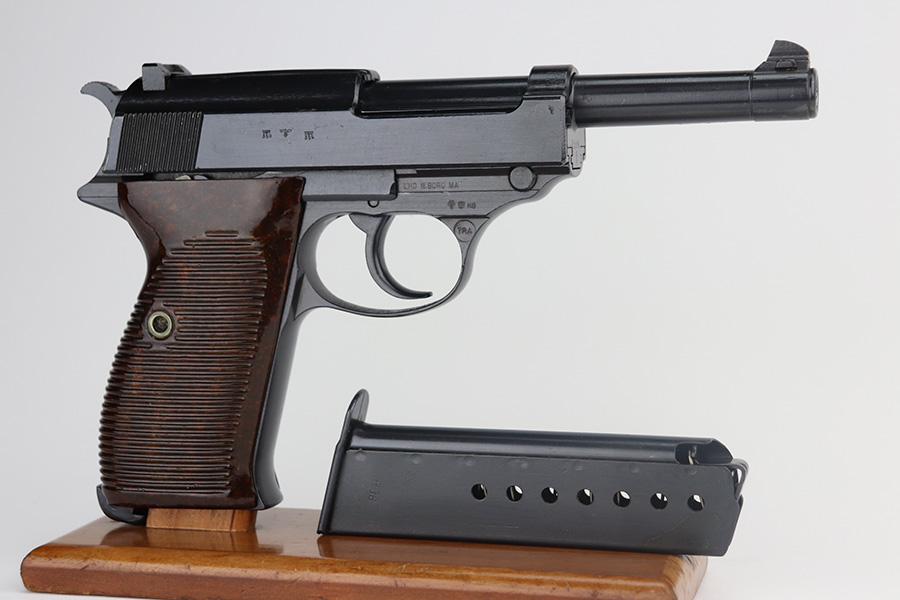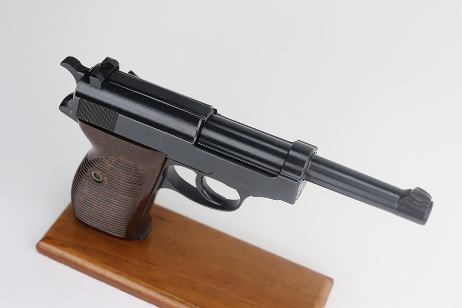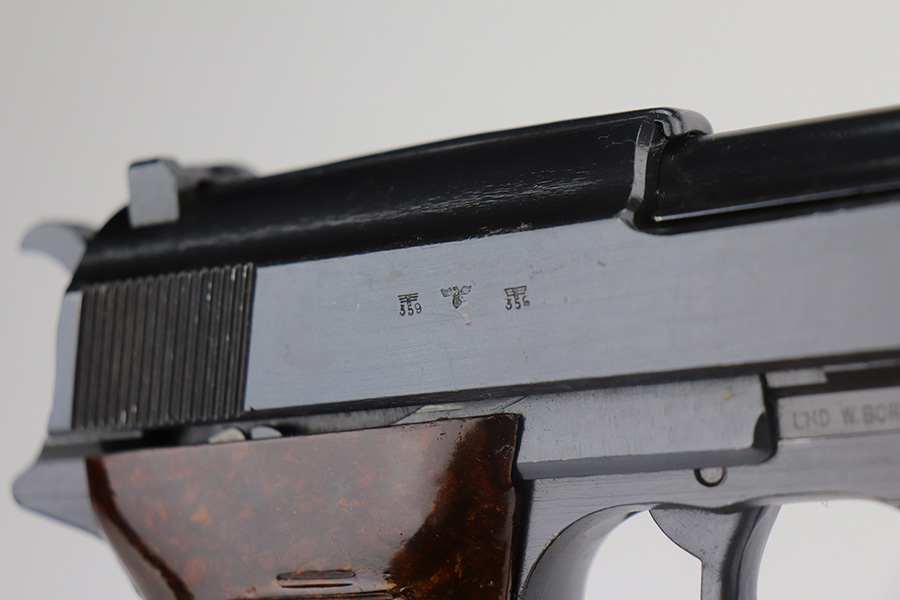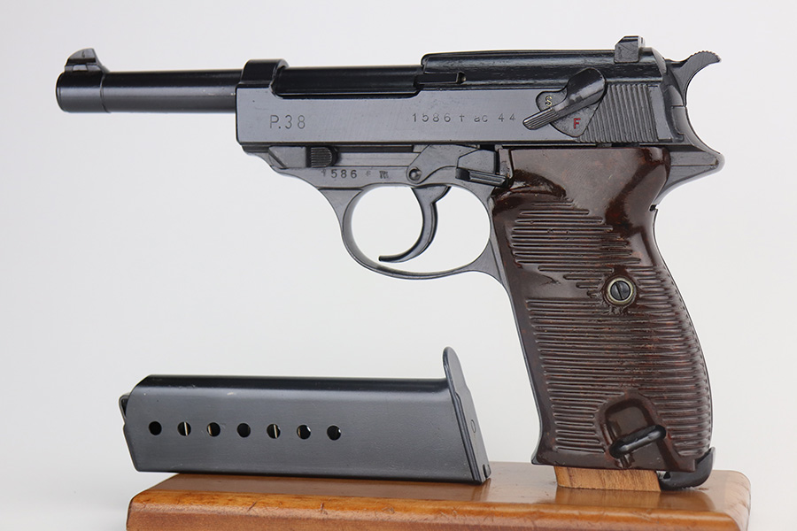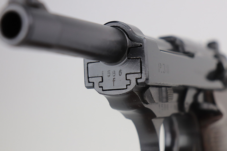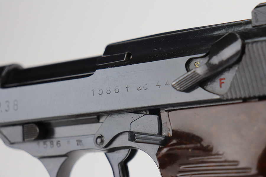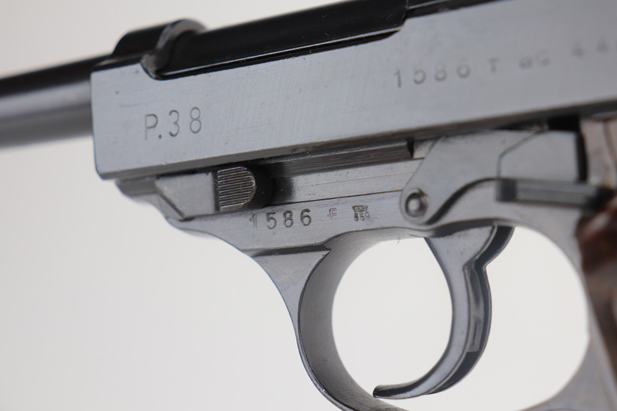5/26/21 – This is a mint example of a Walther P.38 issued to the Nazi military in 1944. This one is all matching and has the proper “Eagle 359” military proofs. It also has a US import mark on the right side of the frame and West German export proofs throughout. “9mm Para” under the barrel. It has retained about 99% of its bluing with just a few very light handling marks on the front strap. Comes with excellent grips and a Walther magazine. The bore has strong rifling with tiny pin-pricking throughout. De-cocker is functional.