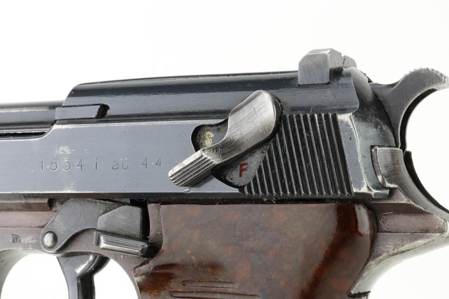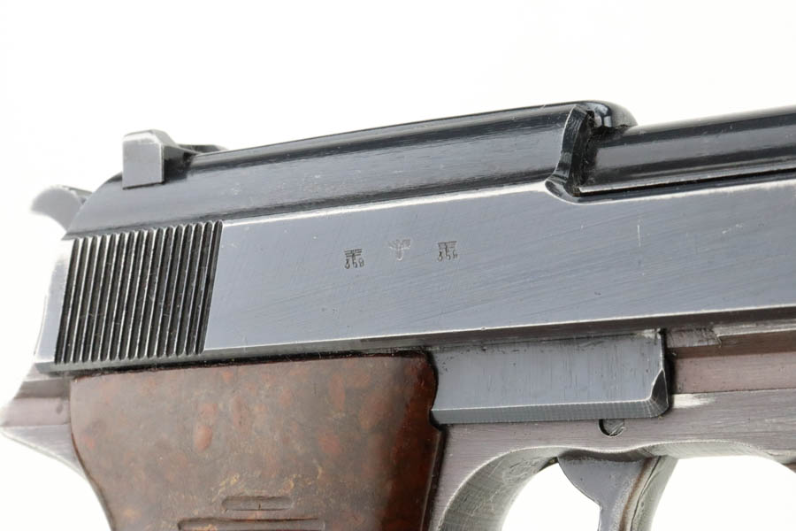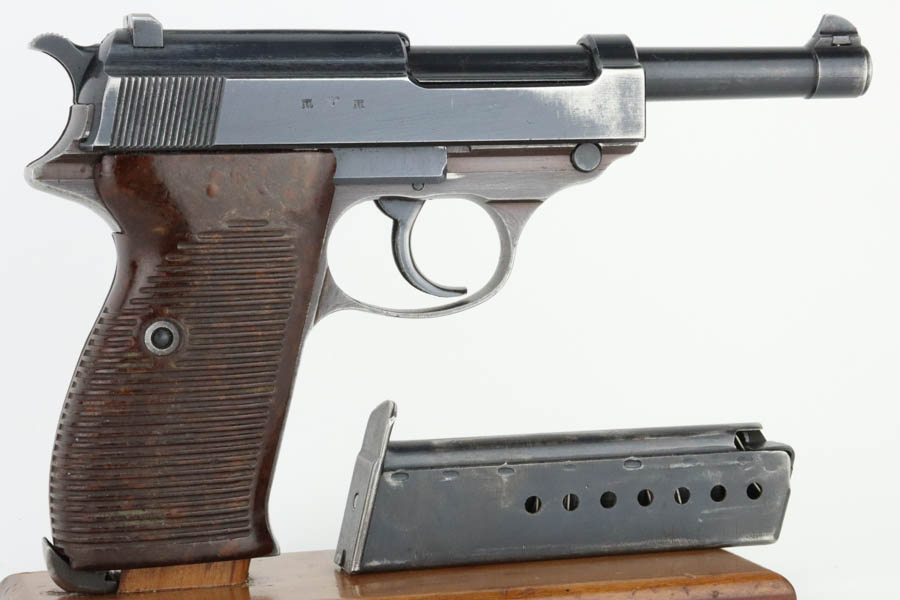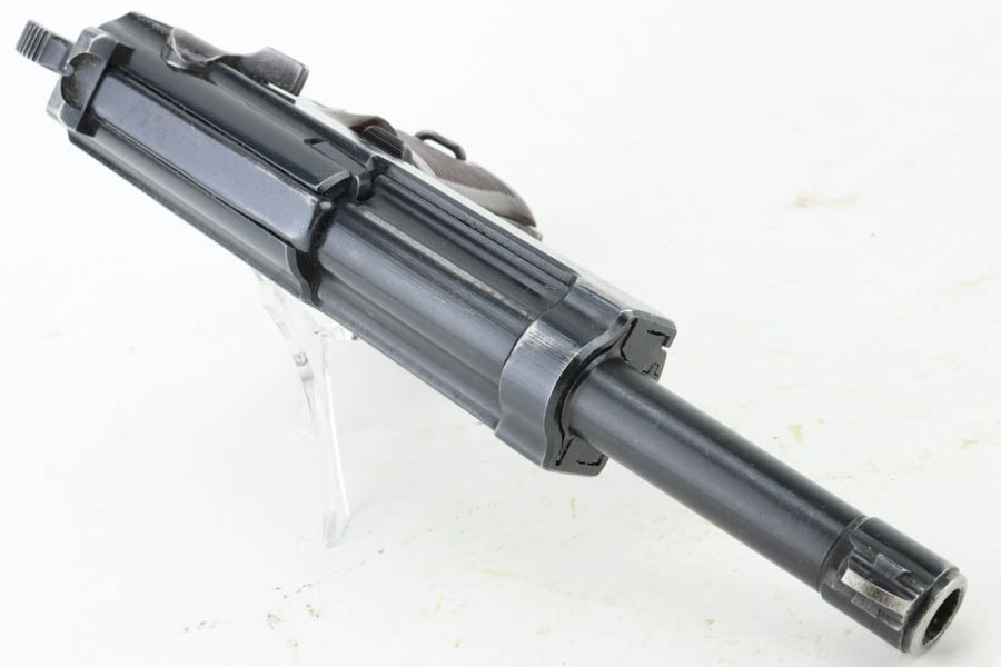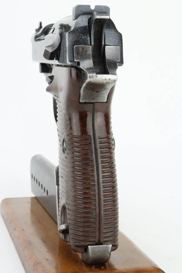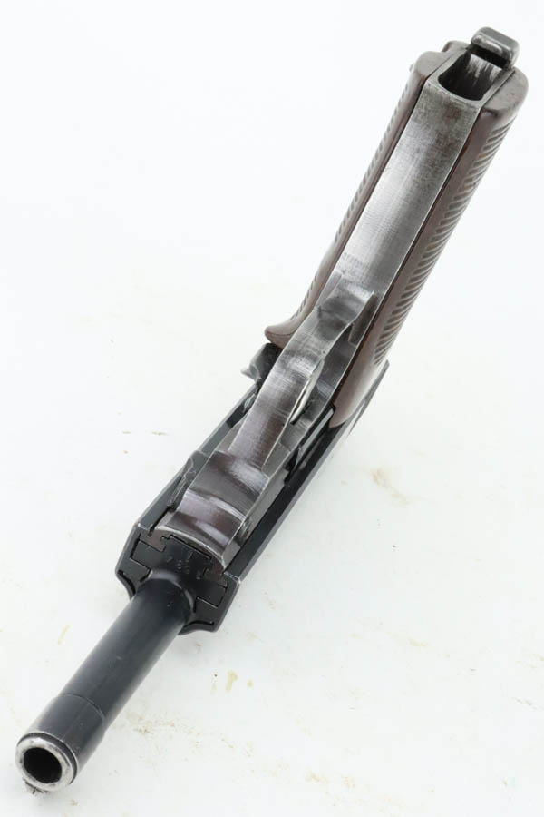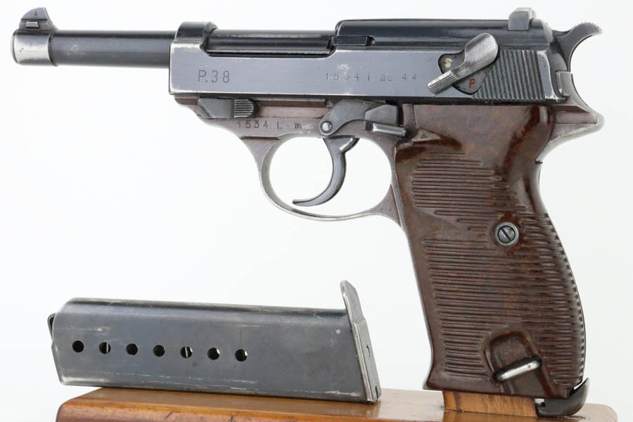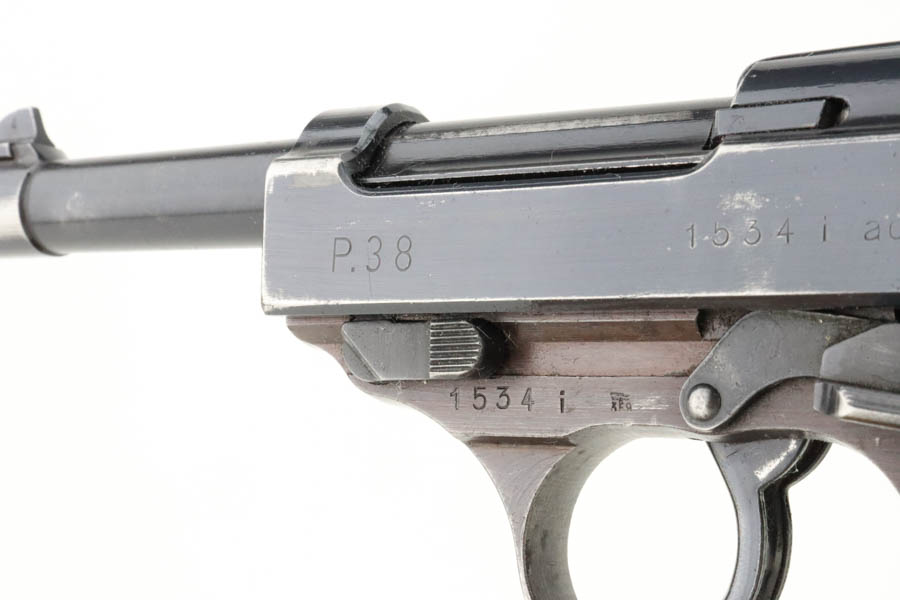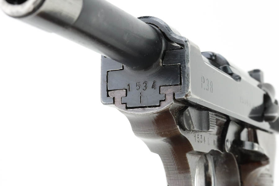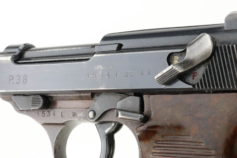 7/1/24 – This is a very nice example of an AC 44 Walther P.38 issued to the Nazi military in 1944. It is all matching and has the proper the proper “Eagle 359” military acceptance proofs throughout. It has retained about 85% of its original finish. The majority of the finish loss is on the front strap, but there is also wear around the muzzle and on the front right of the slide. The finish on the frame has a slight plum color to it. Fitted with period-correct reddish bakelite grips and comes with an “Eagle 88” proofed Spreewerk magazine. The bore has great rifling, but there is some light pin-pricking in the grooves. De-cocker is functional.