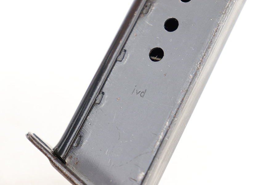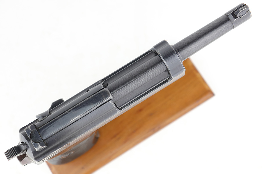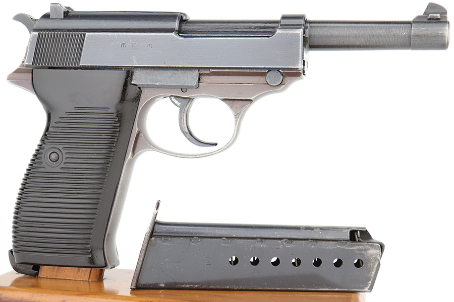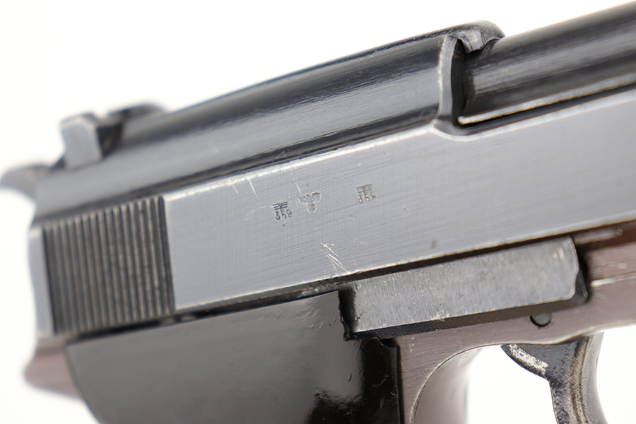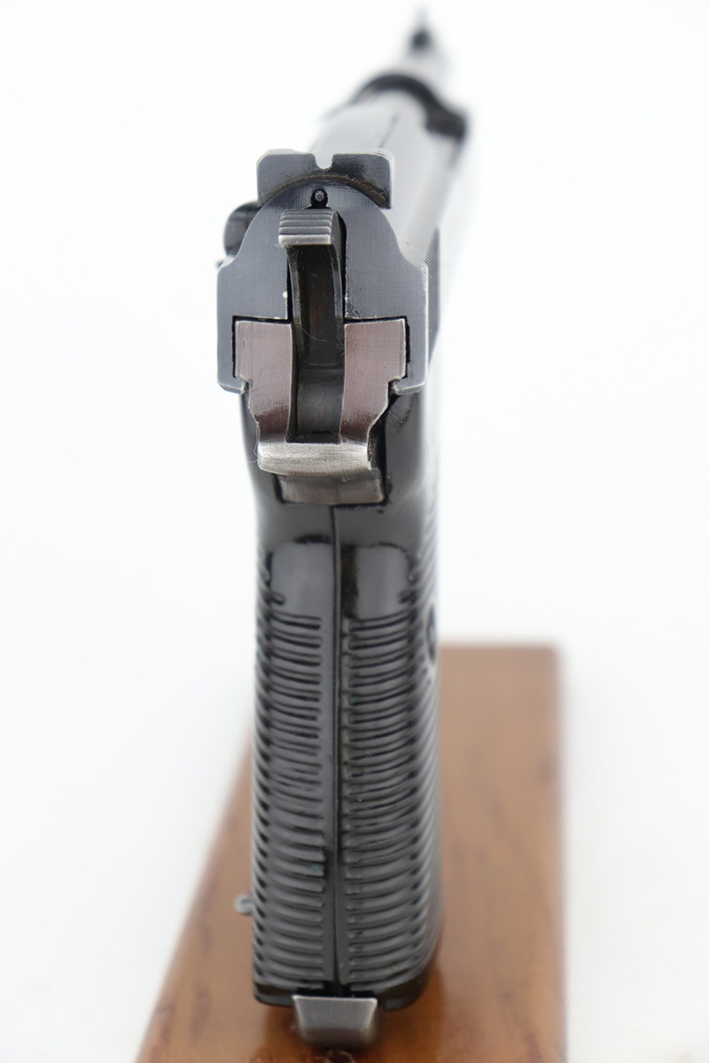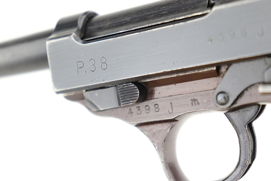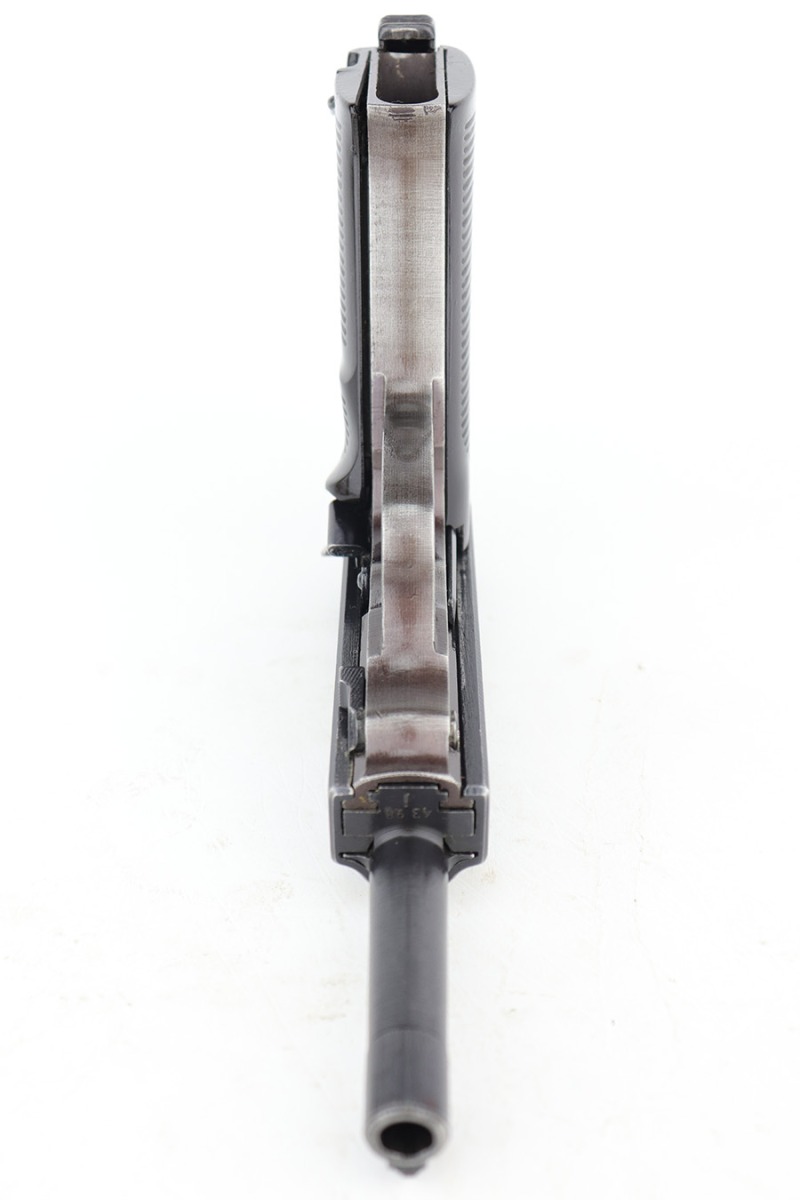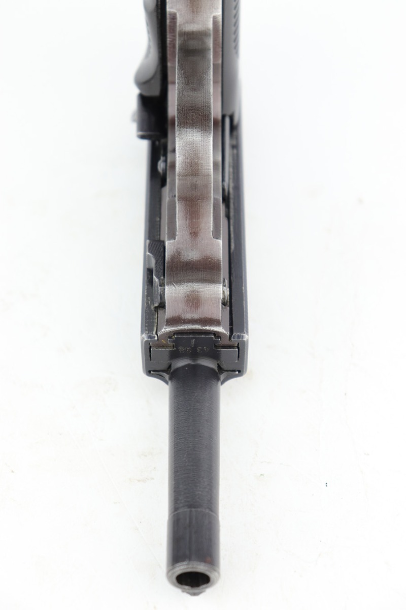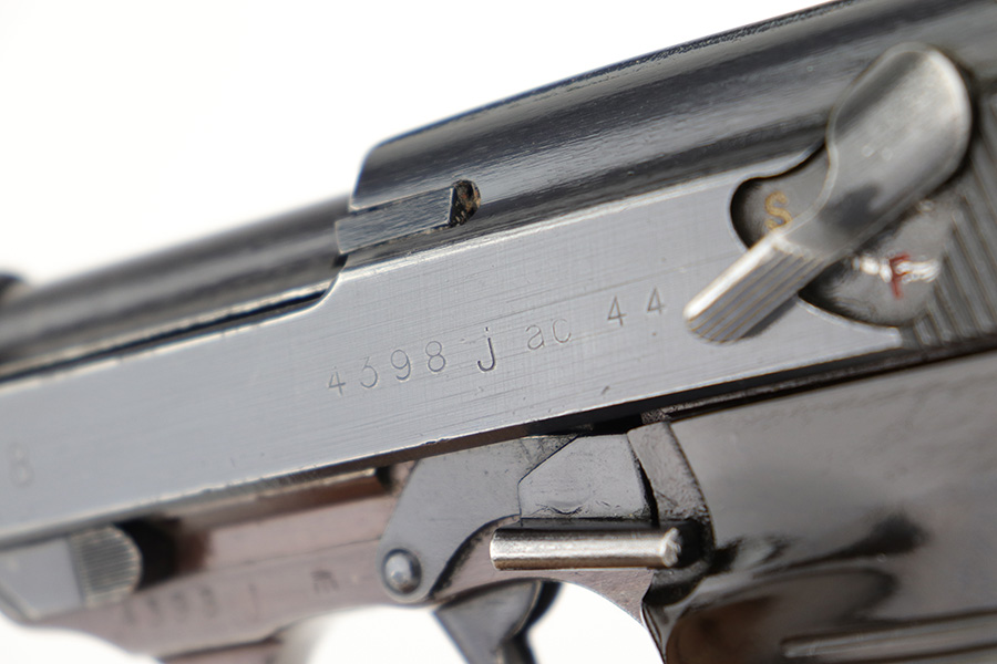 3/21/23 – This is a very nice example of an AC 44 Walther P.38 issued to the Nazi military in 1944. All matching with the proper “Eagle 359” military acceptance proofs. It has retained somewhere between 85-90% of its original finish. The frame has a plum hue to it. Very minor high edge wear and some minor thinning along the barrel and on the front strap. A few small dots of oxidation on the left side of the barrel. Excellent blackish-brown bakelite grips. Comes with a period-correct jvd magazine. The bore has strong rifling with very minor pin-pricking in the grooves. De-cocker is functional.