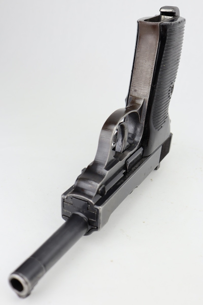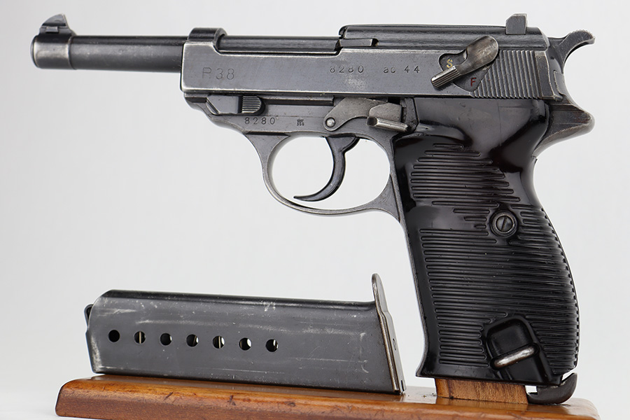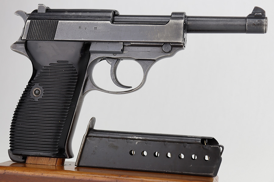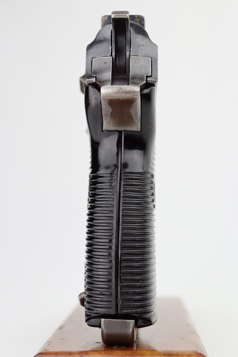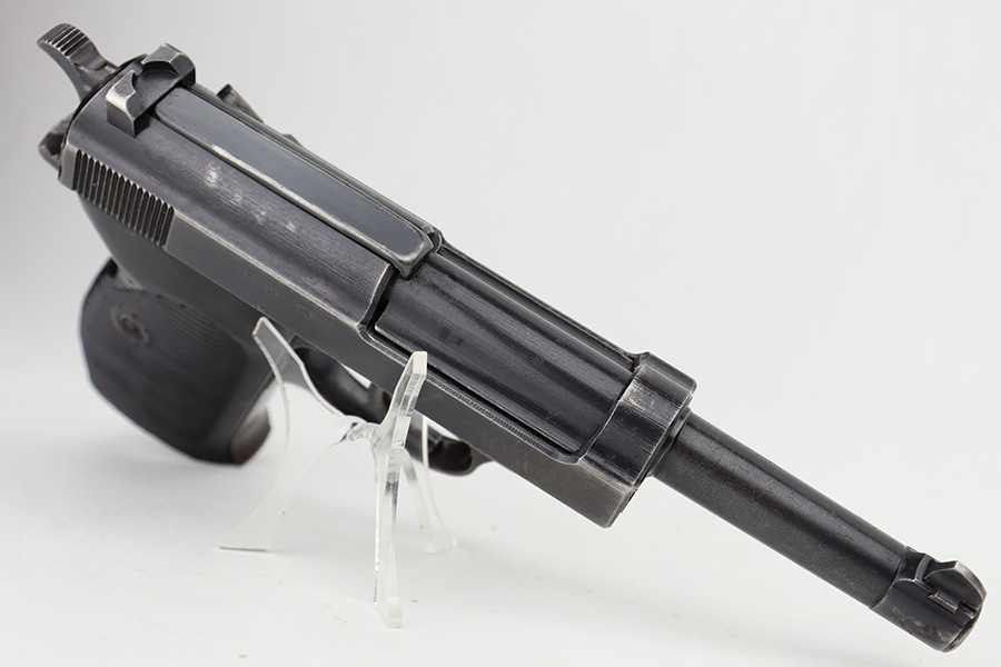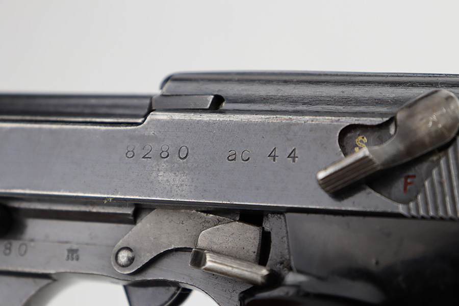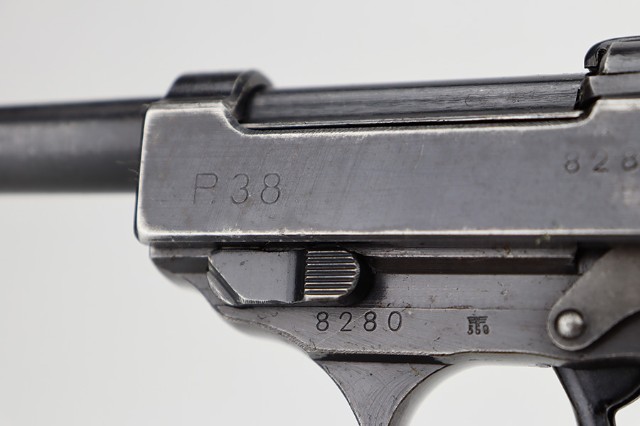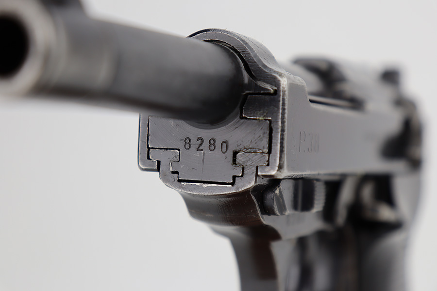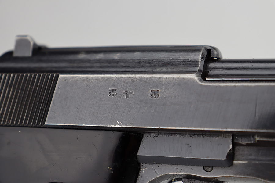 6/15/23 – This is a nice example of an AC 44 Walther P.38 issued to the Nazi military in 1944. It is all matching and has the proper “Eagle 359” military acceptance proofs throughout. It has retained roughly 80% of its original finish. The majority of the wear is on the front strap, but there is also wear around the muzzle, on the high edges on the slide, and a noticeable area of wear on the right side of the slide. Fitted with black plastic grips – light scratches and tiny handling marks throughout. Comes with one double “Eagle 359” marked Walther magazine. Excellent bore. De-cocker is functional.