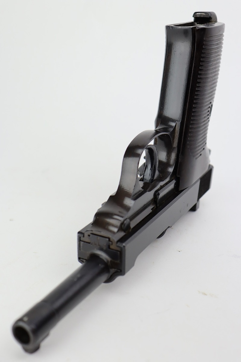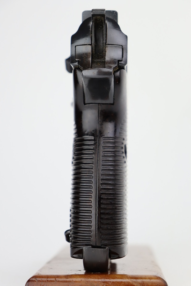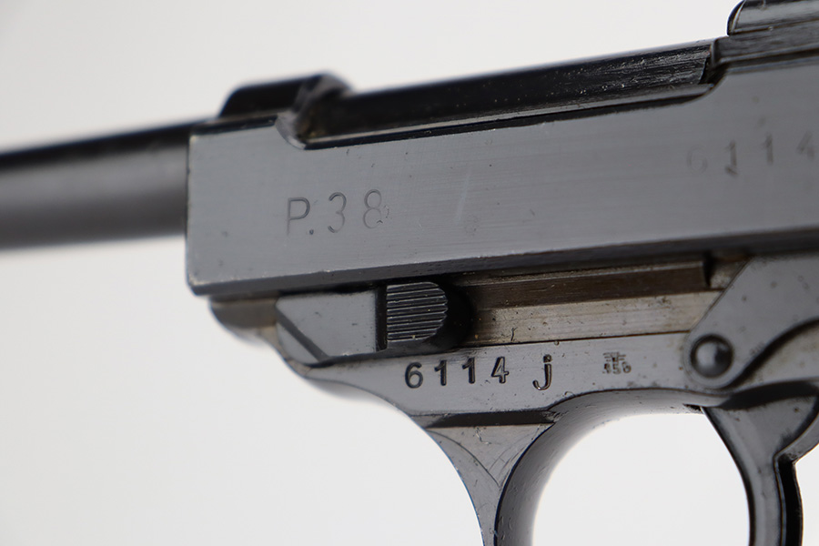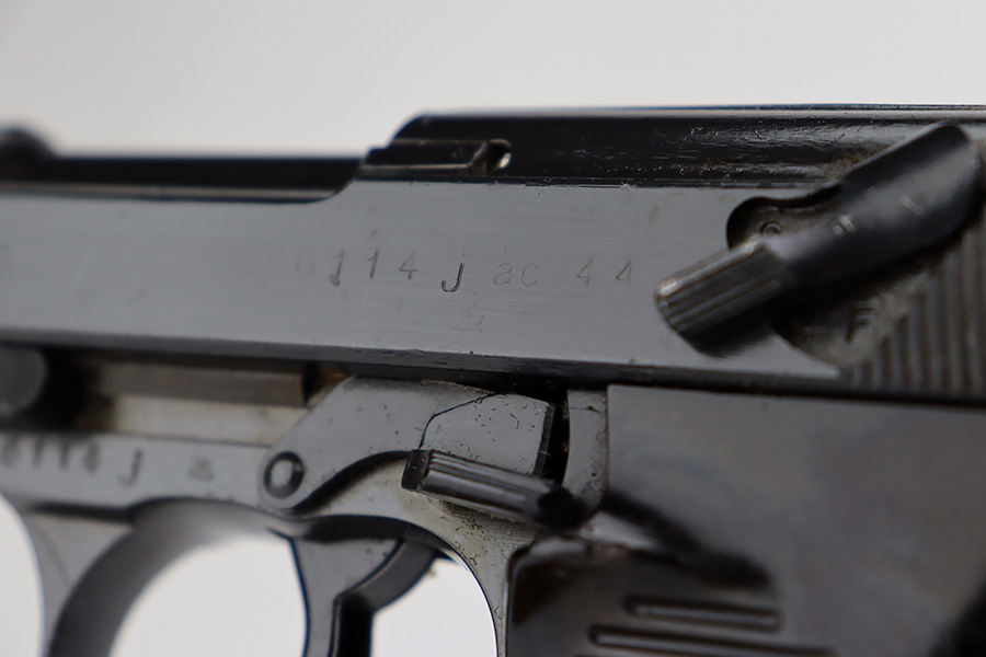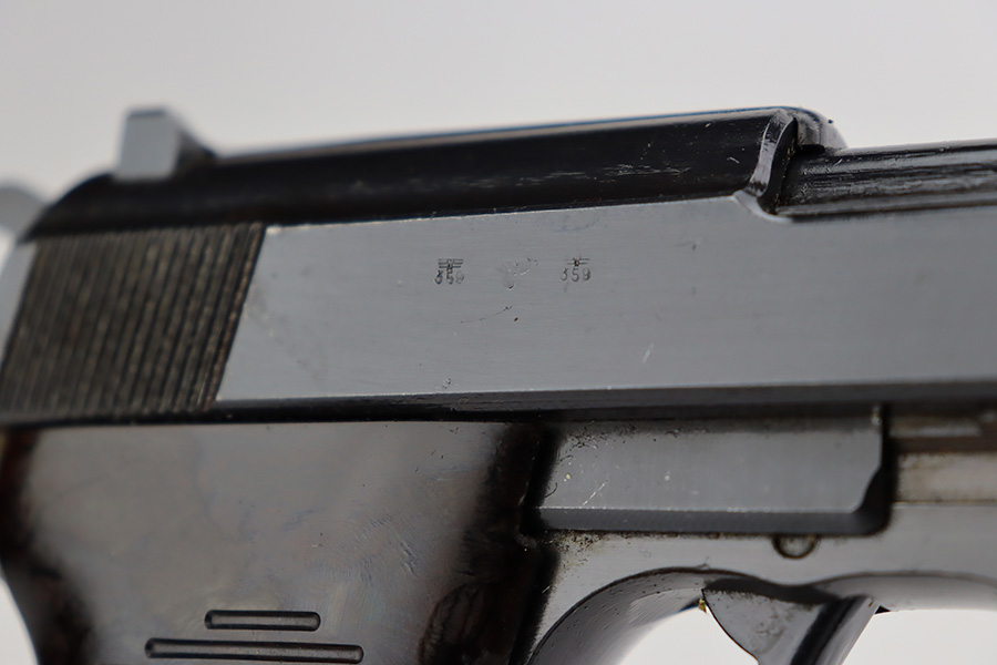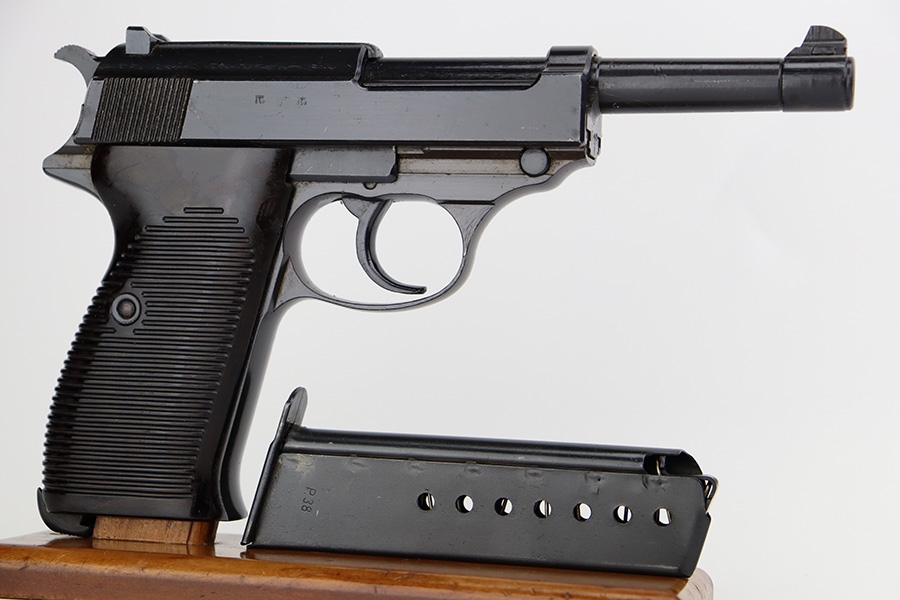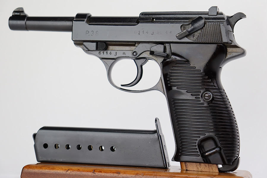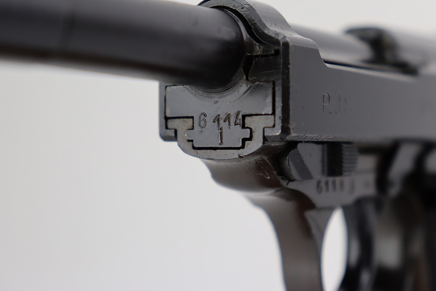 7/10/23 – This is an excellent example of an AC 44 Walther P.38 issued to the Nazi military in 1944. It is all matching with the proper “Eagle 359” Nazi military acceptance proofs throughout. The entire gun has a dark “Russian dipped” finish. There is virtually no finish loss. Fitted with an excellent set of period-correct blackish-brown bakelite grips. Comes with a proper “Eagle 359” marked Walther magazine. Very nice bore with strong rifling and very minor fouling in the grooves. De-cocker is functional.