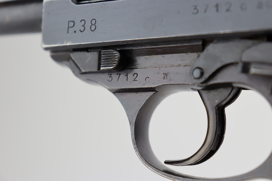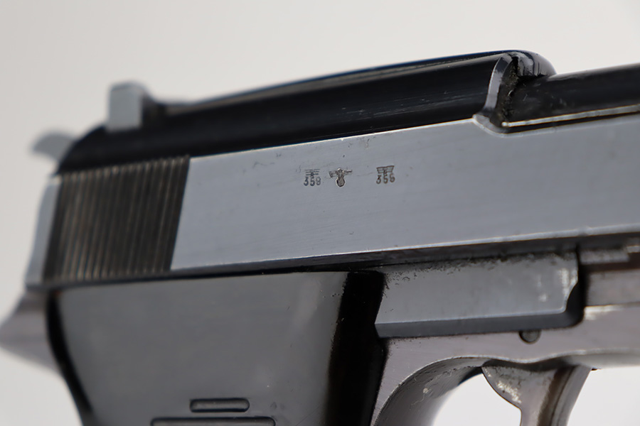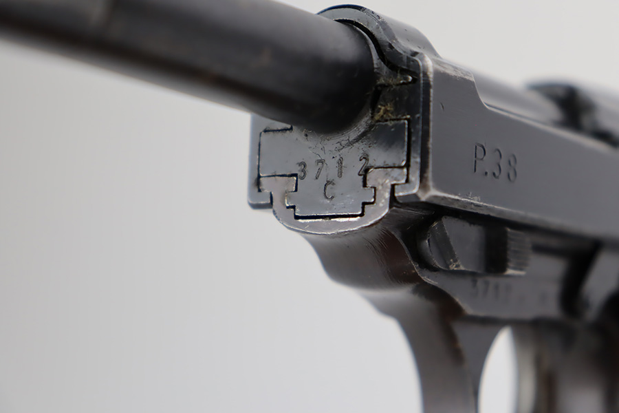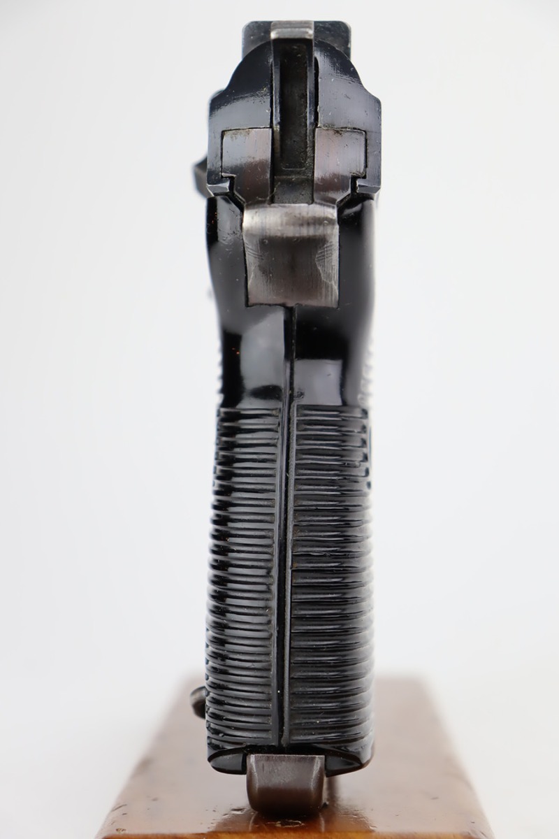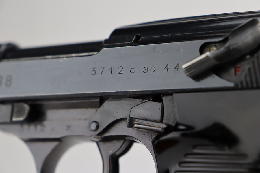9/20/23 – This is a very nice example of an AC 44 Walther P.38 issued to the Nazi military in 1944. It is all matching and has the proper “Eagle 359” military acceptance proofs. It has retained roughly 85% of its finish. The majority of the wear is on the front strap, but there is also minor wear around the muzzle, on the front edges of the slide, and some tiny dots of discoloration along the left side of the barrel. Fitted with black plastic grips and comes with an “Eagle 359” marked magazine. Near-mint bore. De-cocker is functional.