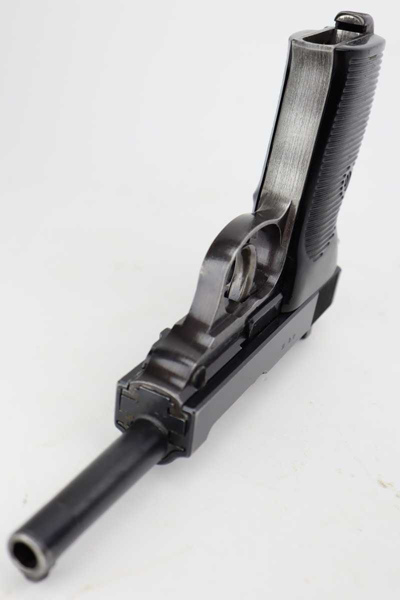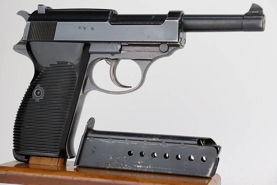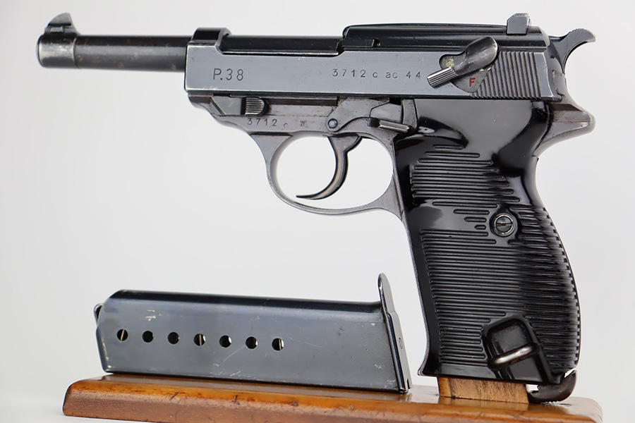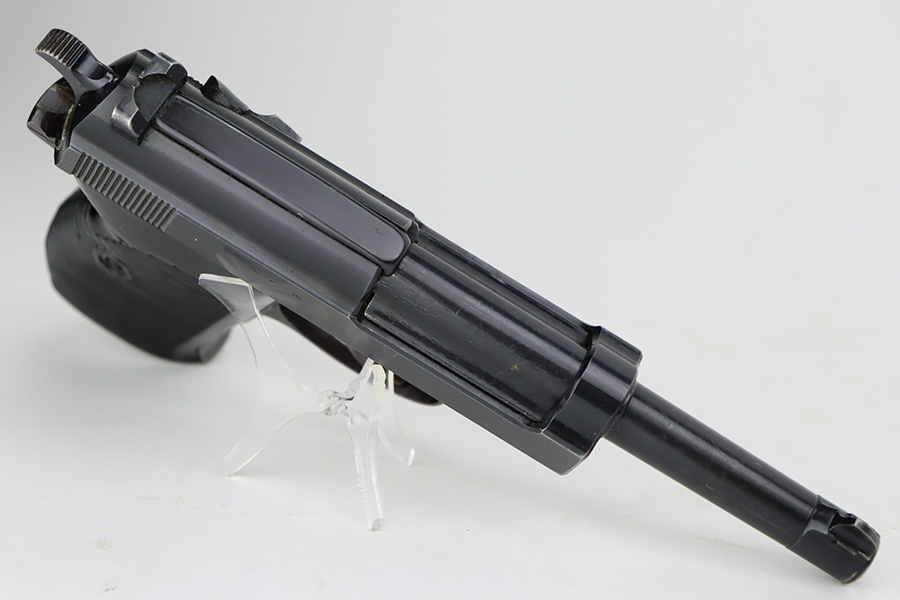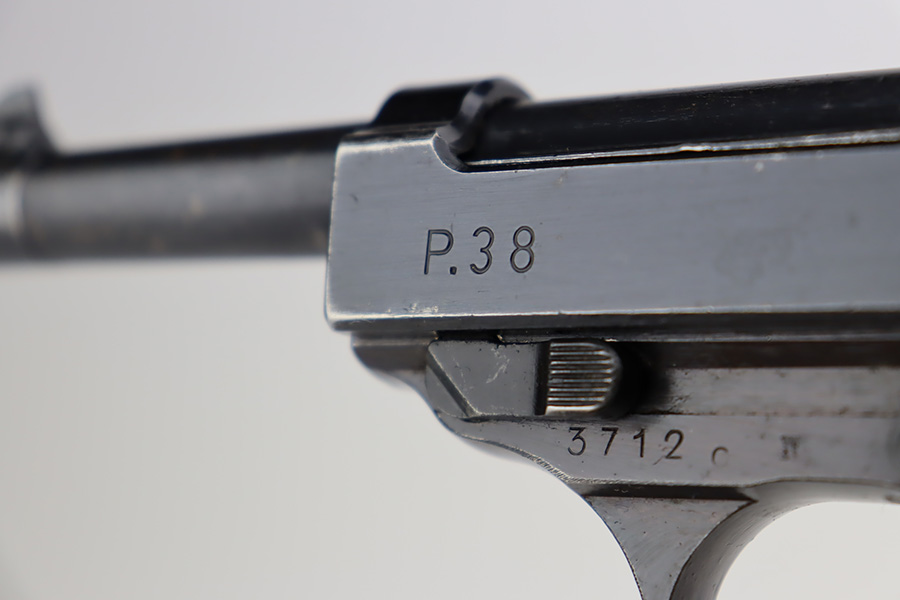 9/20/23 – This is a very nice example of an AC 44 Walther P.38 issued to the Nazi military in 1944. It is all matching and has the proper “Eagle 359” military acceptance proofs. It has retained roughly 85% of its finish. The majority of the wear is on the front strap, but there is also minor wear around the muzzle, on the front edges of the slide, and some tiny dots of discoloration along the left side of the barrel. Fitted with black plastic grips and comes with an “Eagle 359” marked magazine. Near-mint bore. De-cocker is functional.