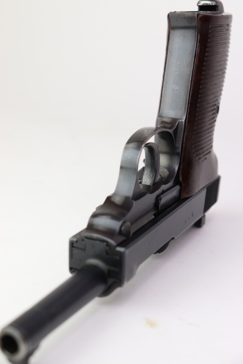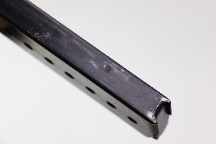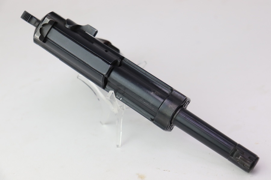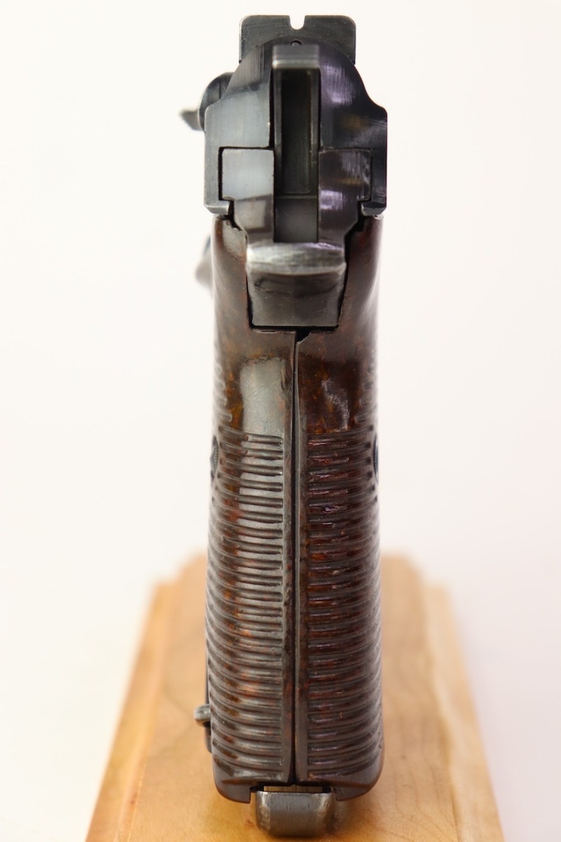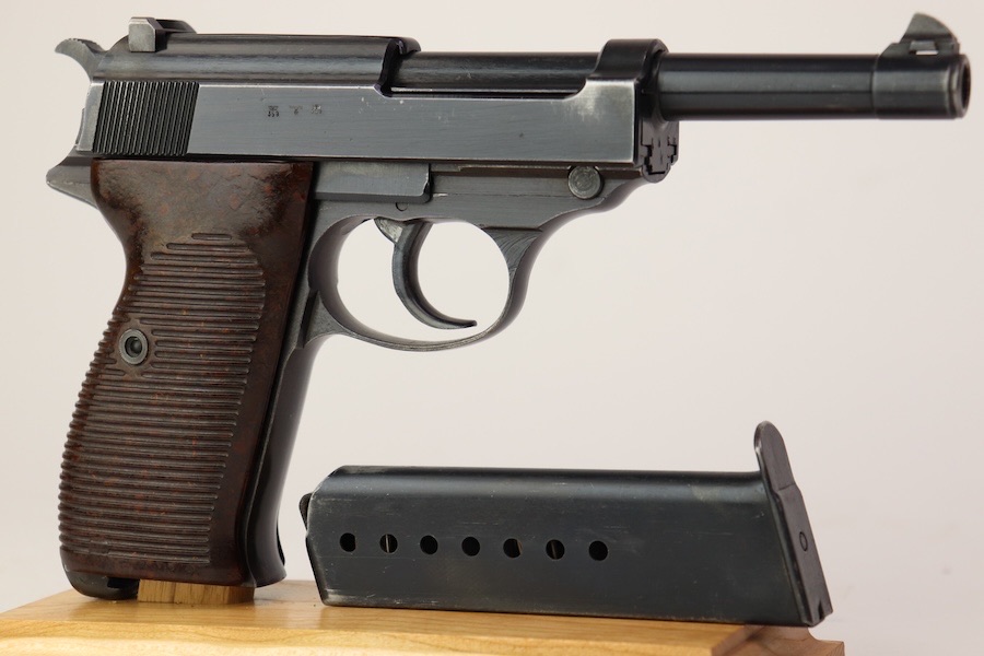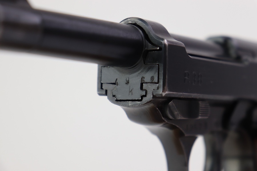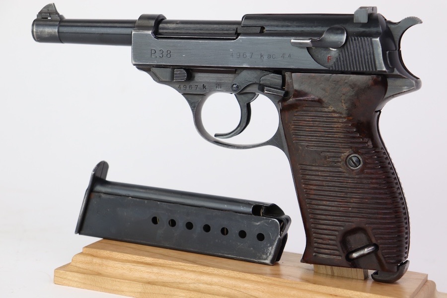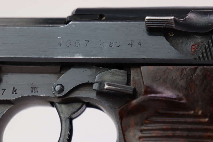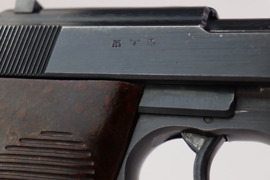 9/28/23 – This is a very nice example of an AC 44 Walther P.38 issued to the Nazi military in 1944. It has the proper “Eagle 359” military acceptance proofs. It has retained roughly 88-90% of its finish. There is slight finish loss under the trigger guard and minor wear around the muzzle and on the front edges of the slide. Nice straps. Fitted with brown plastic grips and comes with a proper “Eagle 359” marked magazine. The bore has slight pitting but is otherwise very clean with strong rifling 8.8/10. The de-cocker is not functional.