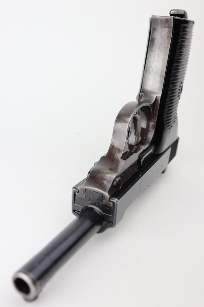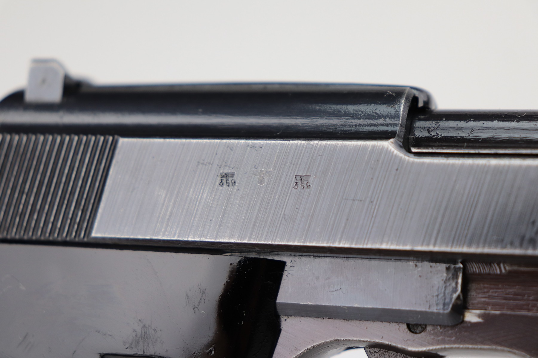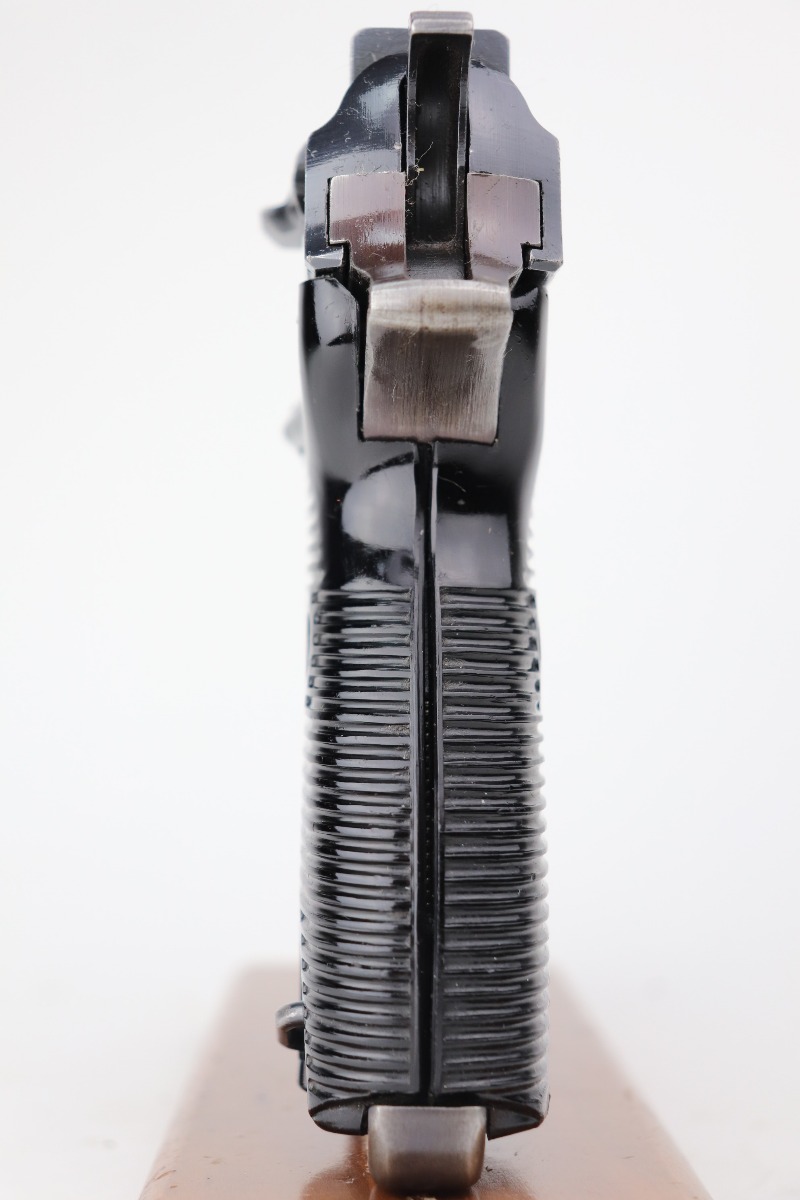 3/17/21 – This is a very nice example of a Walther P.38 issued to the Nazi military in 1944. It is all matching and has the proper “Eagle 359” military proofs. The frame has an “Eagle 140” proof, indicating it is a rare frame made at the FN factory. The gun has retained about 90% of its original finish. There is thinning on the front strap and minor wear around the muzzle and high edges of the slide. It comes with excellent grips and a period-correct magazine. The bore has strong rifling, but there is minor pin-pricking throughout. De-cocker is functional.