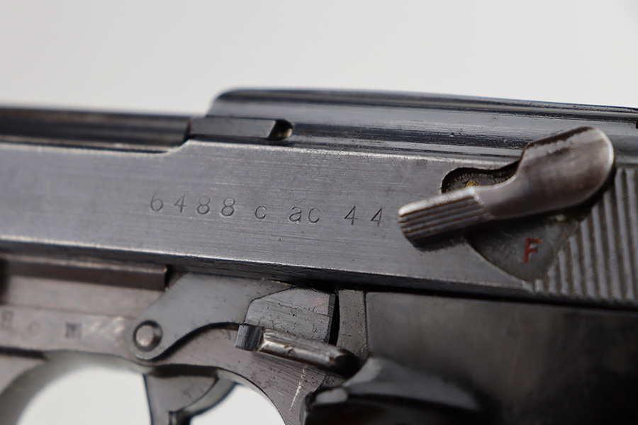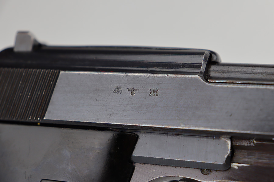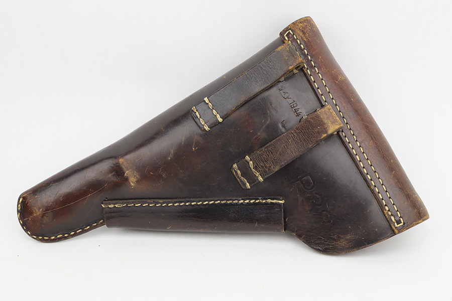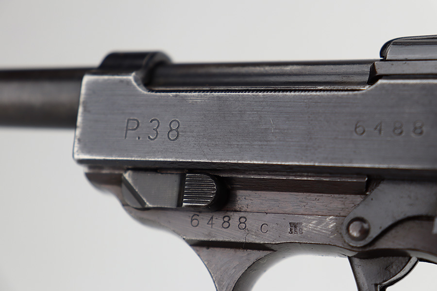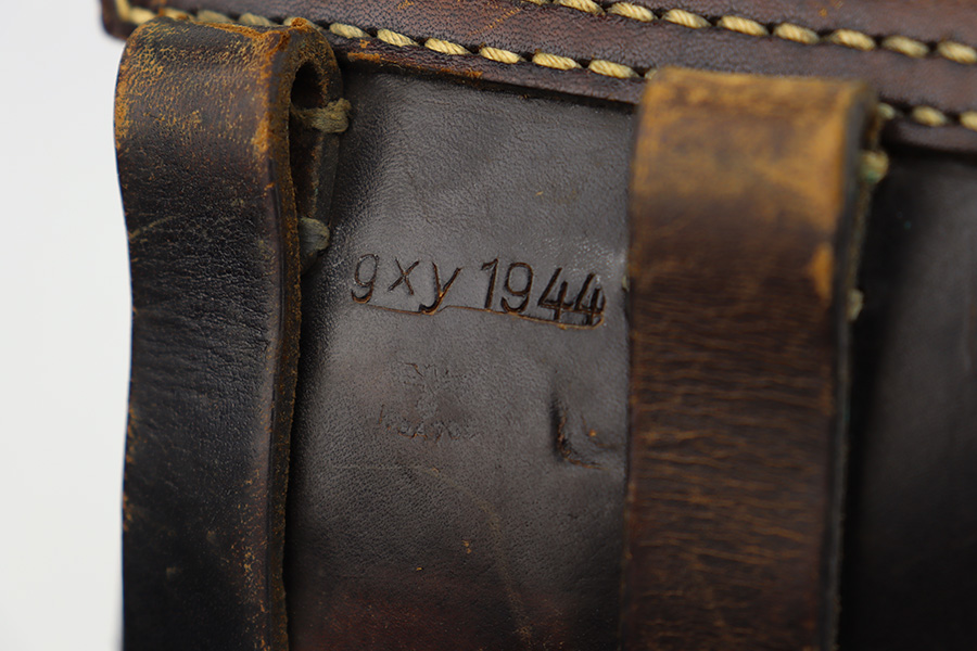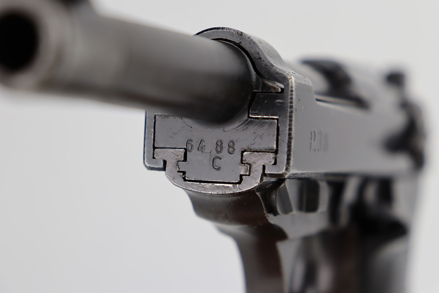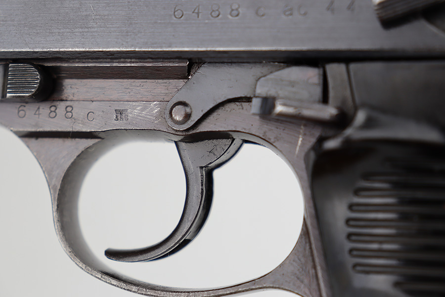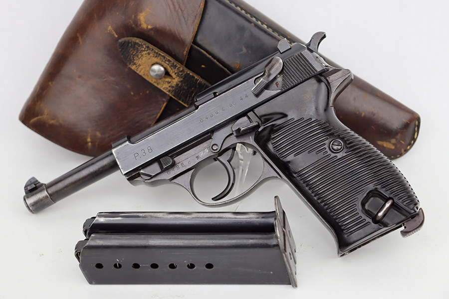 6/12/23 – This is a very nice example of an AC 44 Walther P.38 issued to the Nazi military in 1944. It is all matching with the proper “Eagle 359” military acceptance proofs throughout. It comes as a rig with a nice 1944-dated soft shell holster and two period-correct “Eagle 359” marked Walther magazines. The gun itself has retained about 92% of its original finish. Areas of wear around the muzzle, along the barrel, and on the front edges of the slide. Minor thinning and brown patina on the front strap. Fitted with excellent blackish-brown bakelite grips. The bore has good rifling with minor pin-pricking throughout. De-cocker is functional.