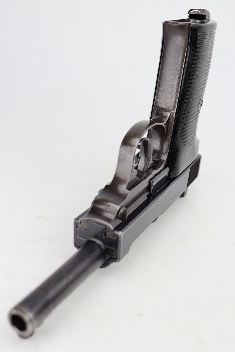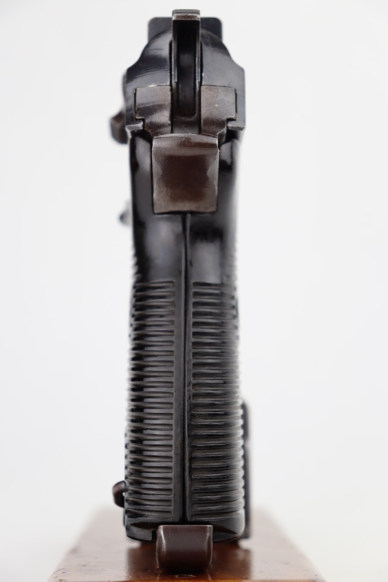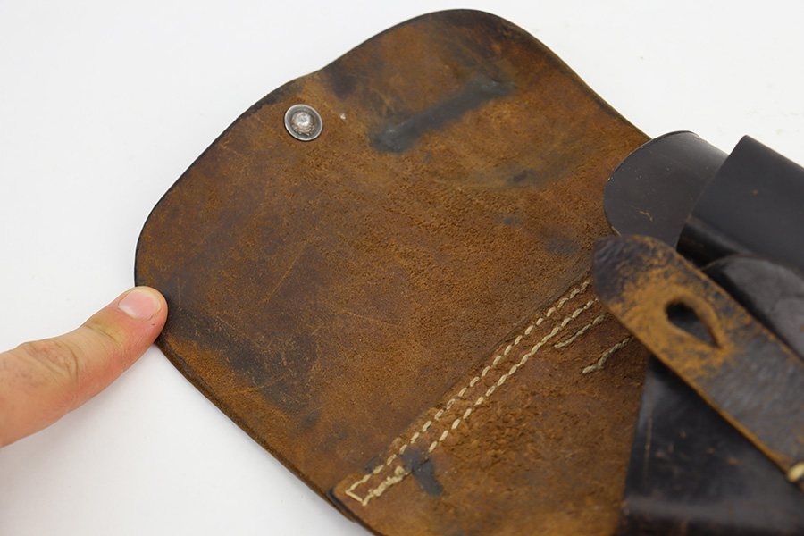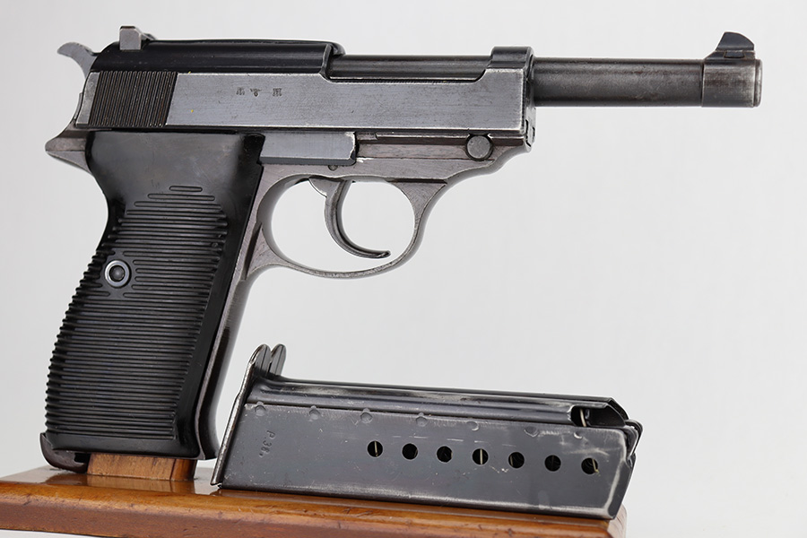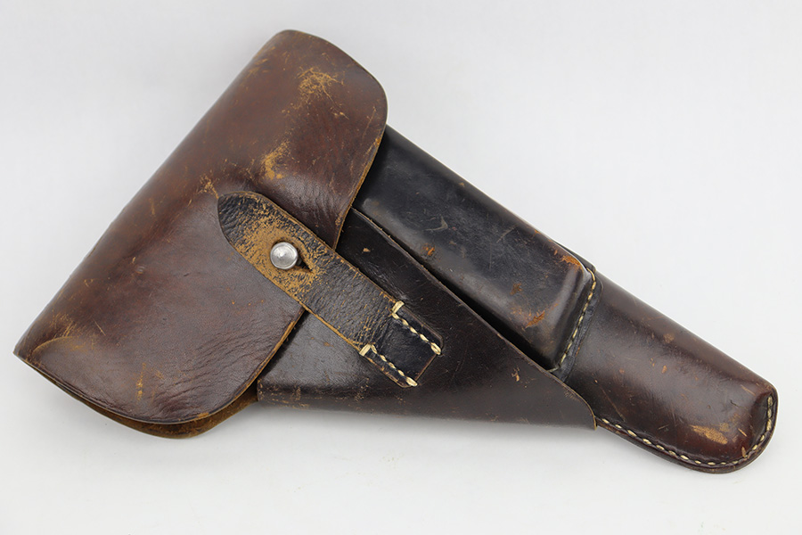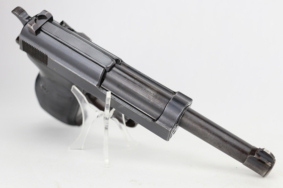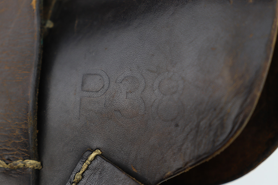 6/12/23 – This is a very nice example of an AC 44 Walther P.38 issued to the Nazi military in 1944. It is all matching with the proper “Eagle 359” military acceptance proofs throughout. It comes as a rig with a nice 1944-dated soft shell holster and two period-correct “Eagle 359” marked Walther magazines. The gun itself has retained about 92% of its original finish. Areas of wear around the muzzle, along the barrel, and on the front edges of the slide. Minor thinning and brown patina on the front strap. Fitted with excellent blackish-brown bakelite grips. The bore has good rifling with minor pin-pricking throughout. De-cocker is functional.