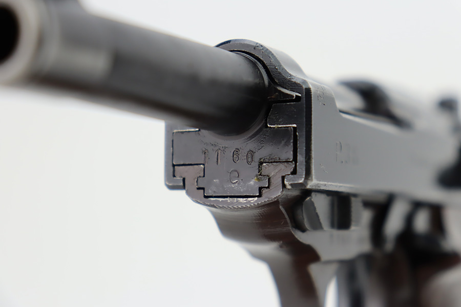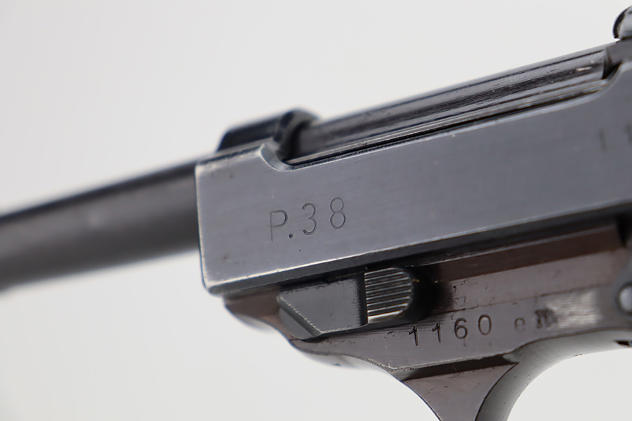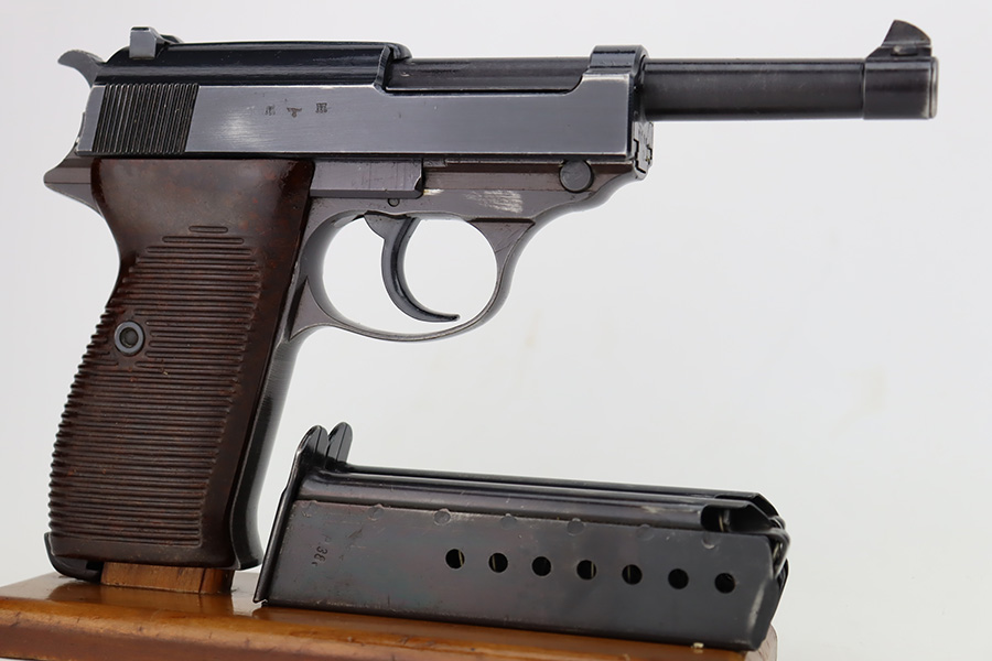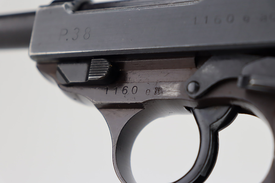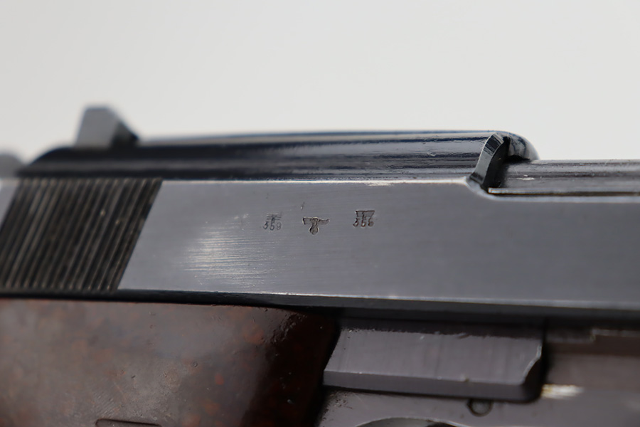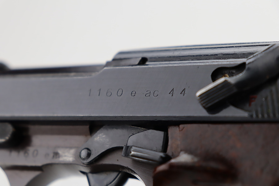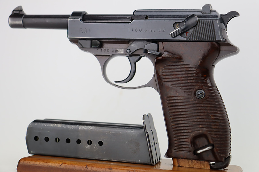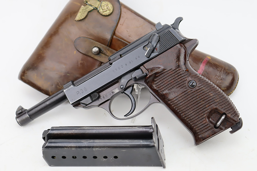10/18/23 – This is a nice example of an AC 44 Walther P.38 issued to the Nazi military in 1944. All matching with the proper “Eagle 359” military proofs. It comes as a rig with a brown leather soft shell holster (embellished with a brass Nazi Eagle pin) and two period-correct “Eagle 359” marked Walther magazines. The gun itself has retained somewhere between 85-90% of its original finish. The majority of the wear is on the front strap, but there is also minor muzzle wear, and a couple of areas of thinning on the right side of the slide. Fitted with excellent reddish bakelite grips. The bore has strong rifling with very light pin-pricking in the grooves. De-cocker is functional.