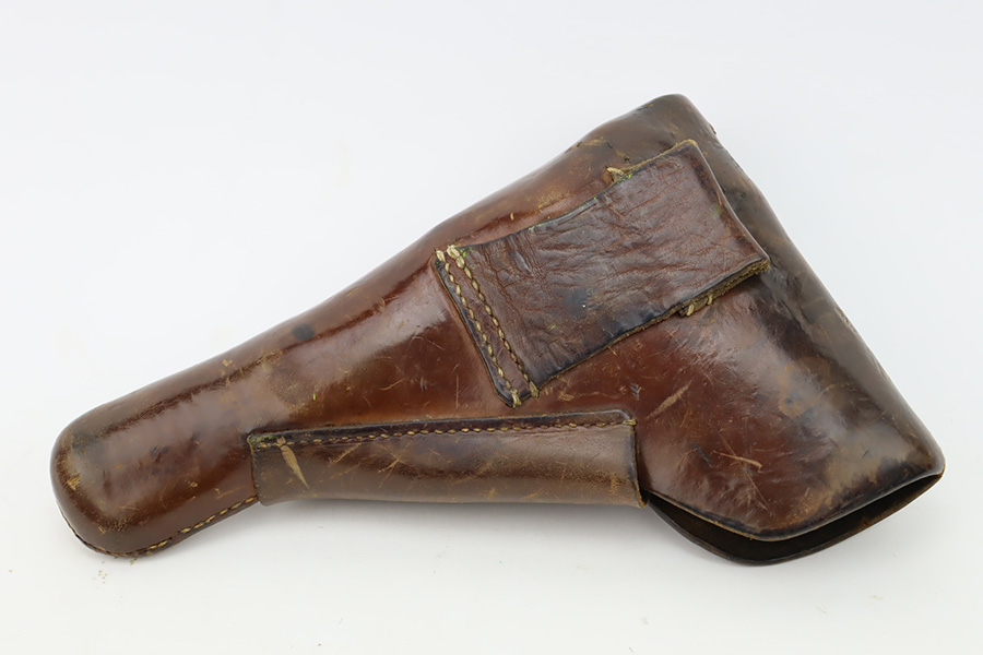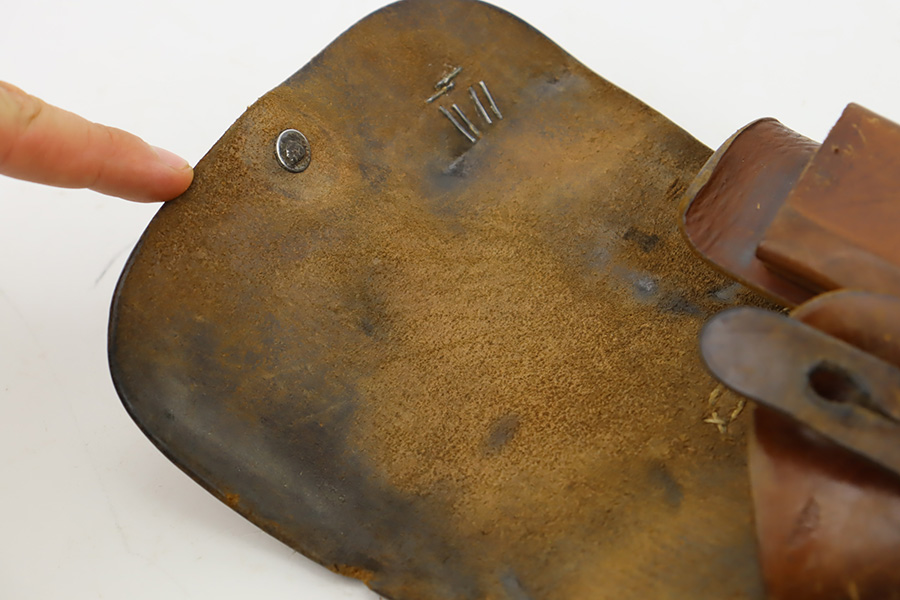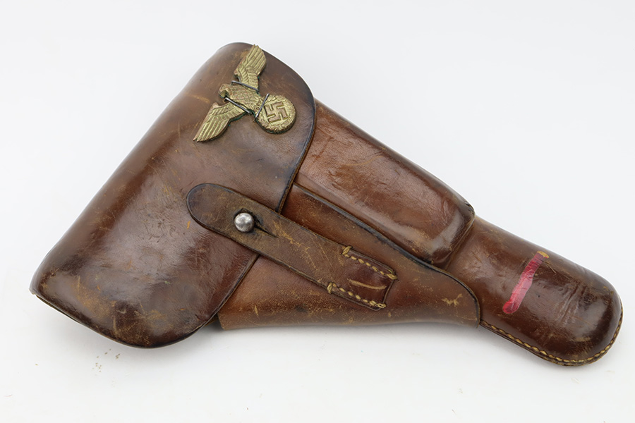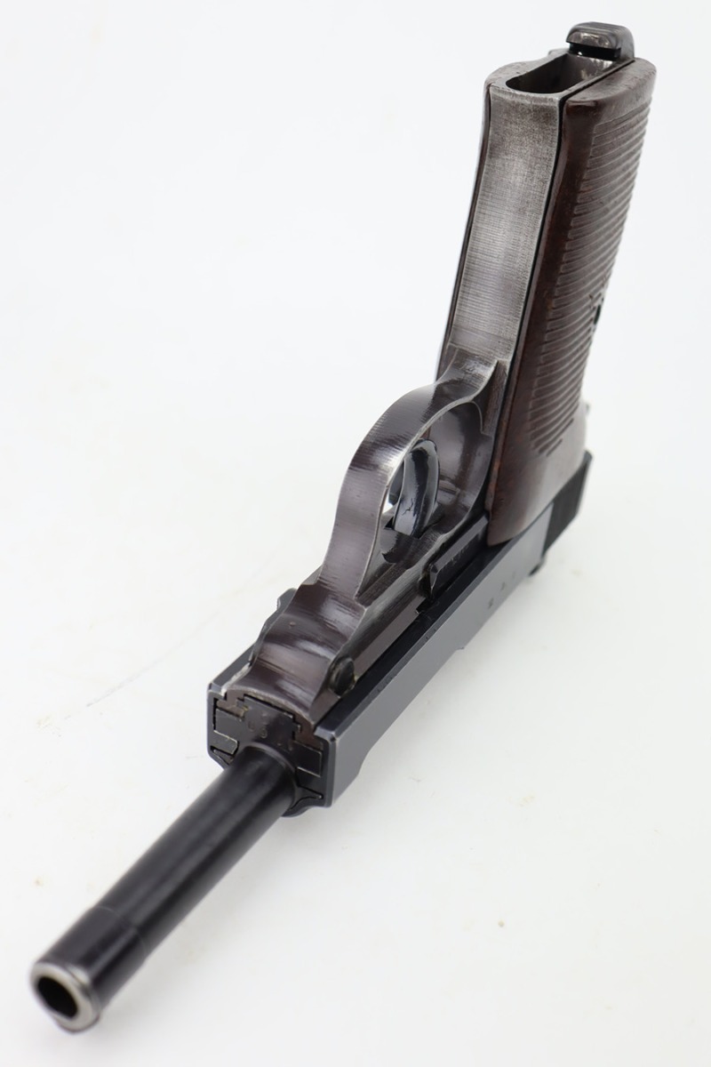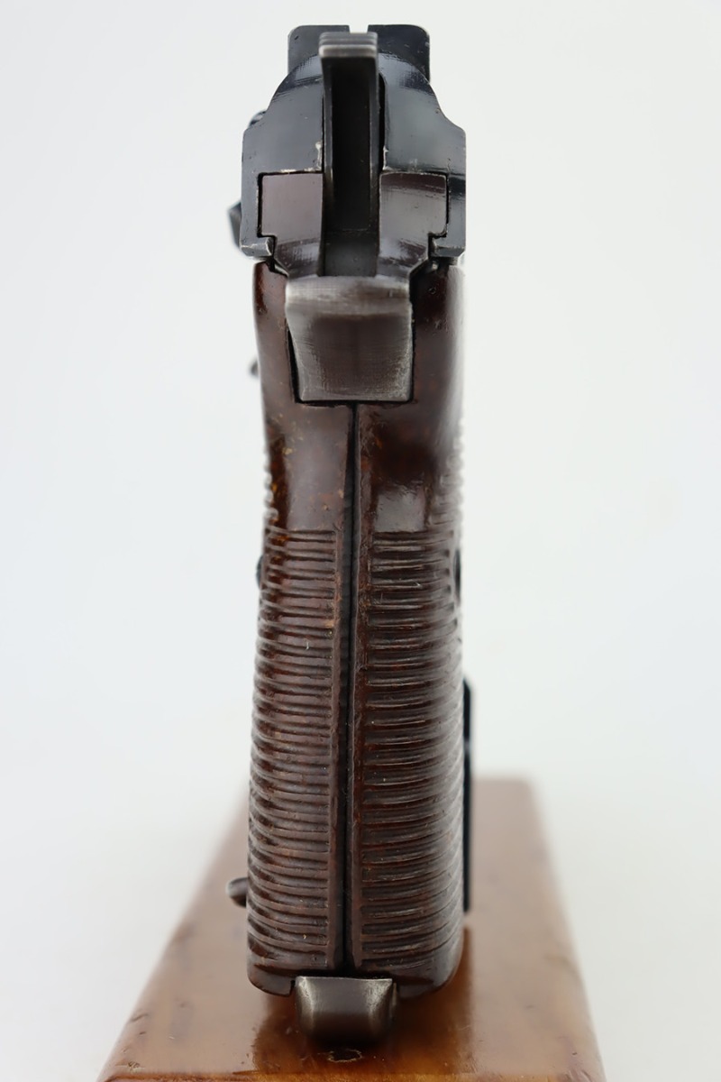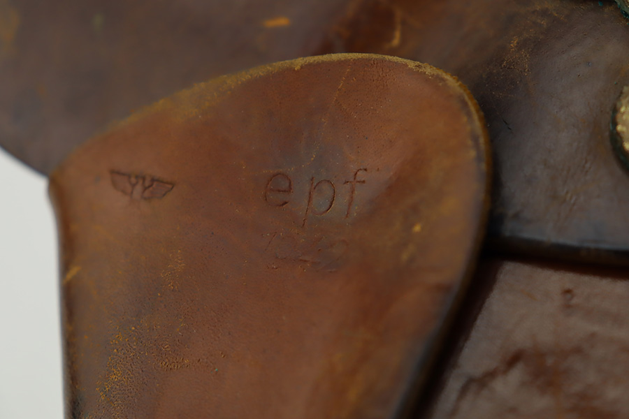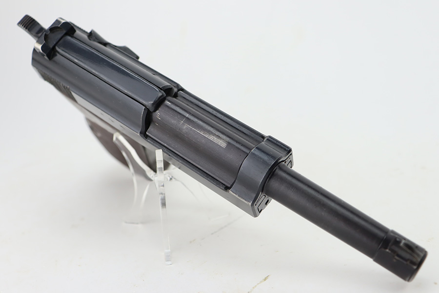 10/18/23 – This is a nice example of an AC 44 Walther P.38 issued to the Nazi military in 1944. All matching with the proper “Eagle 359” military proofs. It comes as a rig with a brown leather soft shell holster (embellished with a brass Nazi Eagle pin) and two period-correct “Eagle 359” marked Walther magazines. The gun itself has retained somewhere between 85-90% of its original finish. The majority of the wear is on the front strap, but there is also minor muzzle wear, and a couple of areas of thinning on the right side of the slide. Fitted with excellent reddish bakelite grips. The bore has strong rifling with very light pin-pricking in the grooves. De-cocker is functional.