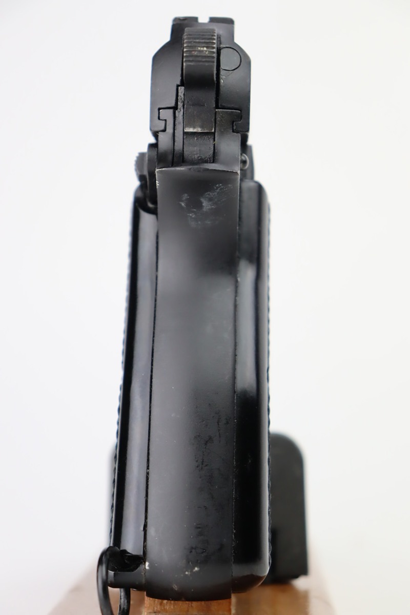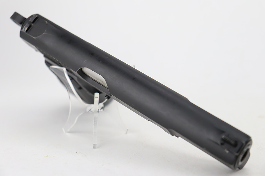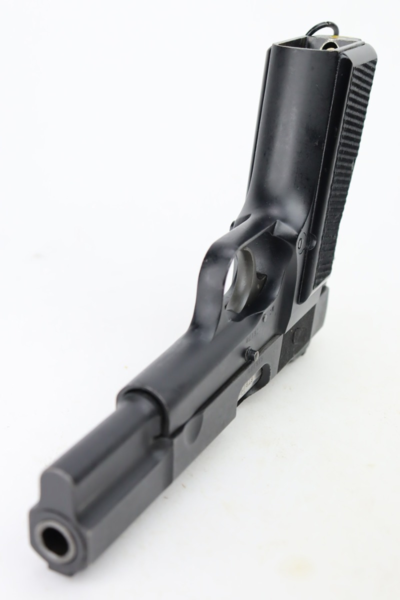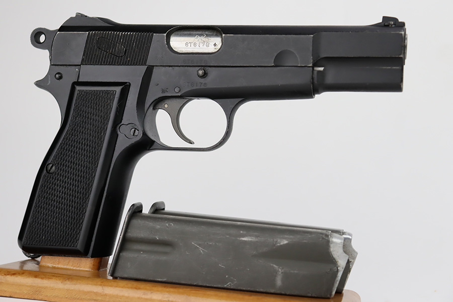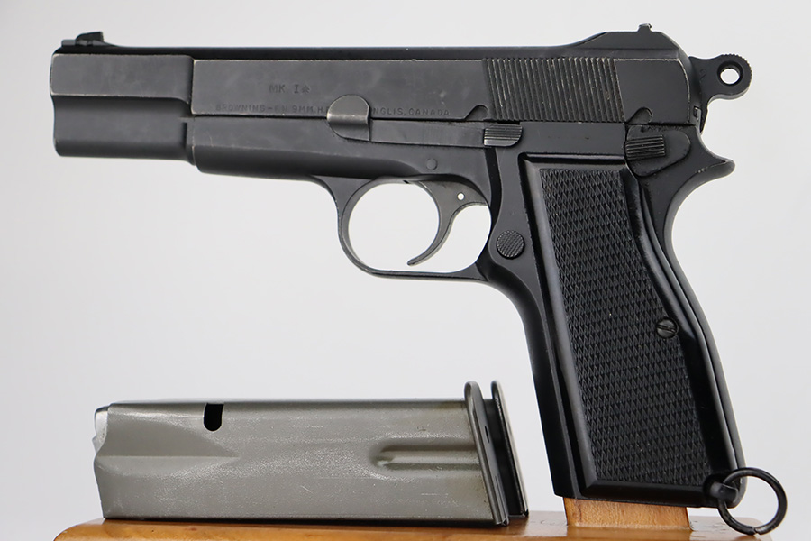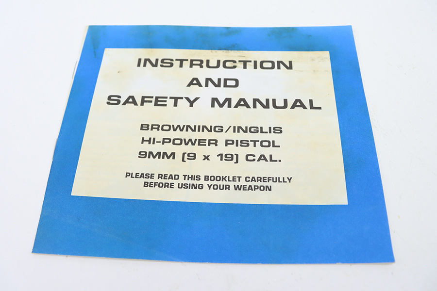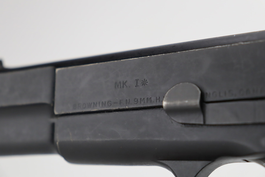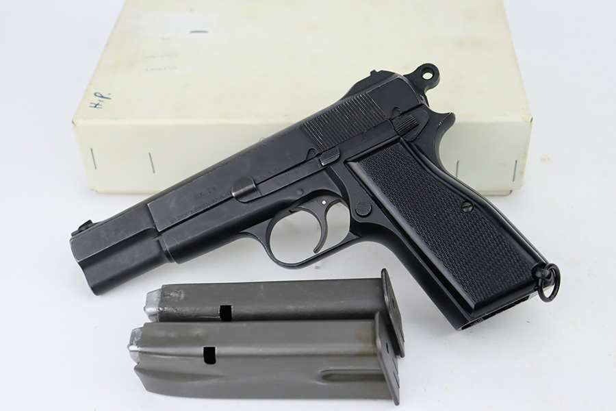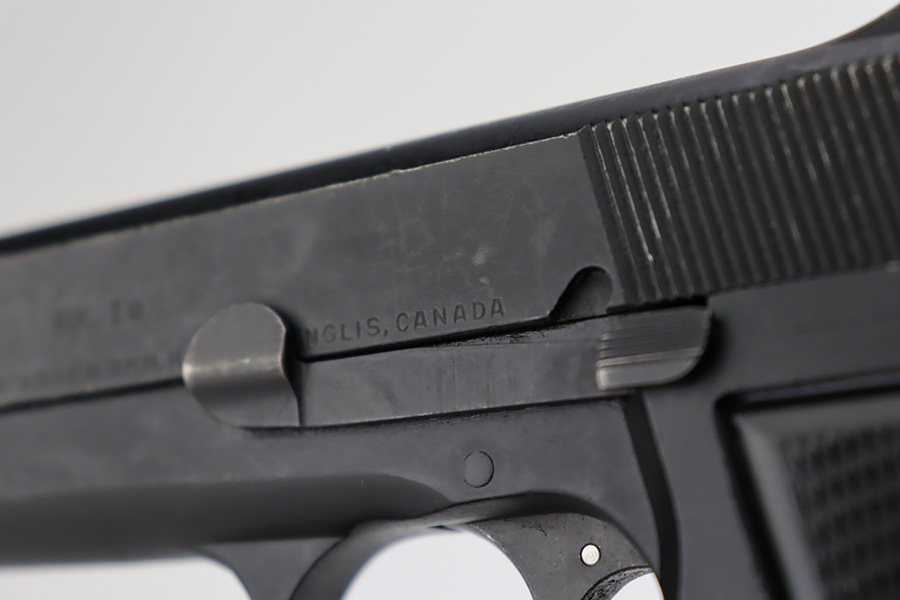 10/19/23 – This is a minty Inglis High Power issued to the Canadian military in about August of 1945. All matching with the proper proofs throughout. Tiny import mark on the left side of the frame, above the grip. There is a “3” rack number painted on the butt of the frame. It comes with a generic cardboard box, generic owners manual, and two proper magazines. The black enamel finish rates about 99% with just hints of high edge wear and very light surface scuffs throughout. The bore has good rifling, but there is pin-pricking throughout.
